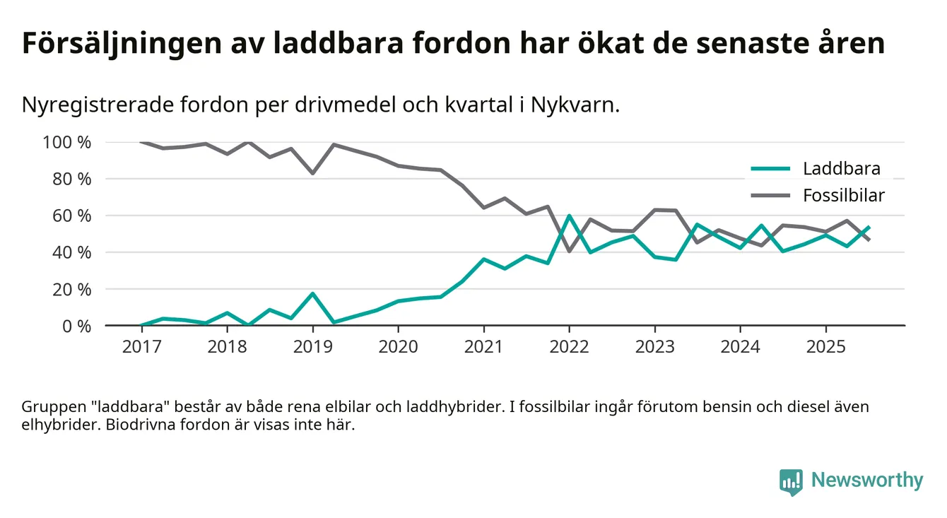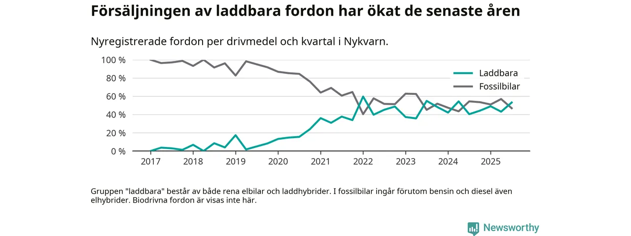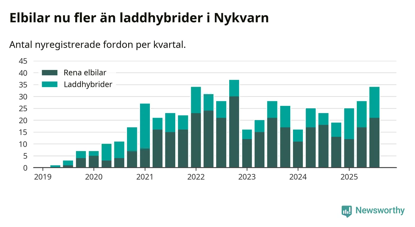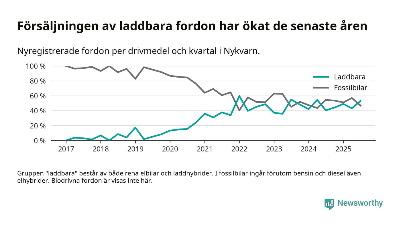 Under tredje kvartalet var hälften av alla nyregistrerade bilar i Nykvarns kommun rena elbilar eller laddhybrider, en ökning jämfört med kvartalet innan. I riket däremot minskade andelen laddbara bilar något. Framför allt elbilsförsäljningen har tappat fart.