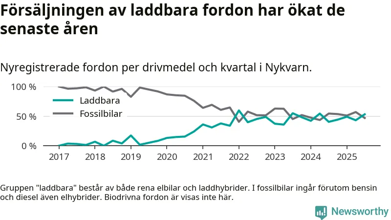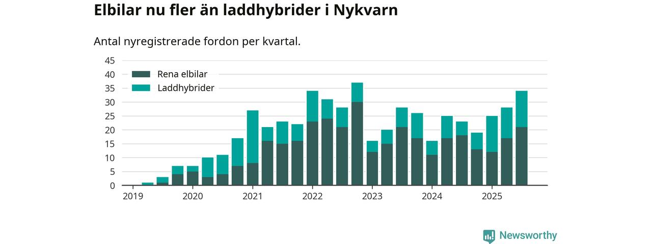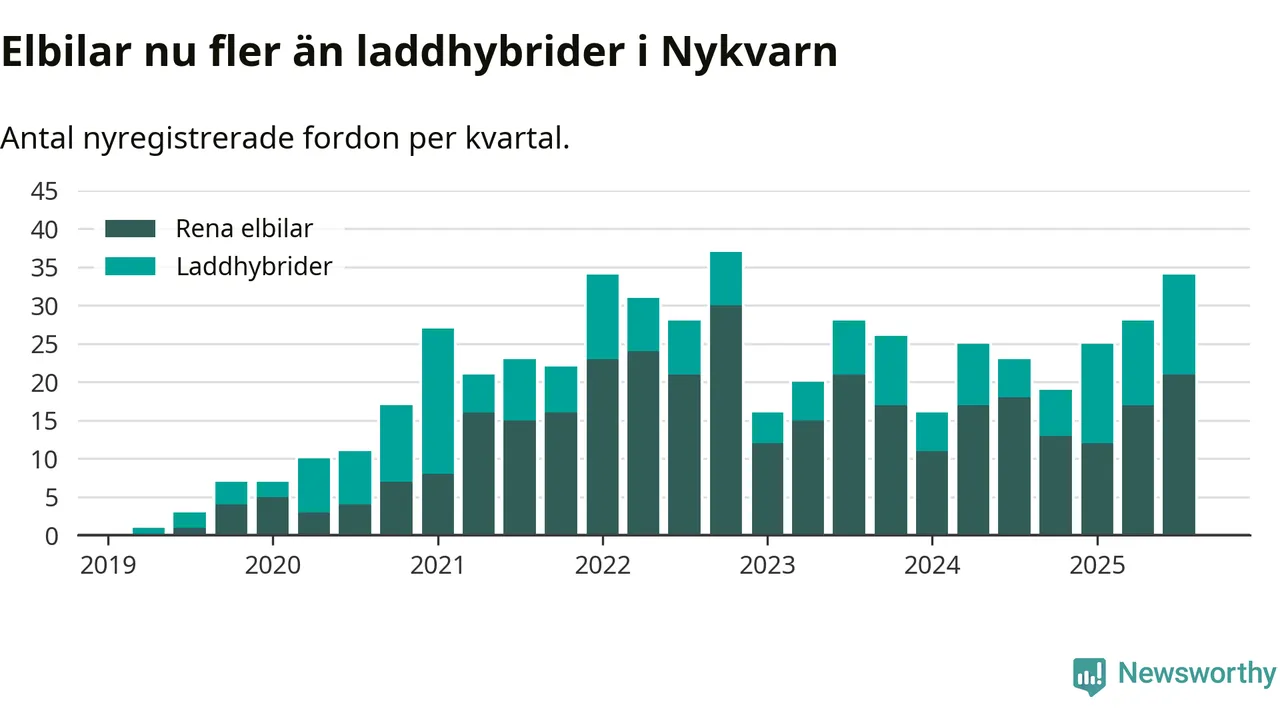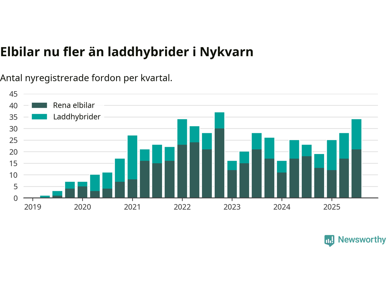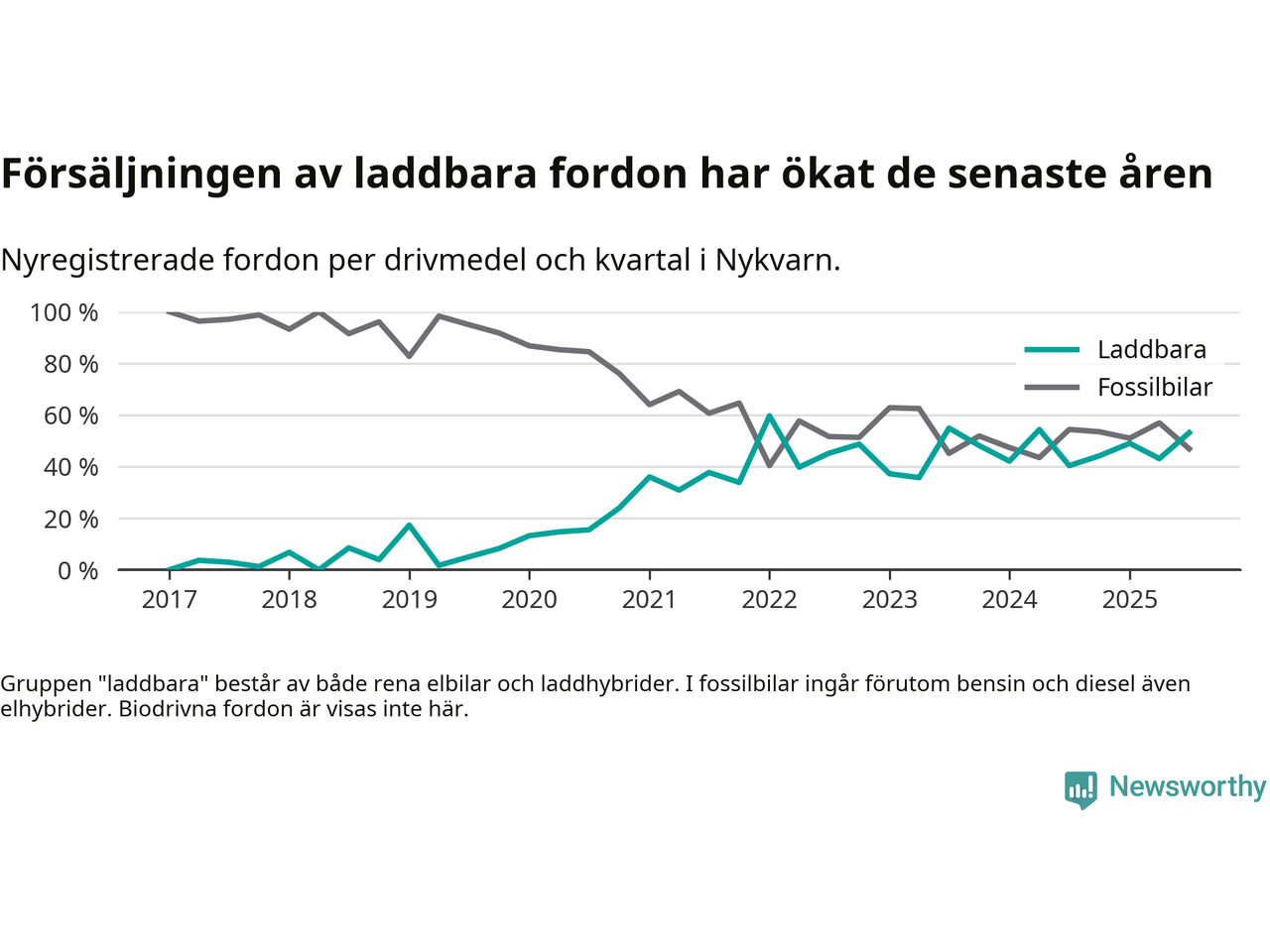 Under tredje kvartalet var hälften av alla nyregistrerade bilar i Nykvarns kommun rena elbilar eller laddhybrider, en ökning jämfört med kvartalet innan. I riket däremot minskade andelen laddbara bilar något. Framför allt elbilsförsäljningen har tappat fart.