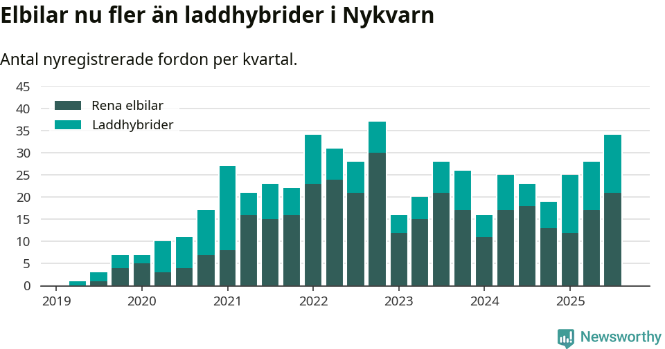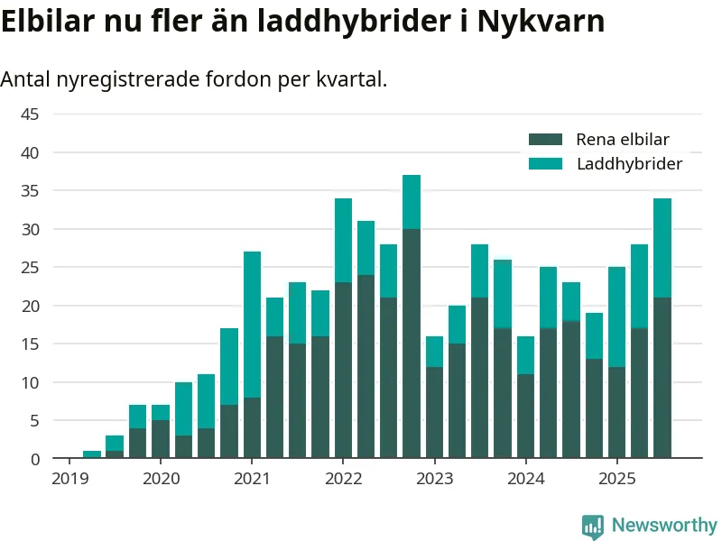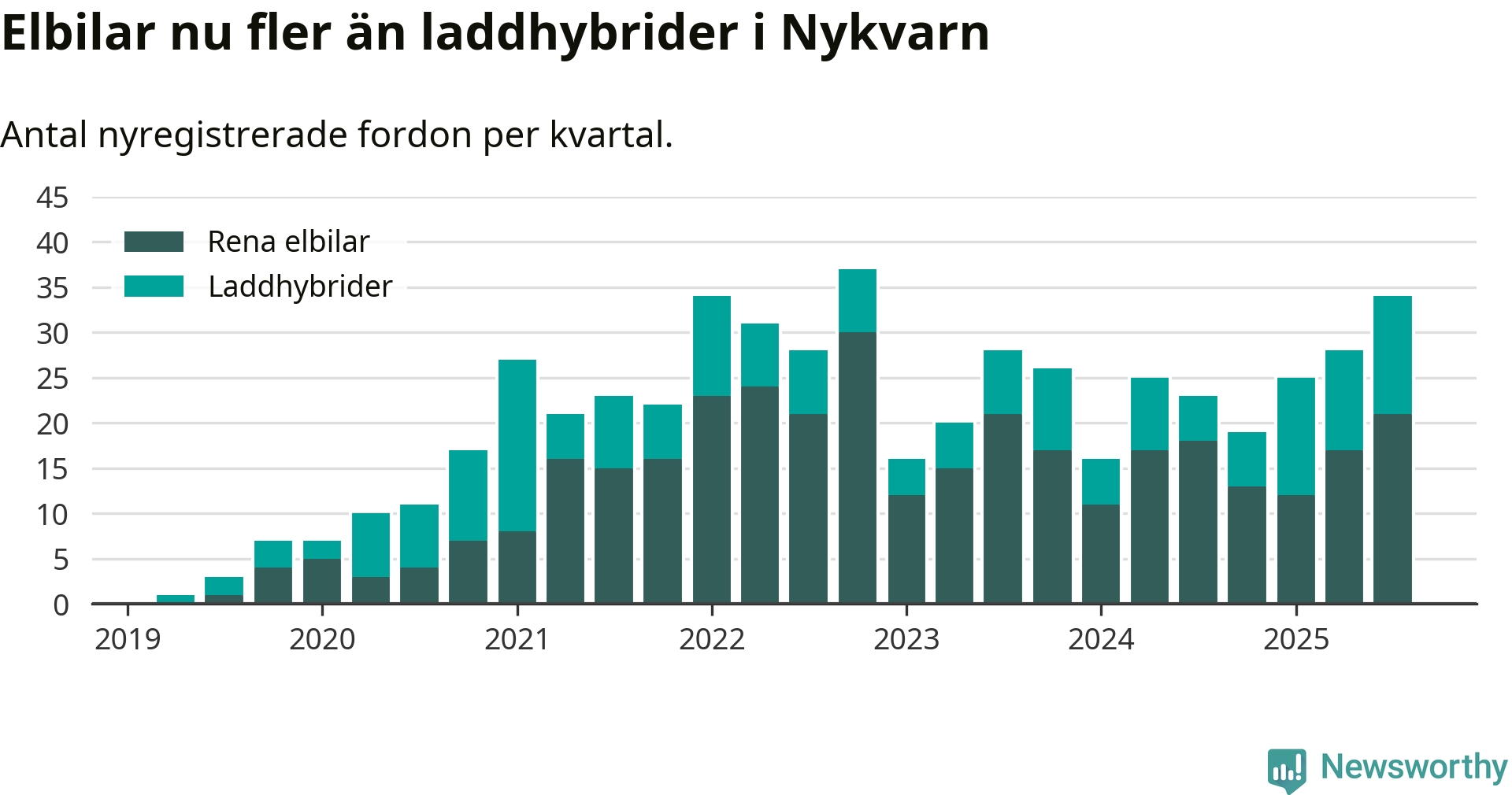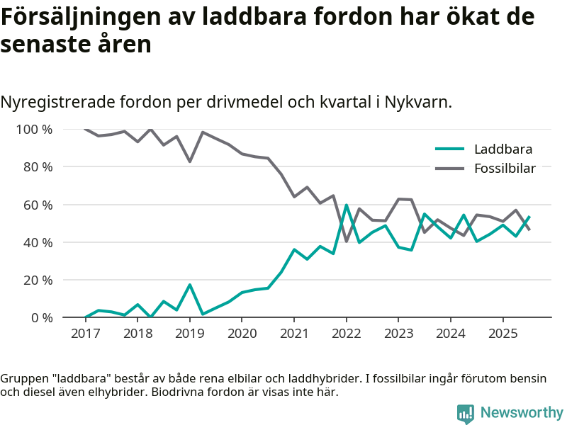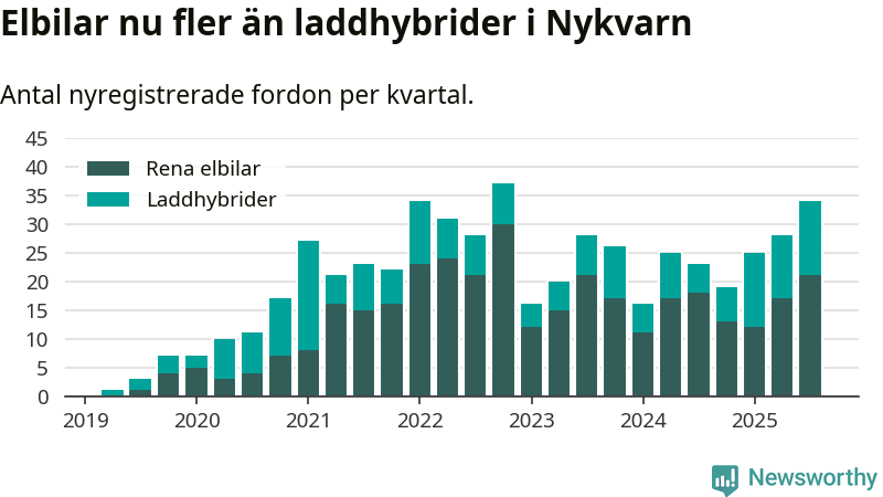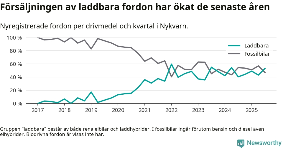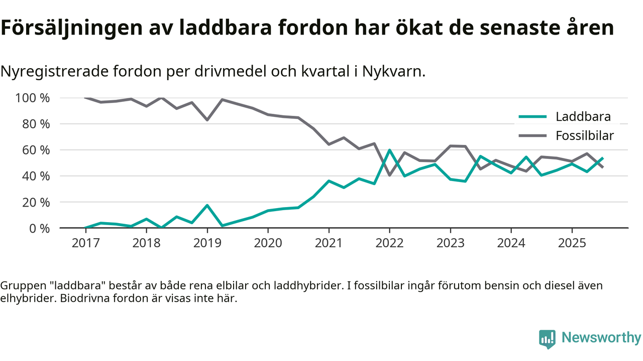 Under tredje kvartalet var hälften av alla nyregistrerade bilar i Nykvarns kommun rena elbilar eller laddhybrider, en ökning jämfört med kvartalet innan. I riket däremot minskade andelen laddbara bilar något. Framför allt elbilsförsäljningen har tappat fart.