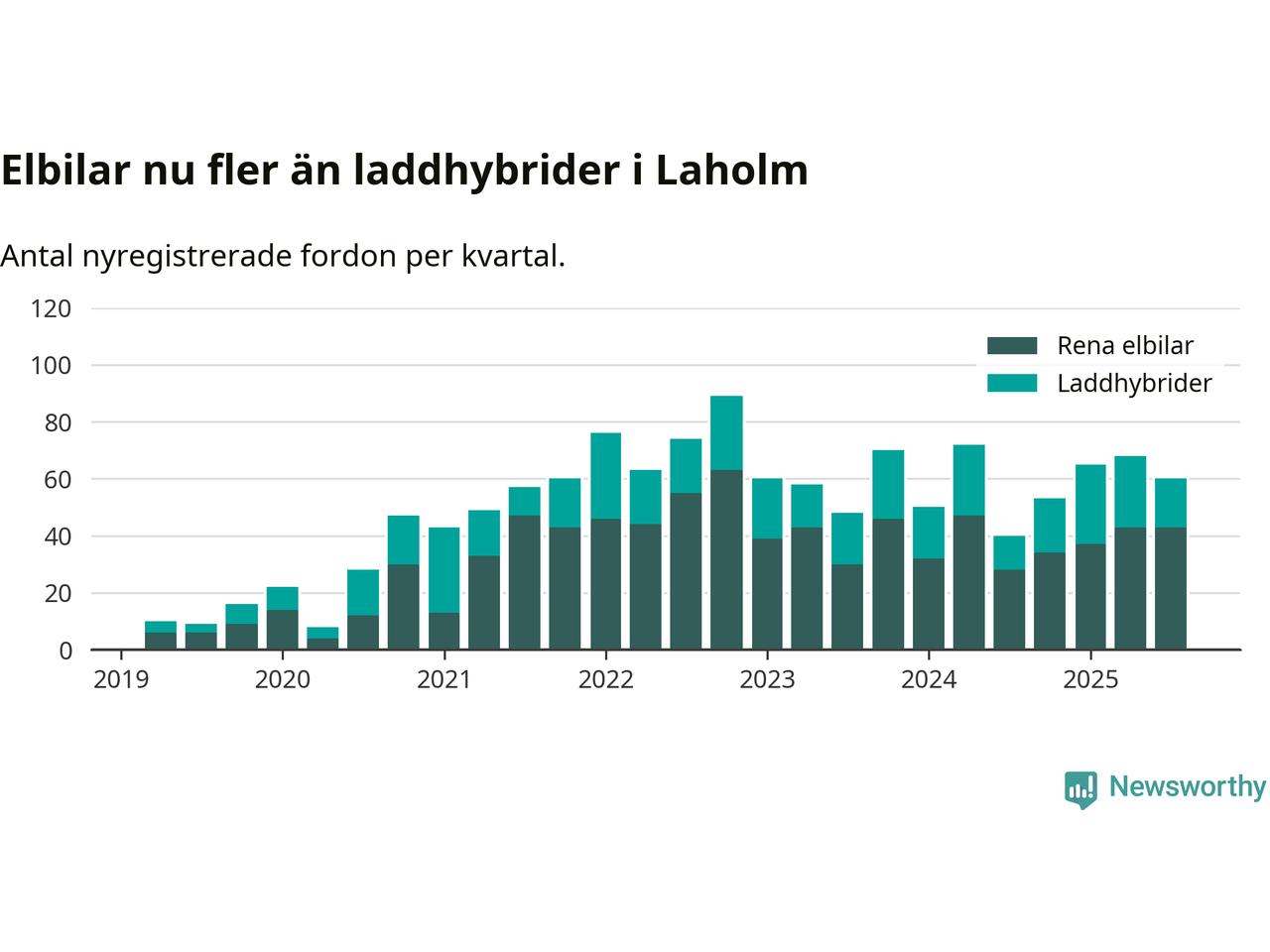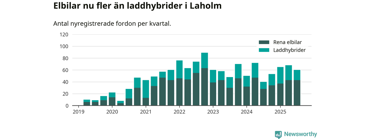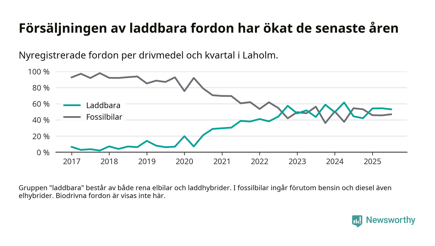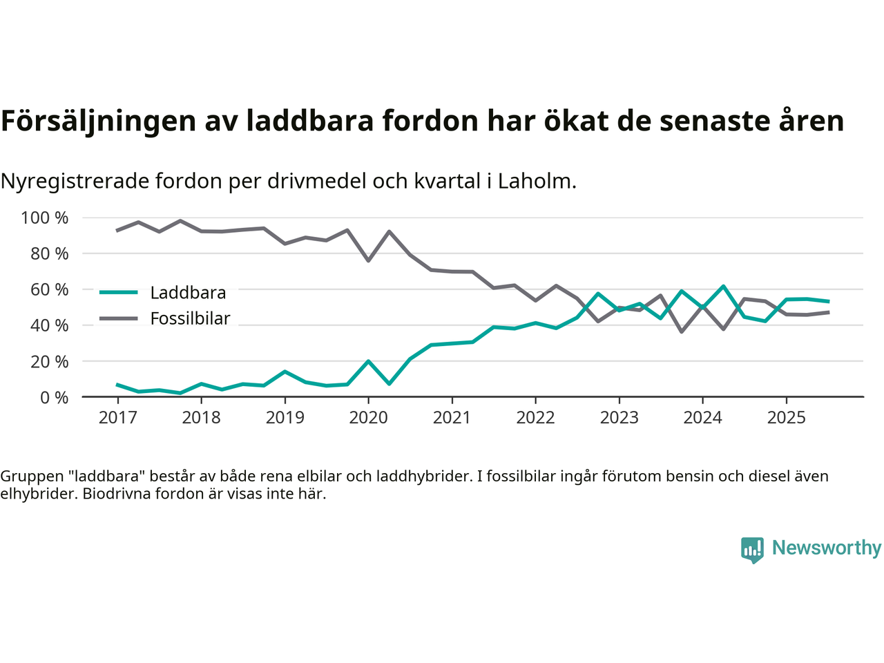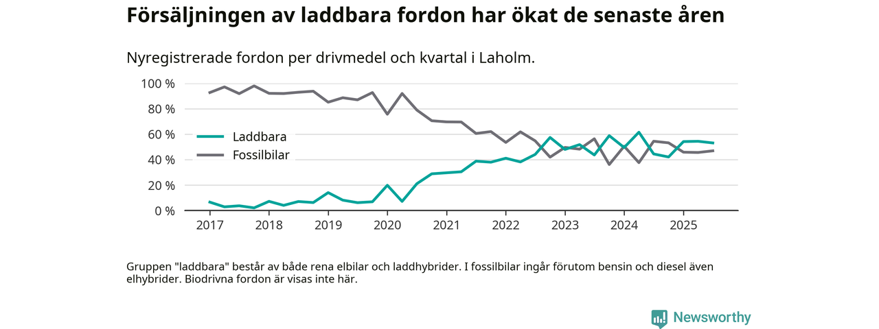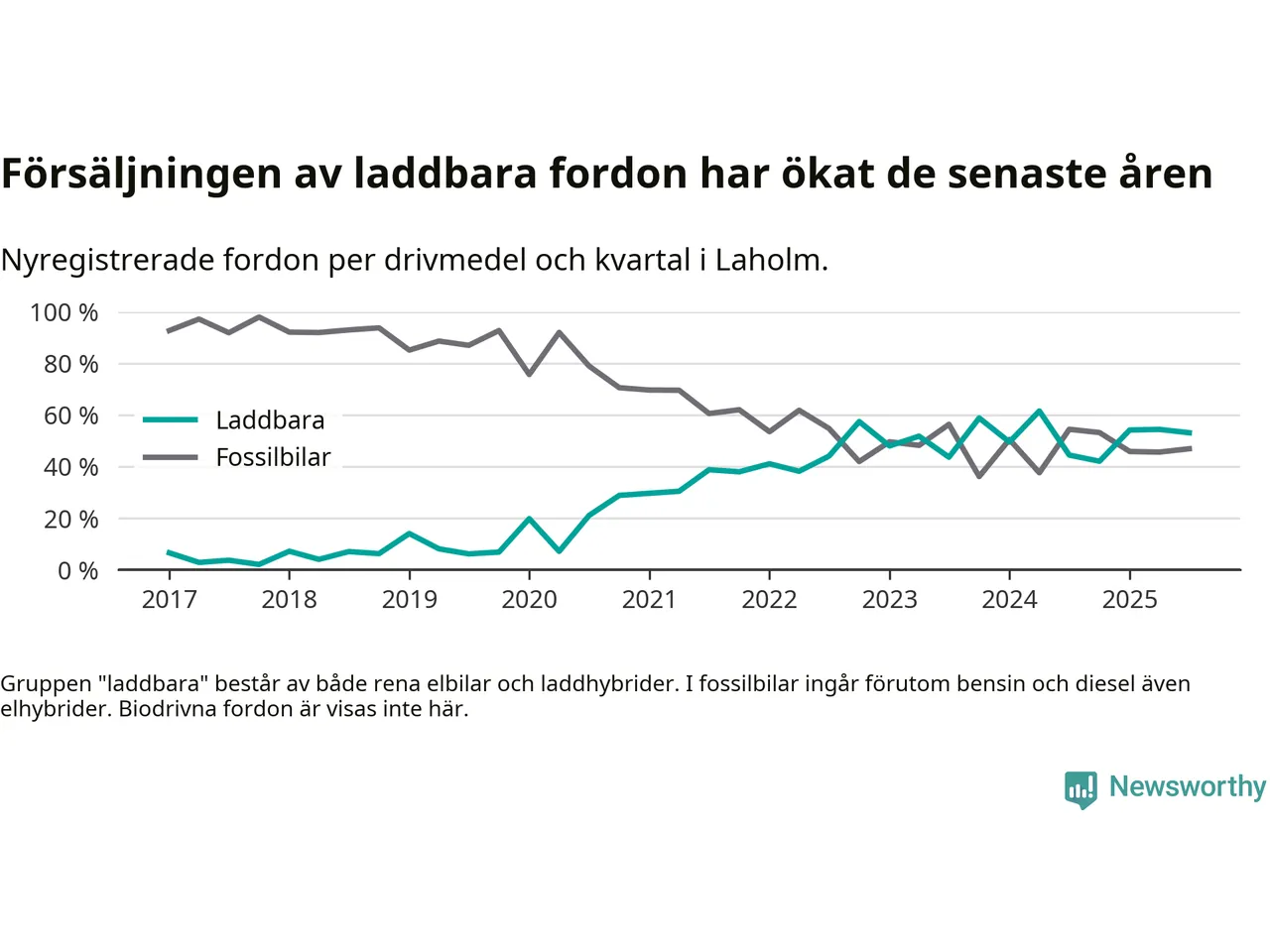 Under tredje kvartalet 2025 var 53 procent av alla nyregistrerade personbilar i Laholm laddbara (sammanlagt registrerades 113 nya bilar). Merparten av de laddbara bilarna var rena elbilar (38 procent av alla).