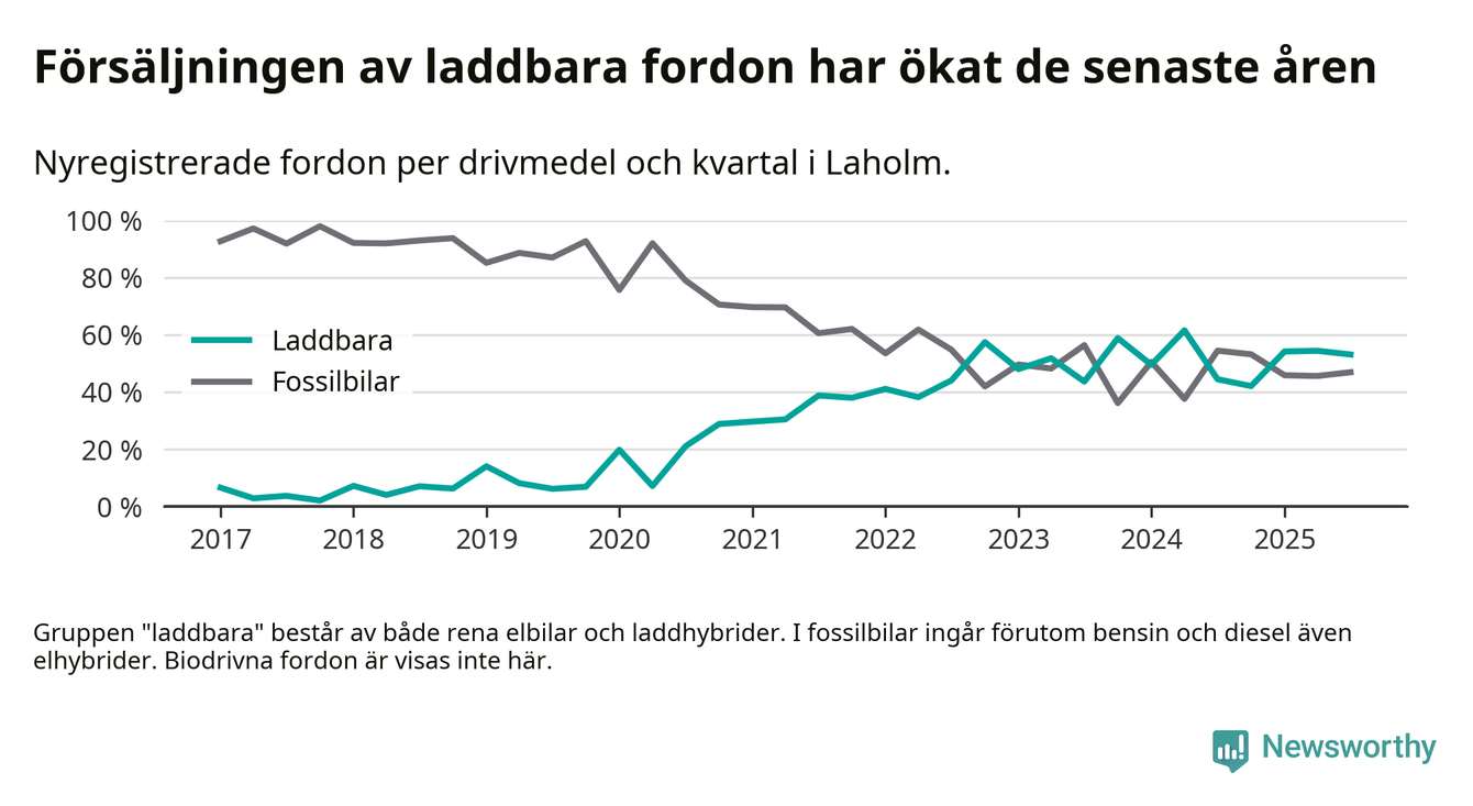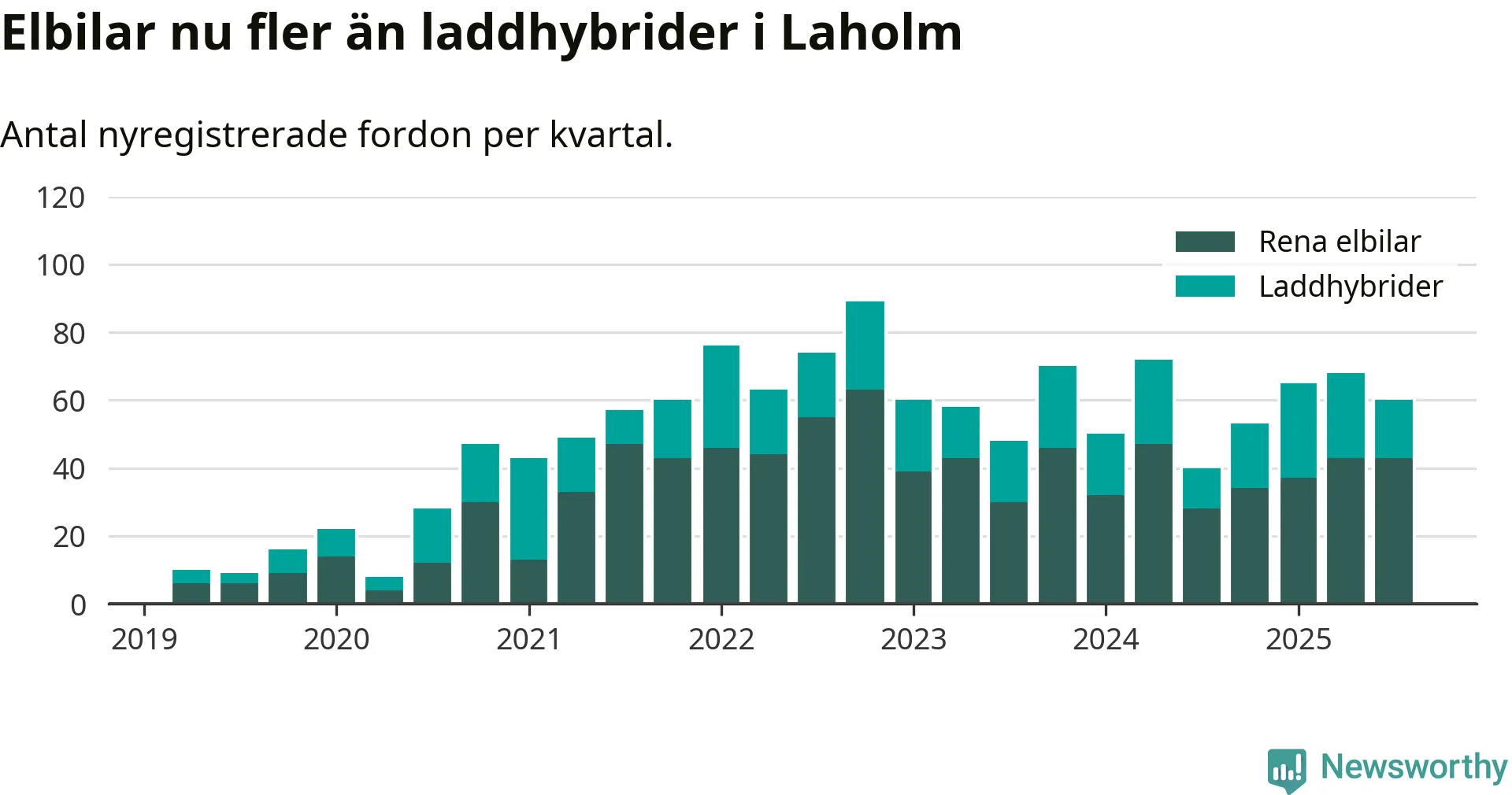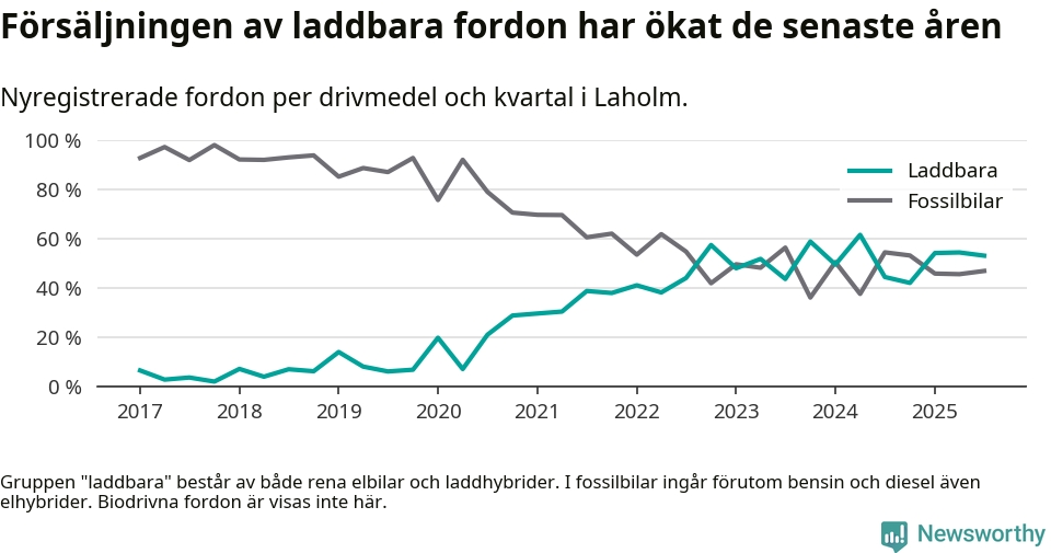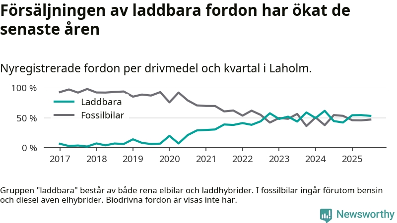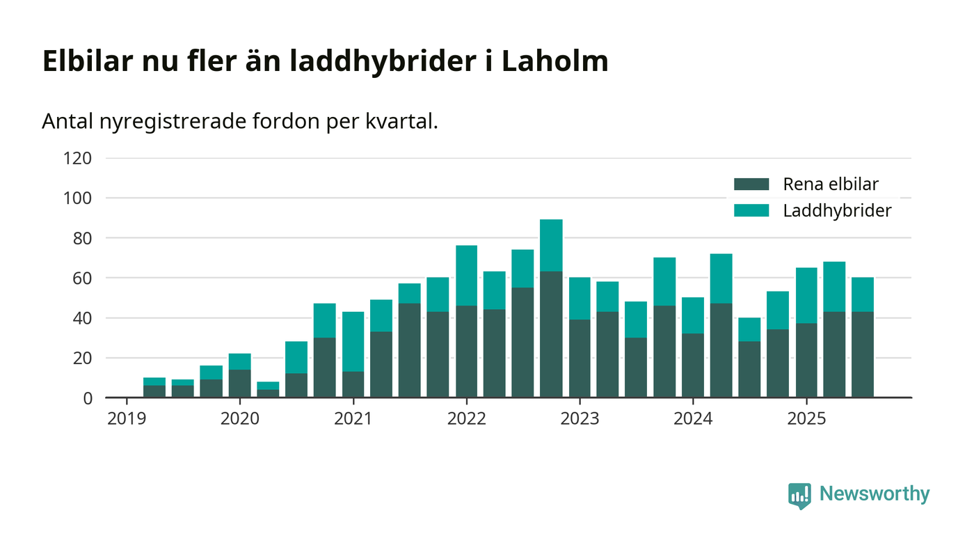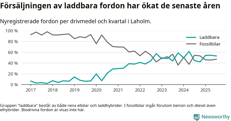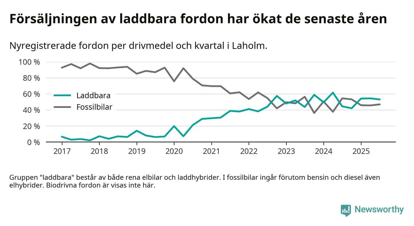 Under tredje kvartalet 2025 var 53 procent av alla nyregistrerade personbilar i Laholm laddbara (sammanlagt registrerades 113 nya bilar). Merparten av de laddbara bilarna var rena elbilar (38 procent av alla).