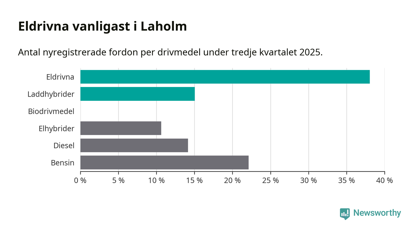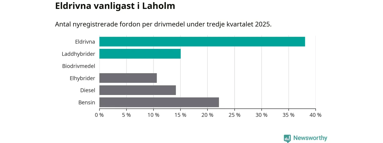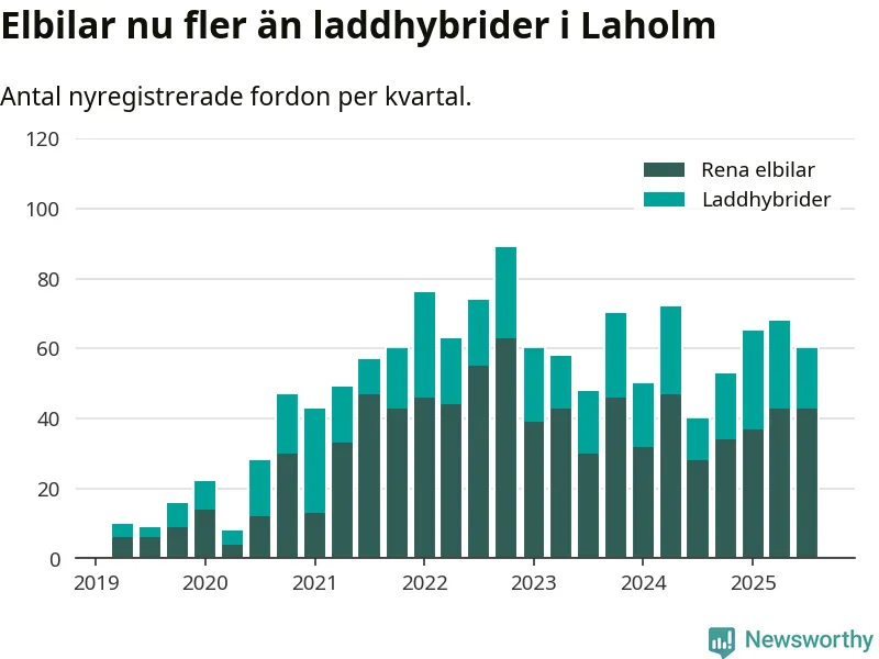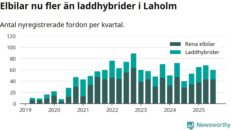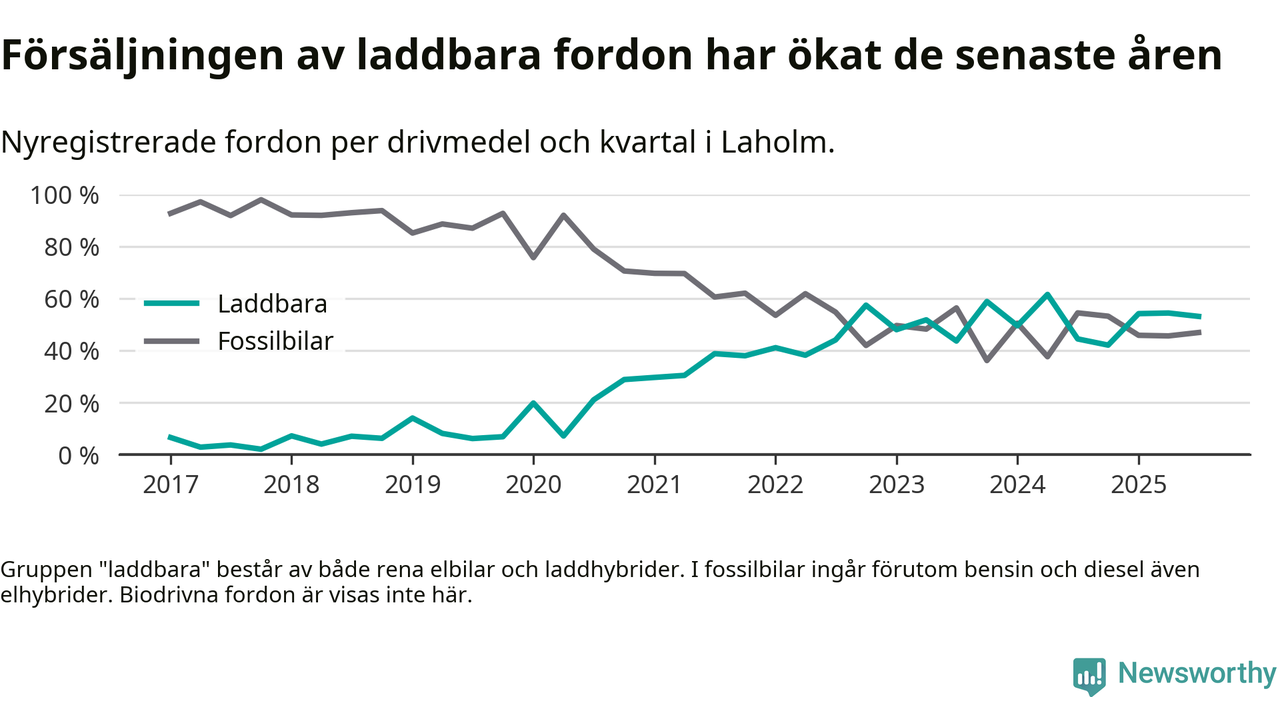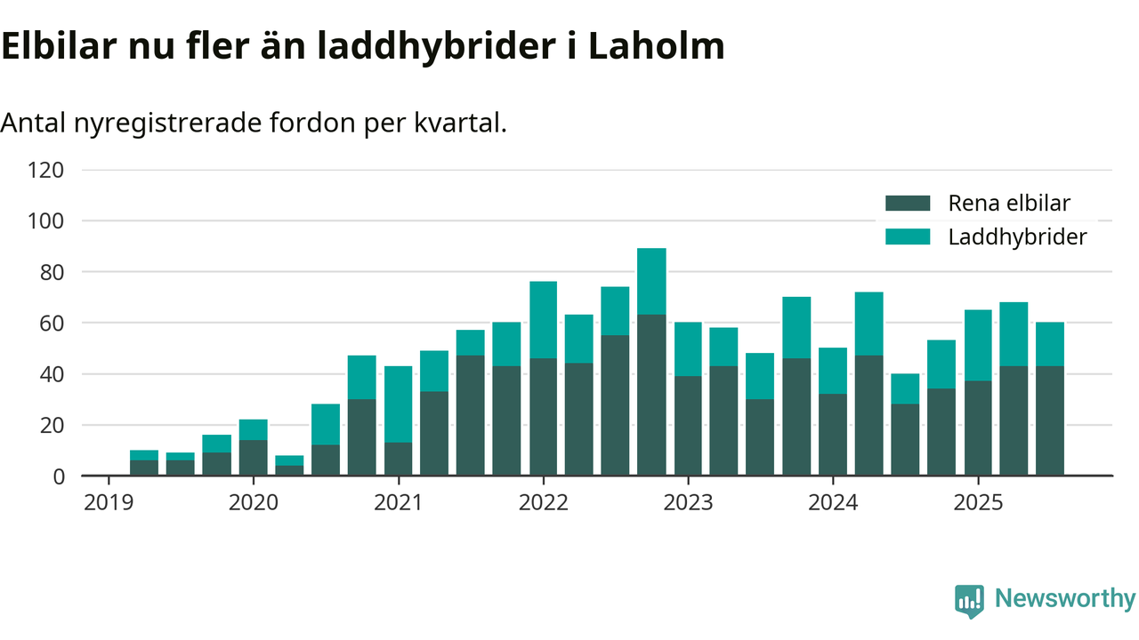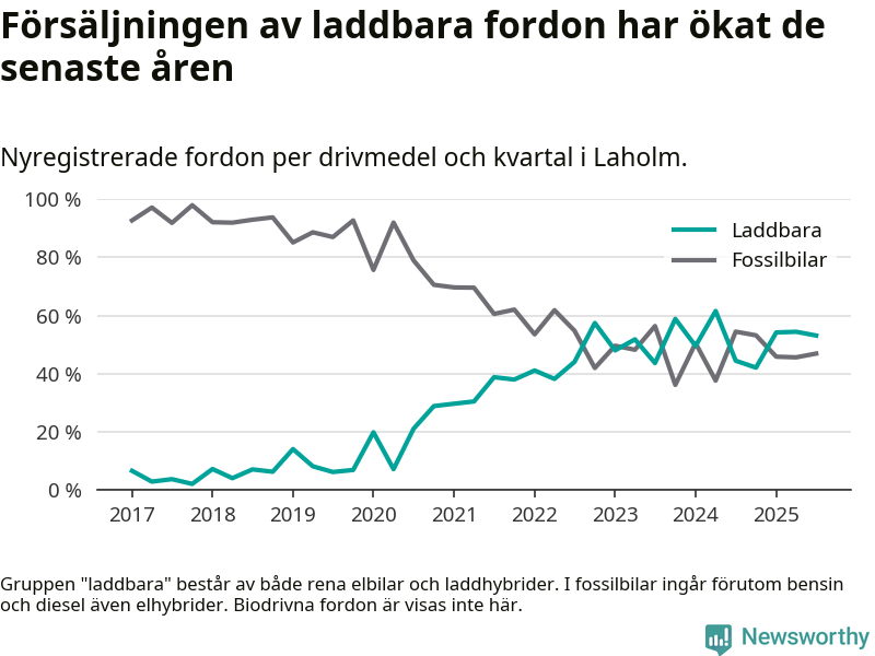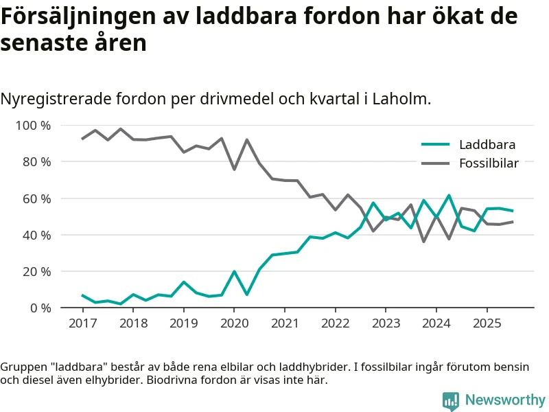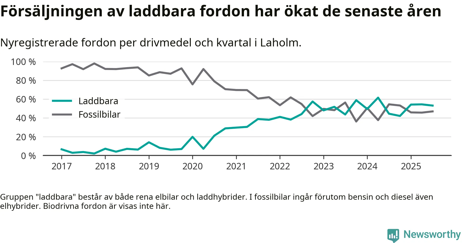 Under tredje kvartalet 2025 var 53 procent av alla nyregistrerade personbilar i Laholm laddbara (sammanlagt registrerades 113 nya bilar). Merparten av de laddbara bilarna var rena elbilar (38 procent av alla).