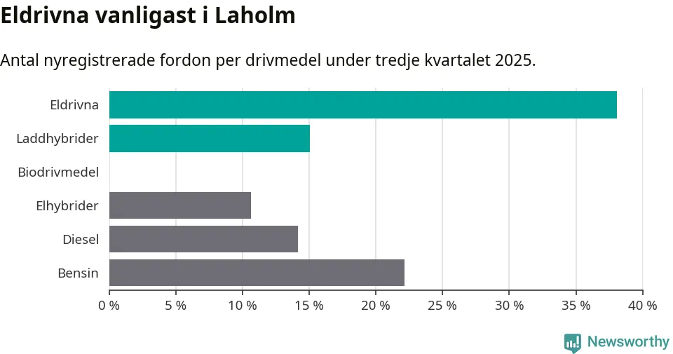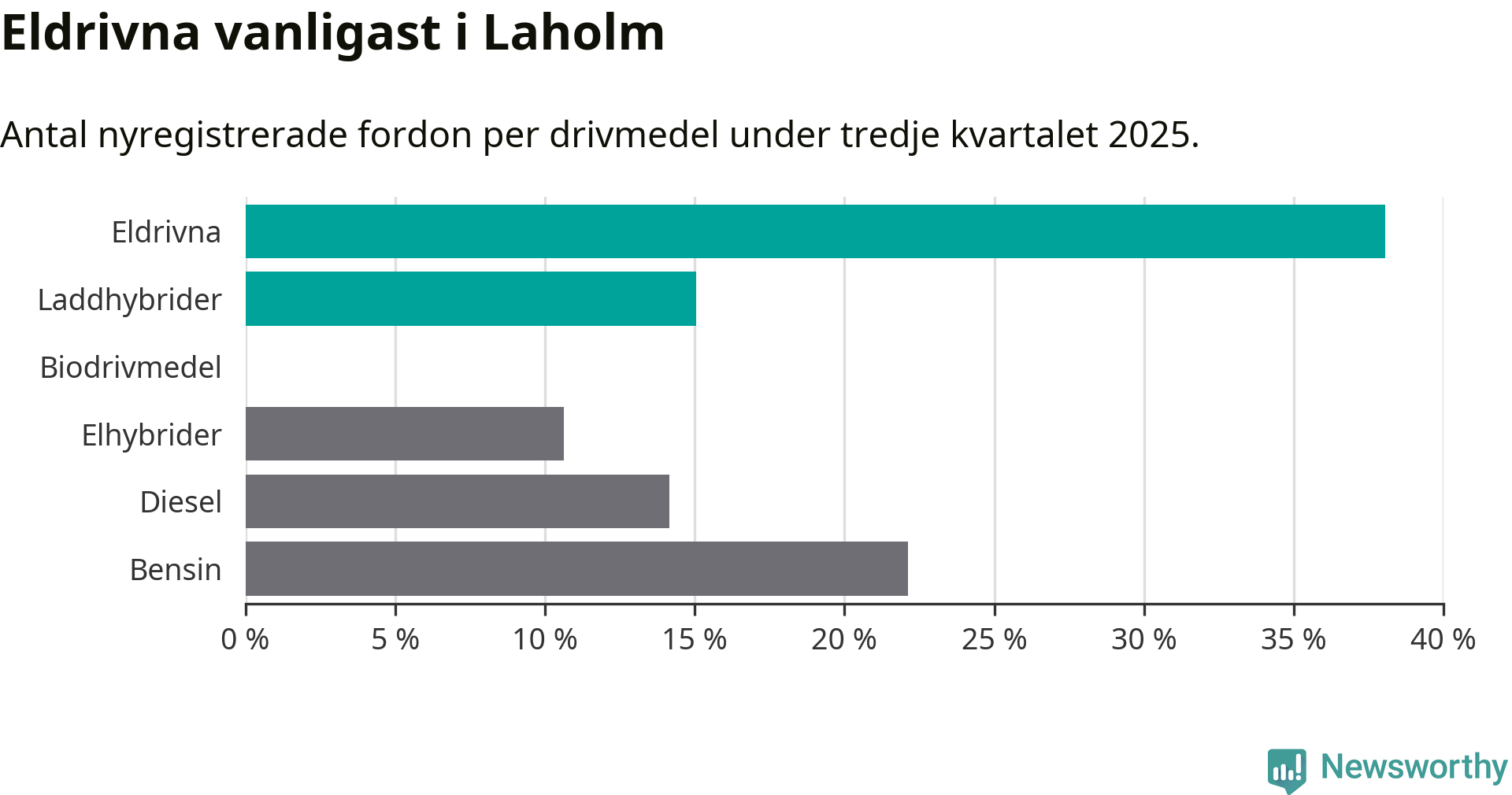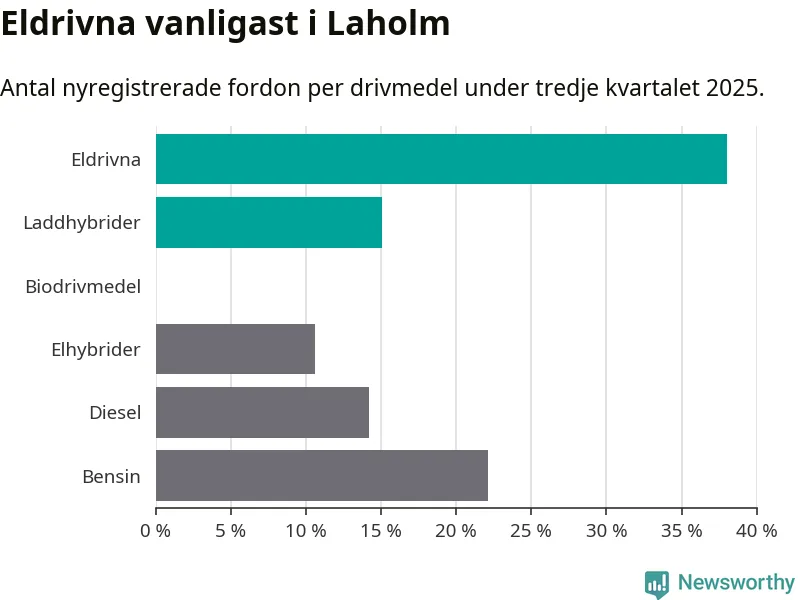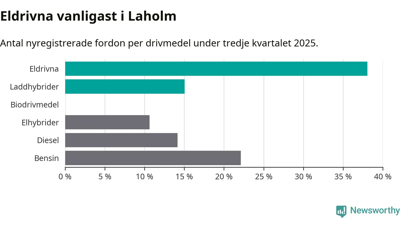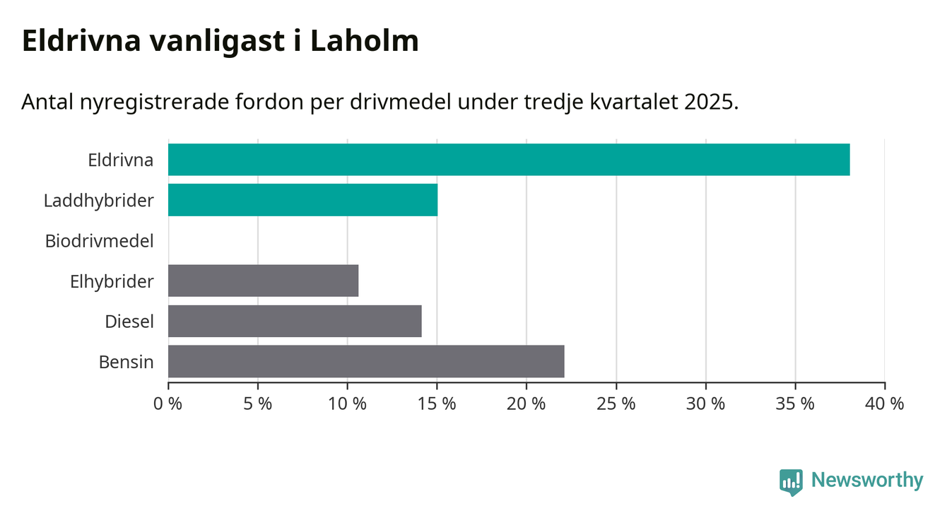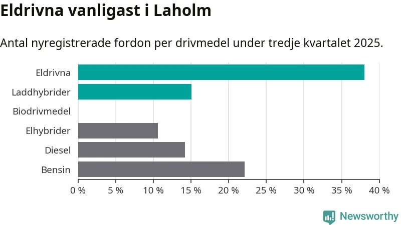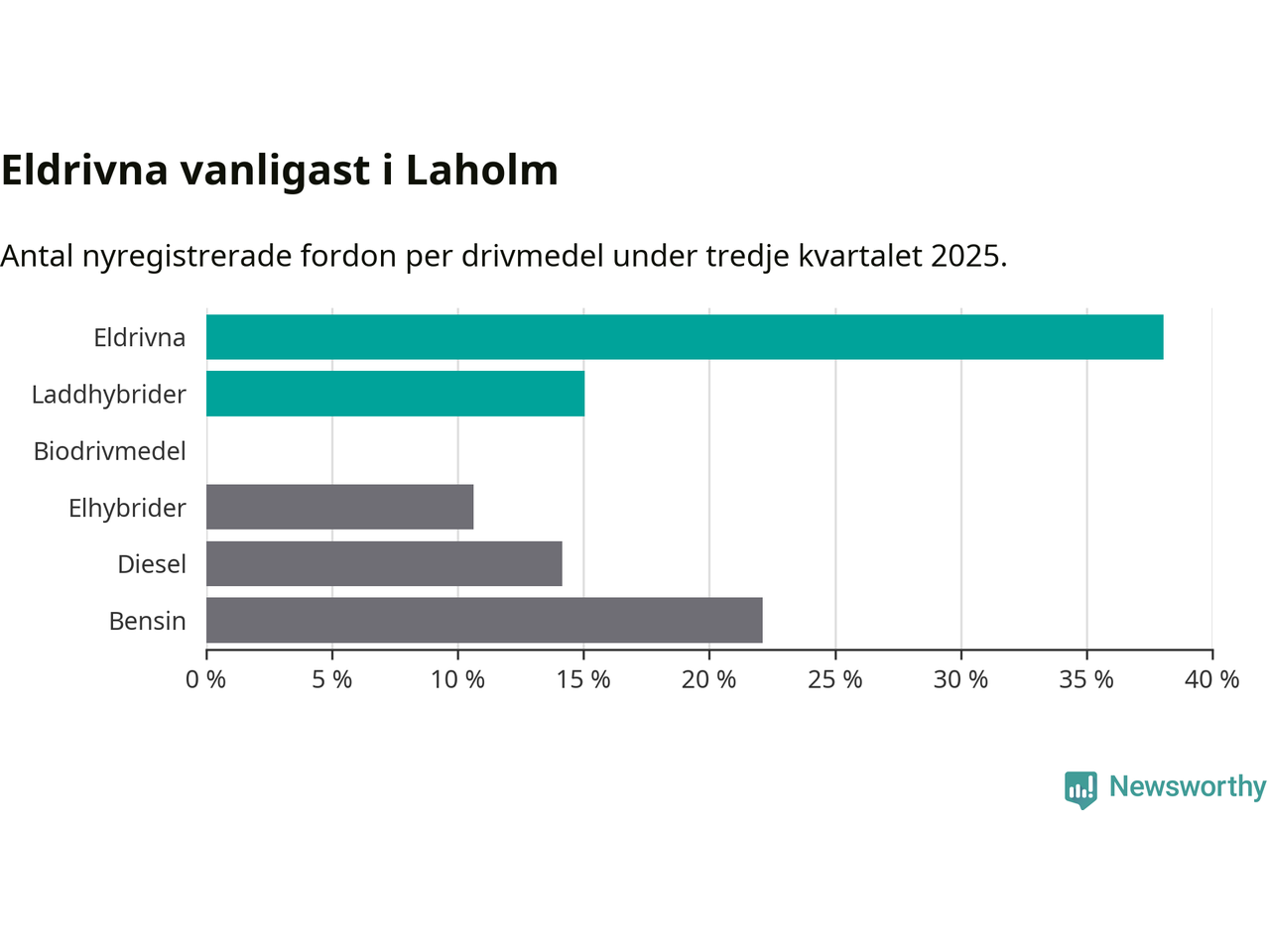 Under tredje kvartalet 2025 var 53 procent av alla nyregistrerade personbilar i Laholm laddbara (sammanlagt registrerades 113 nya bilar). Merparten av de laddbara bilarna var rena elbilar (38 procent av alla).