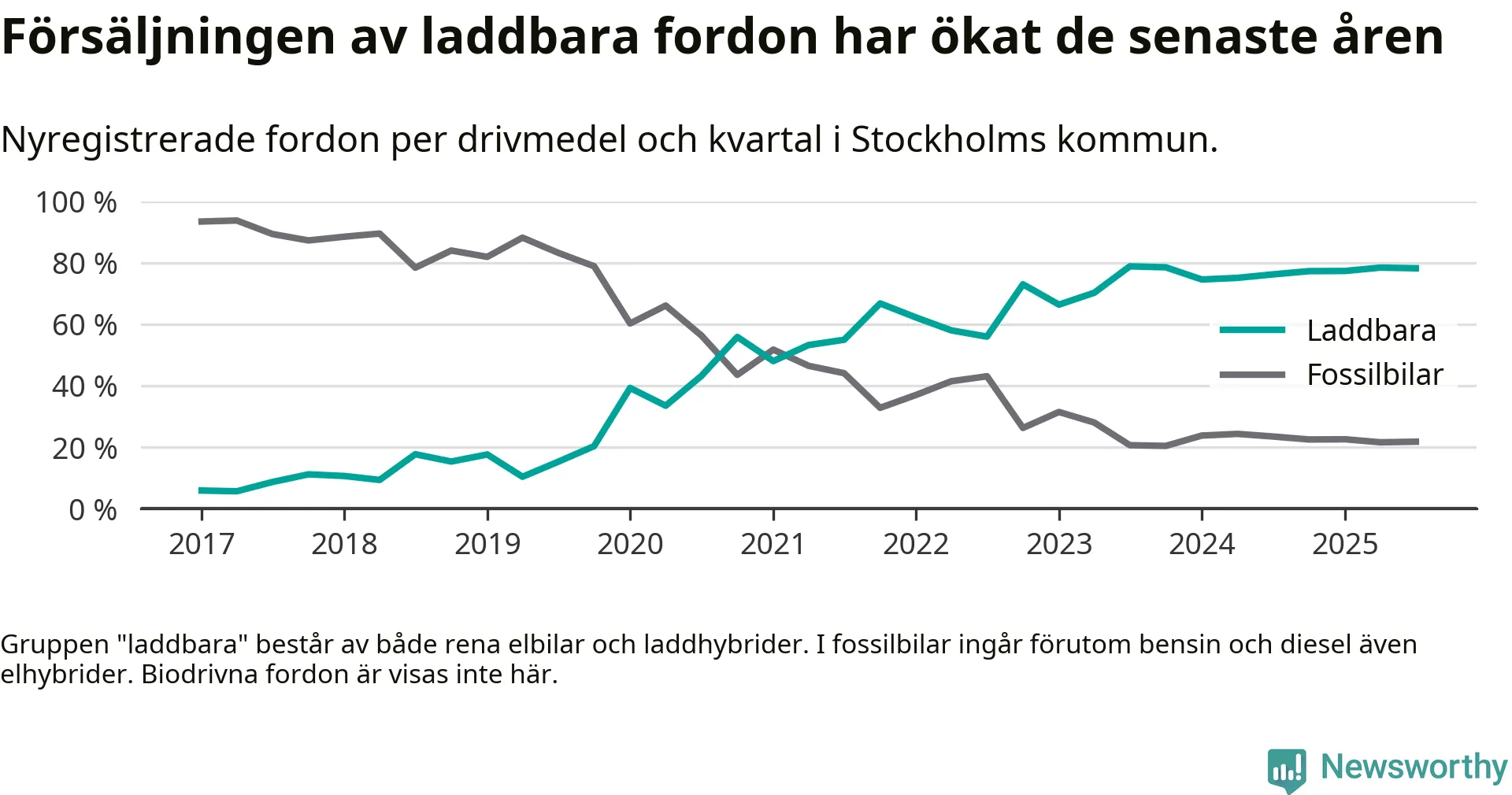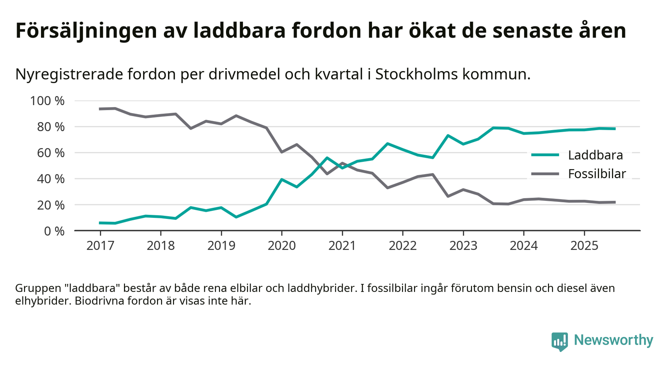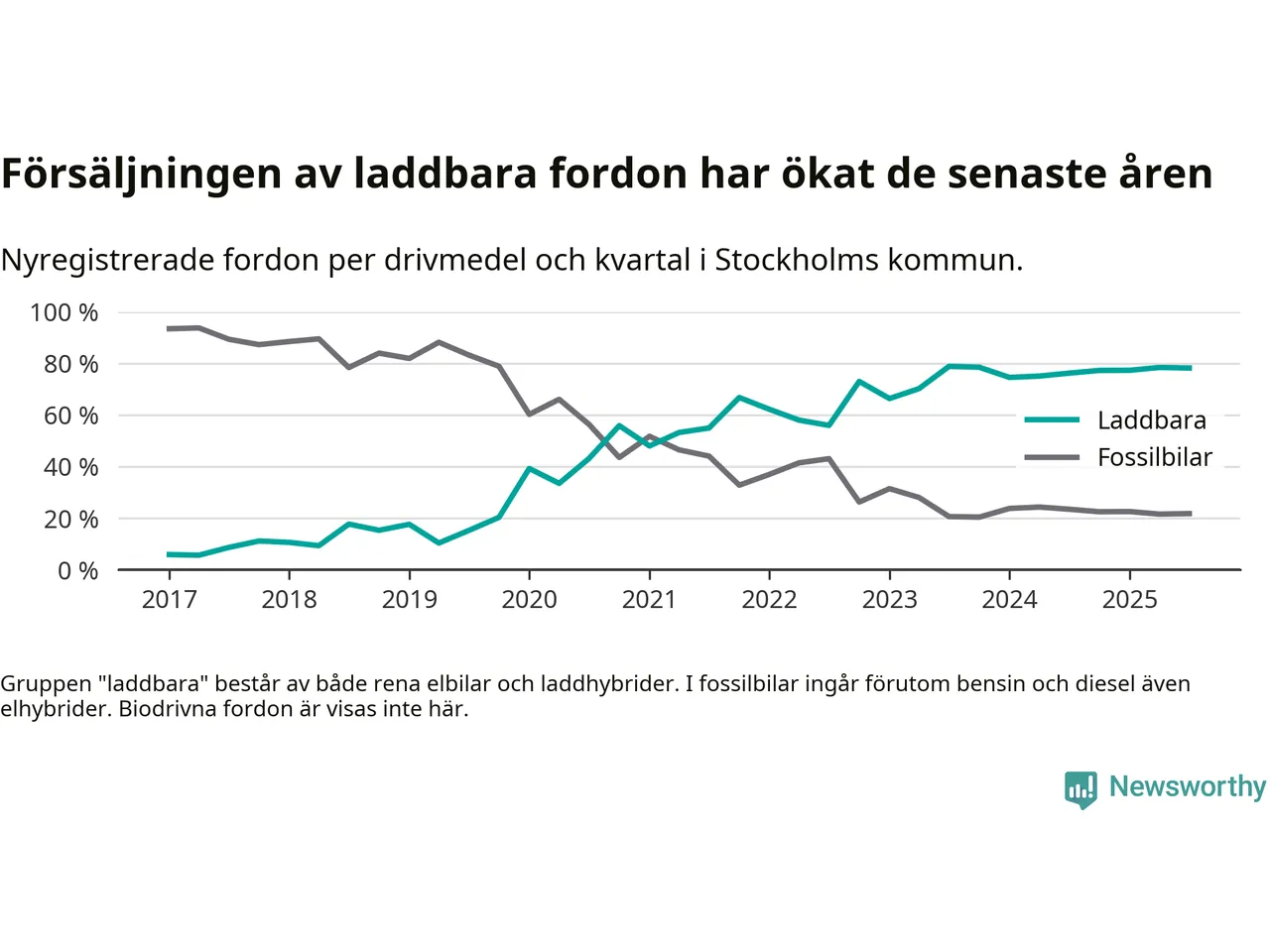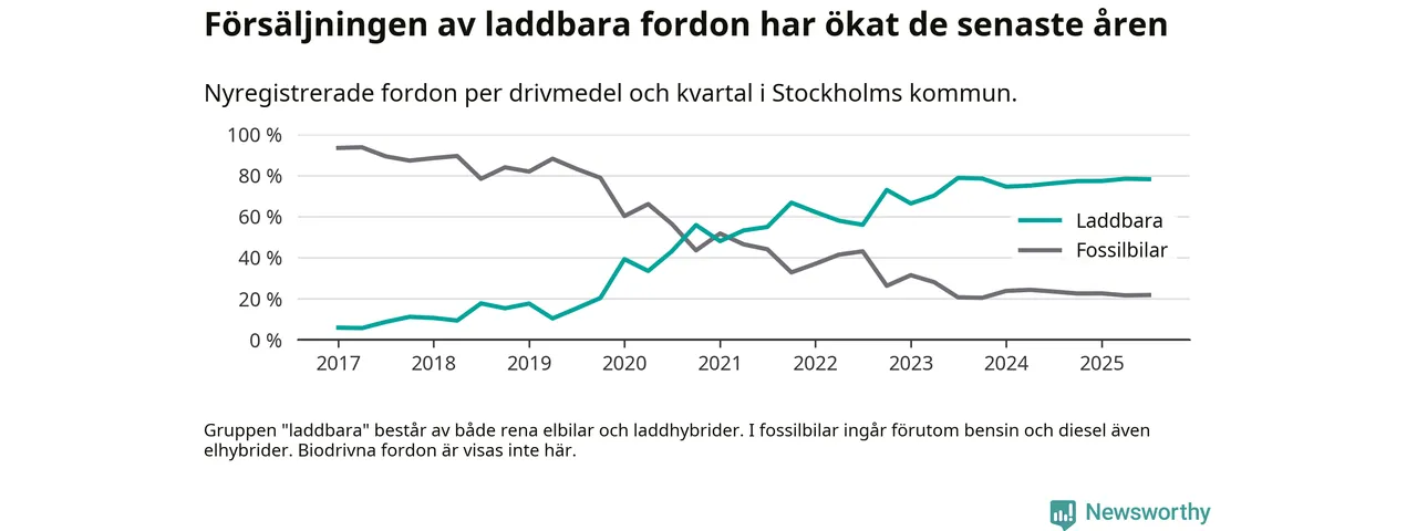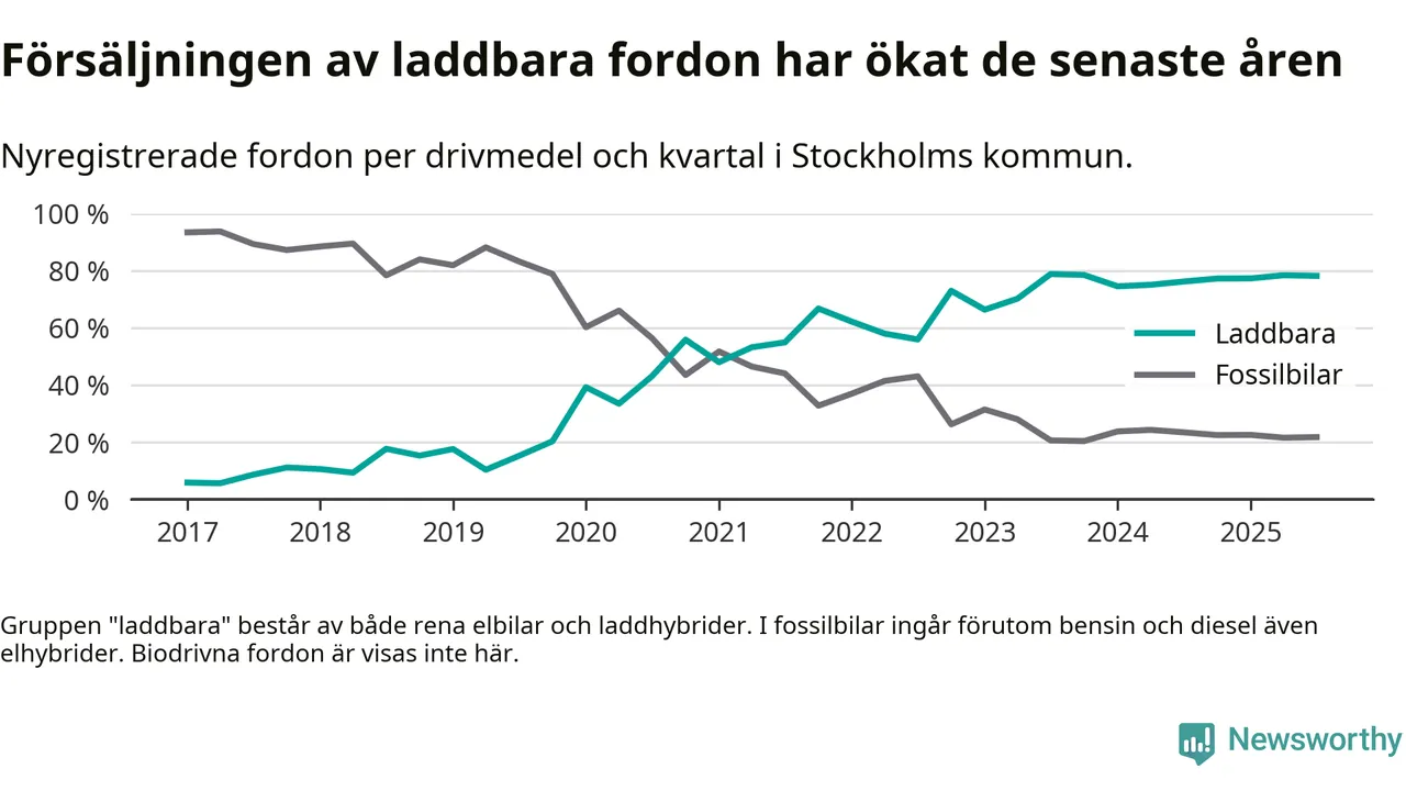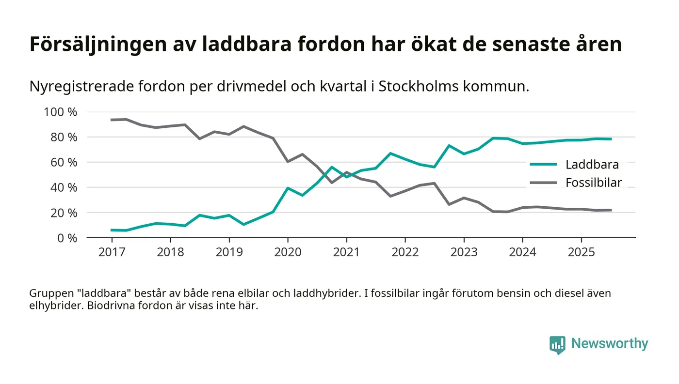 Under tredje kvartalet 2025 var 78 procent av alla nyregistrerade personbilar i Stockholms kommun laddbara (sammanlagt registrerades 11 378 nya bilar). Merparten av de laddbara bilarna var rena elbilar (47 procent av alla).