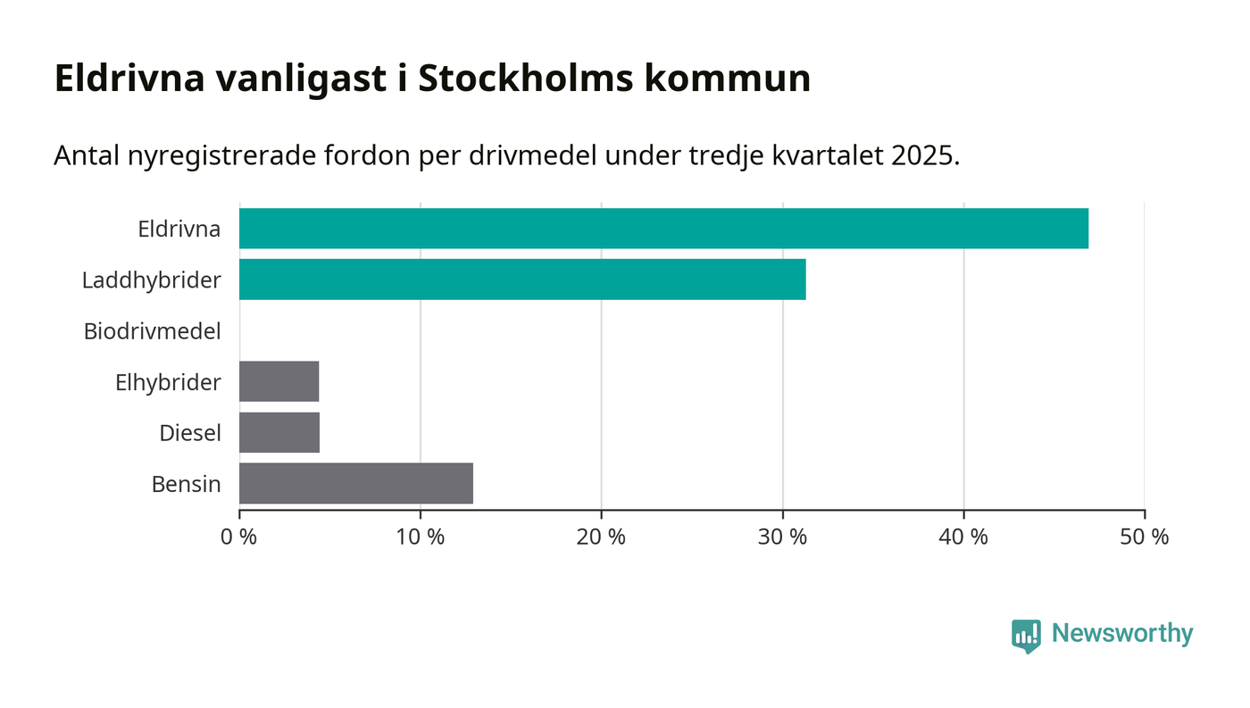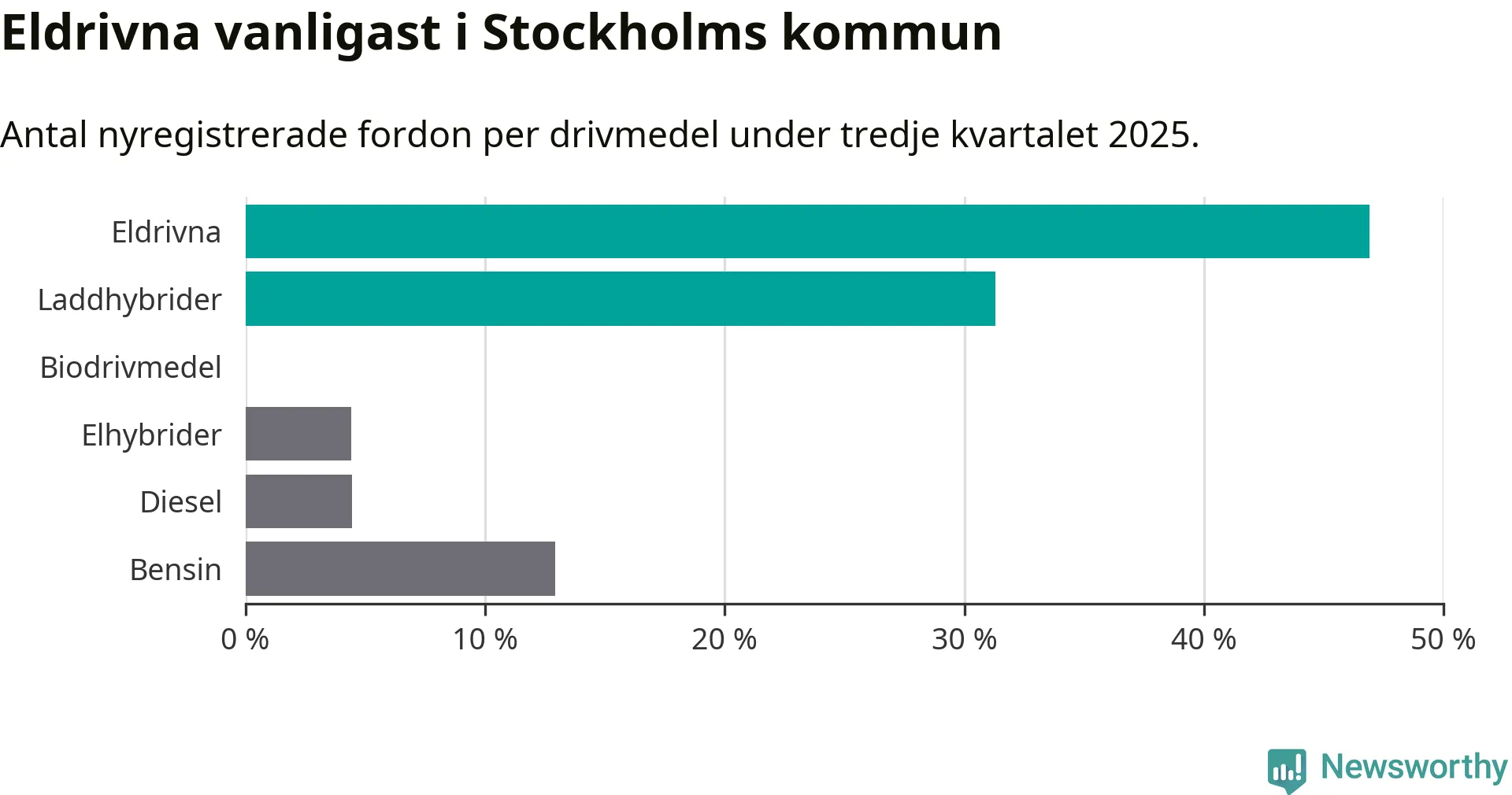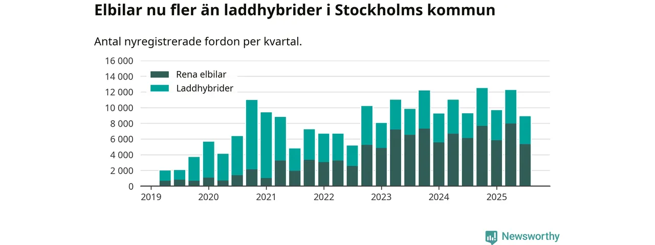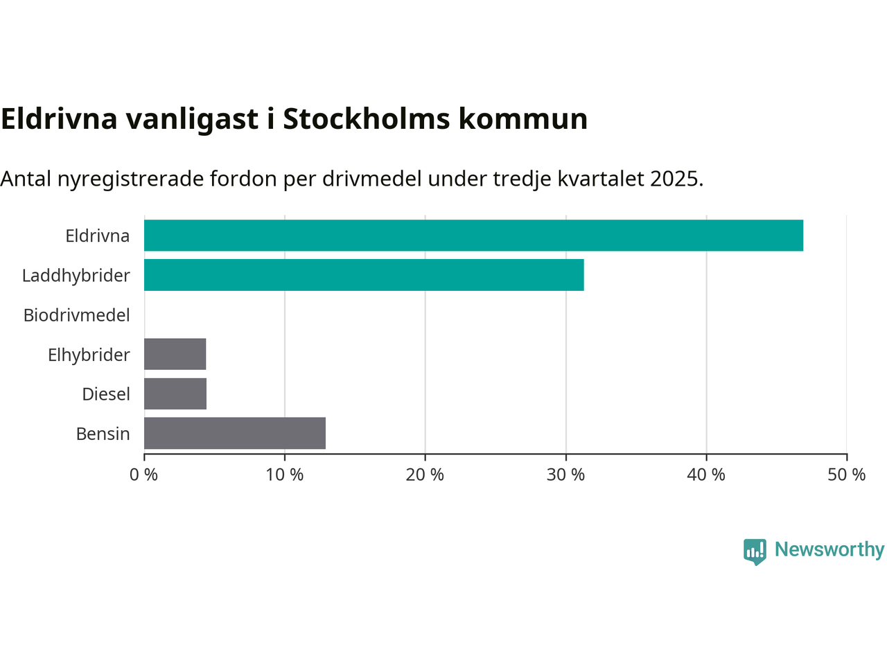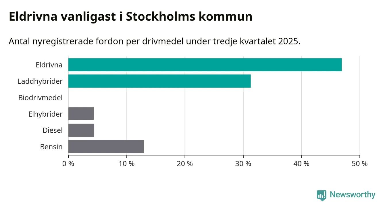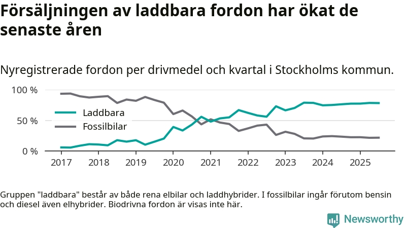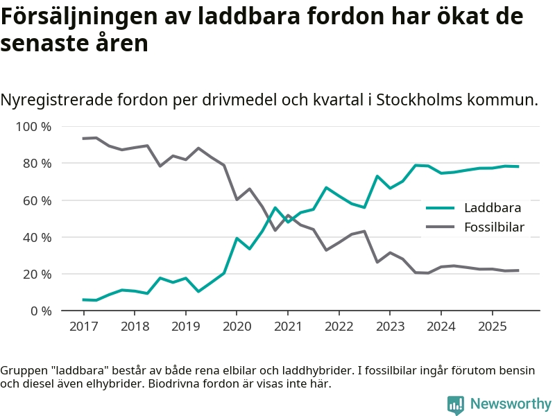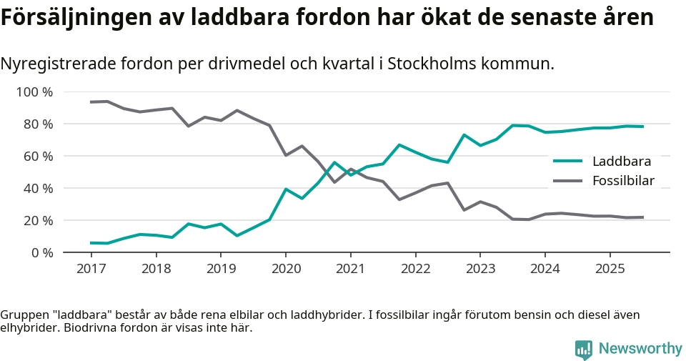 Under tredje kvartalet 2025 var 78 procent av alla nyregistrerade personbilar i Stockholms kommun laddbara (sammanlagt registrerades 11 378 nya bilar). Merparten av de laddbara bilarna var rena elbilar (47 procent av alla).