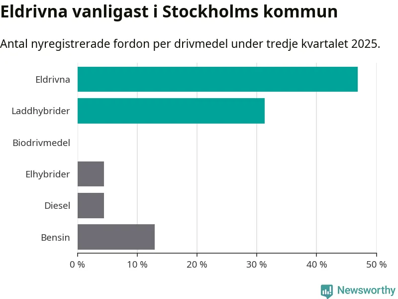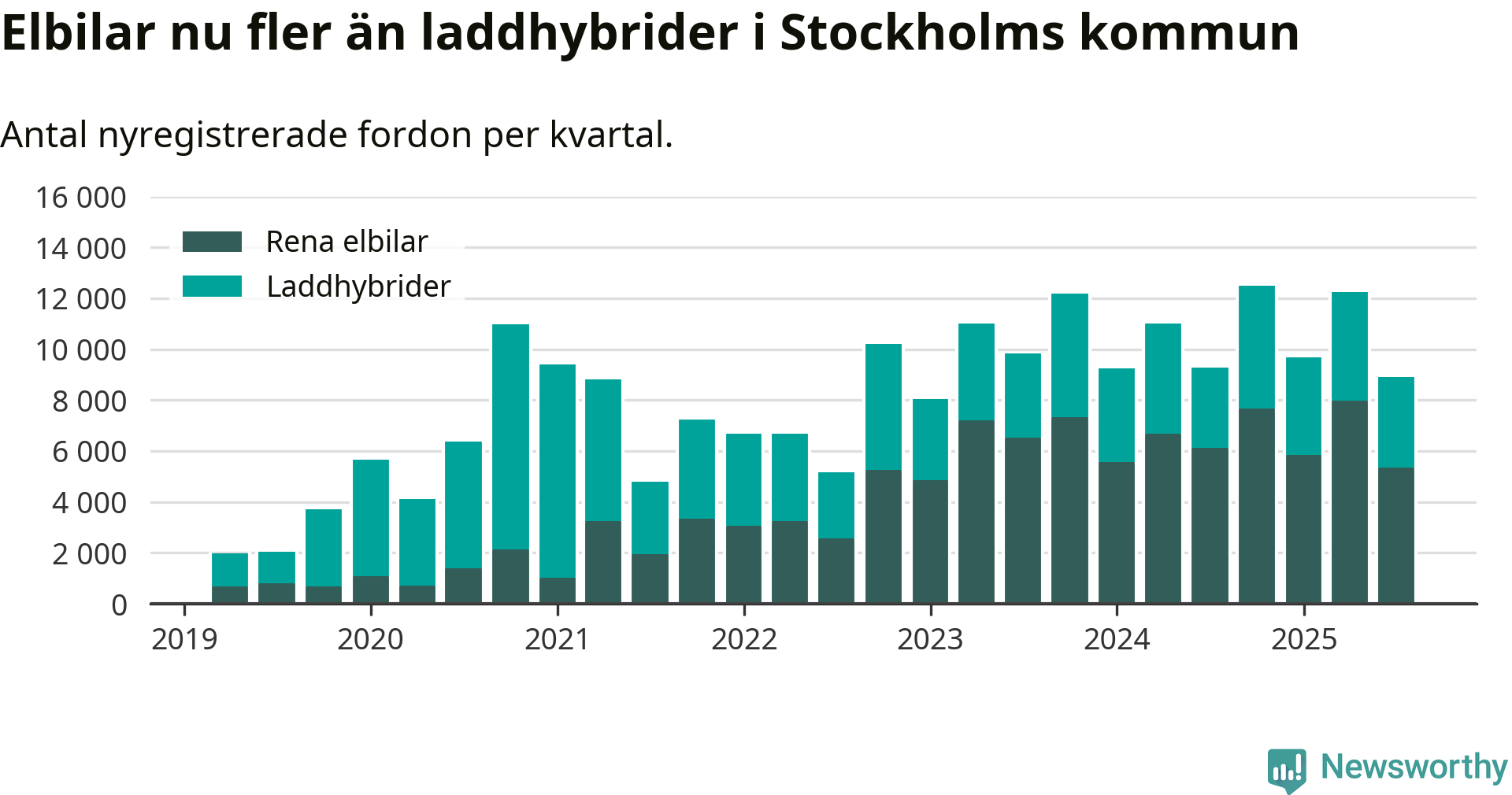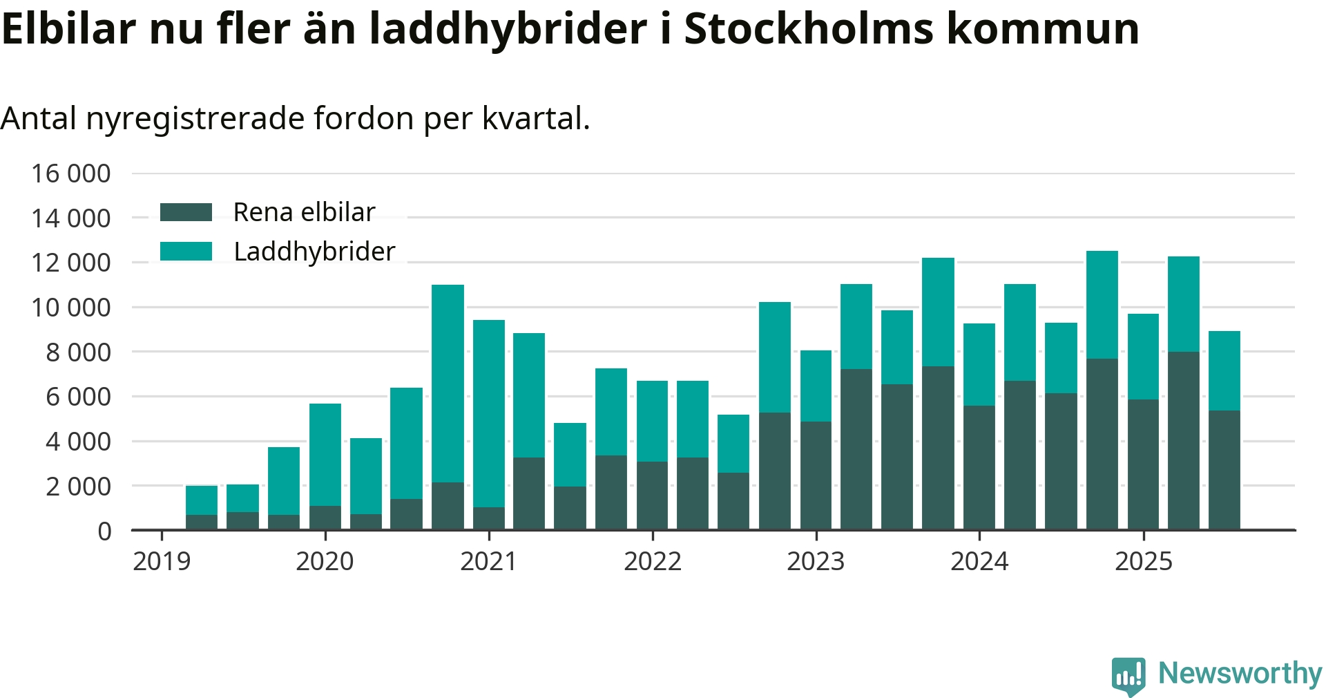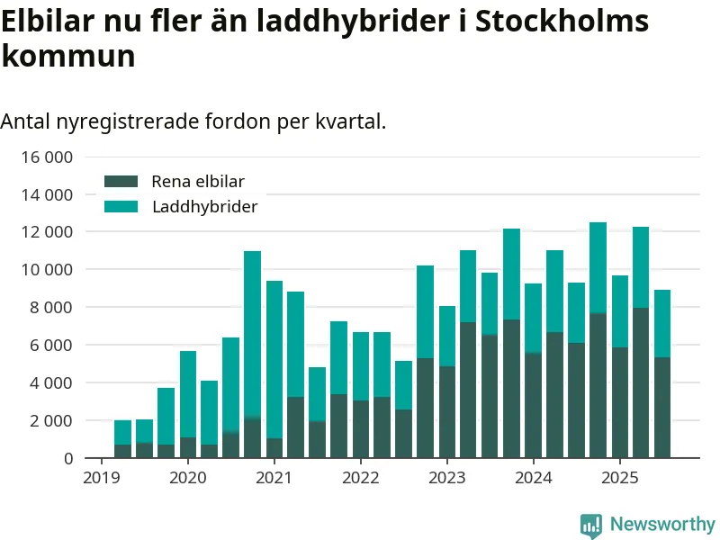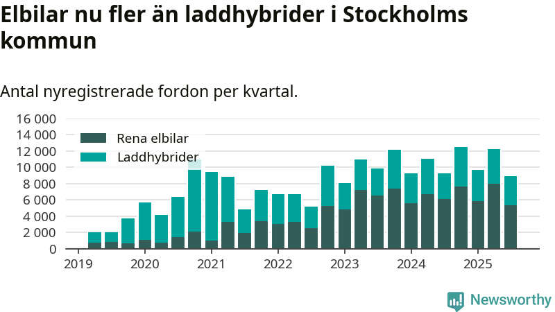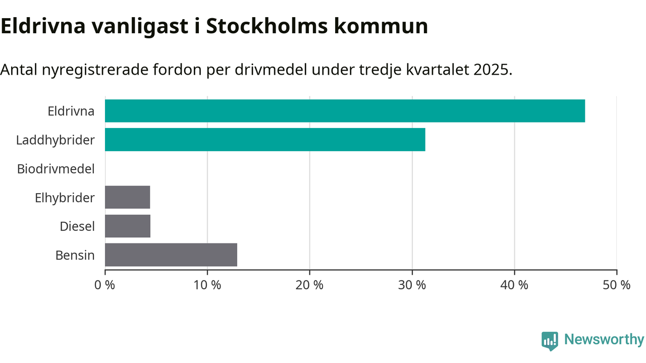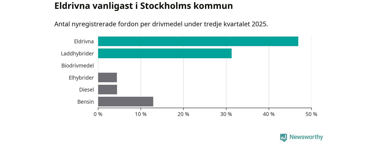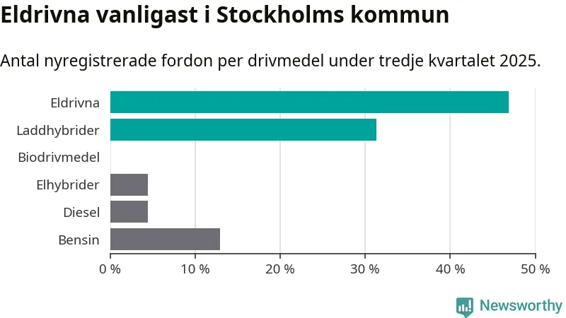 Under tredje kvartalet 2025 var 78 procent av alla nyregistrerade personbilar i Stockholms kommun laddbara (sammanlagt registrerades 11 378 nya bilar). Merparten av de laddbara bilarna var rena elbilar (47 procent av alla).