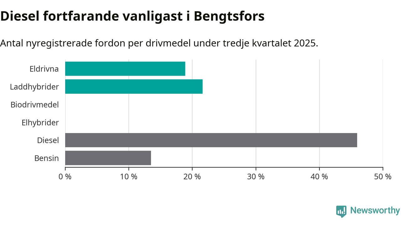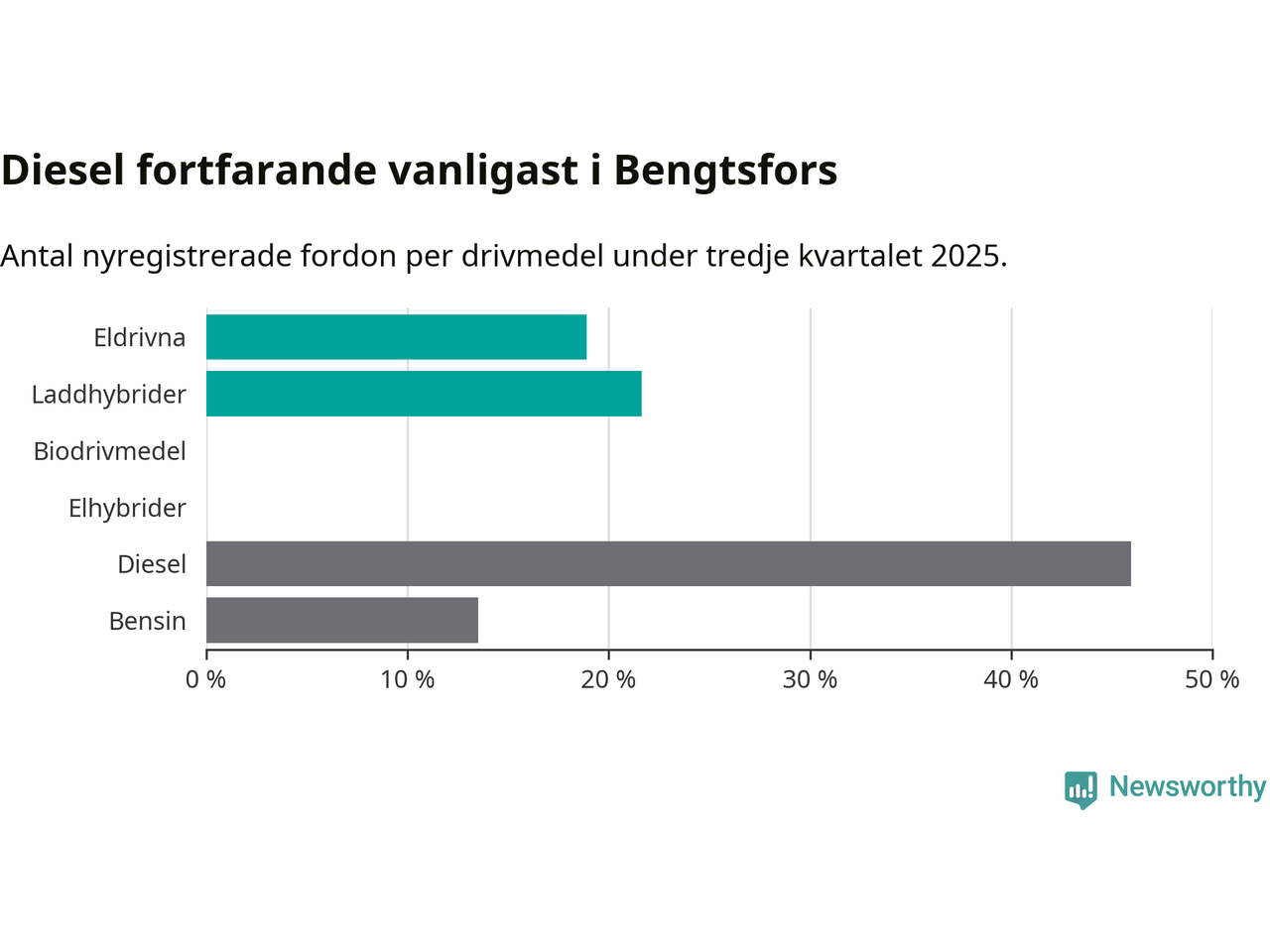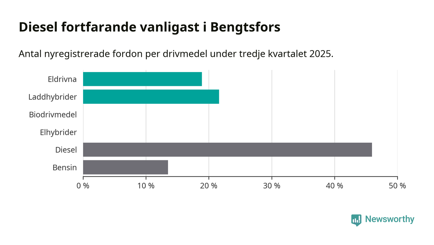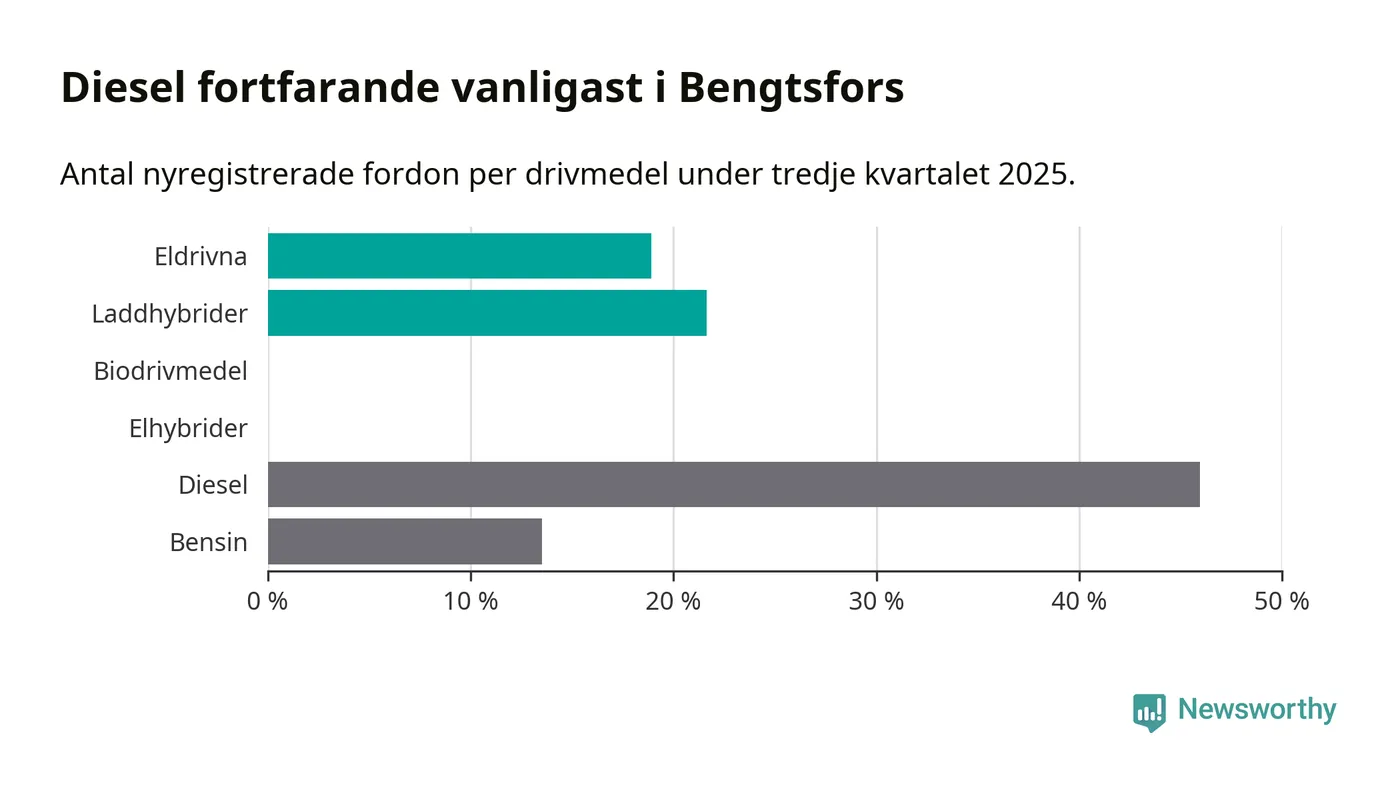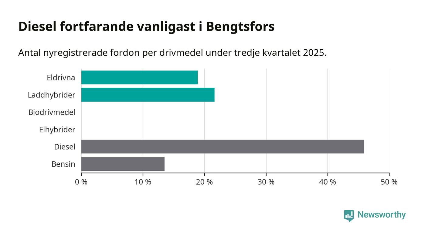 Under tredje kvartalet 2025 var 41 procent av alla nyregistrerade personbilar i Bengtsfors laddbara (sammanlagt registrerades 37 nya bilar). Merparten av de laddbara bilarna var så kallade laddhybrider, det vill säga fordon som går att ladda och köra på el, men som även har en förbränningsmotor. 19 procent av alla nya bilar var rena elbilar.