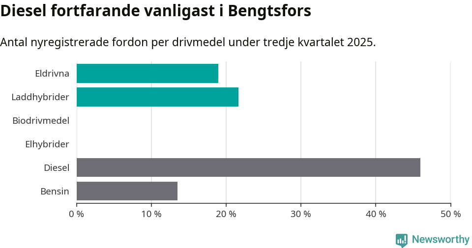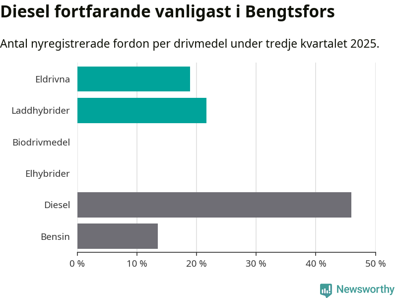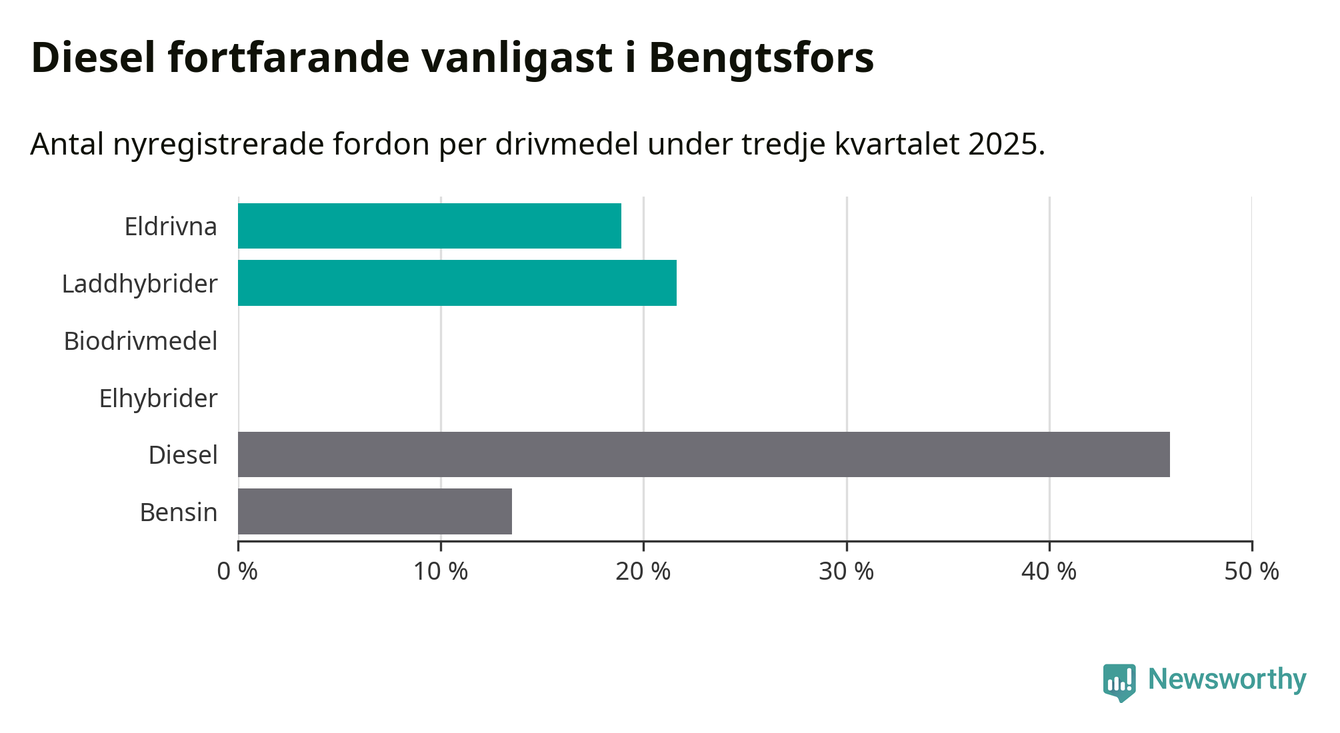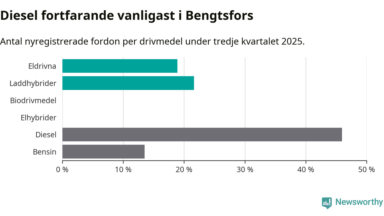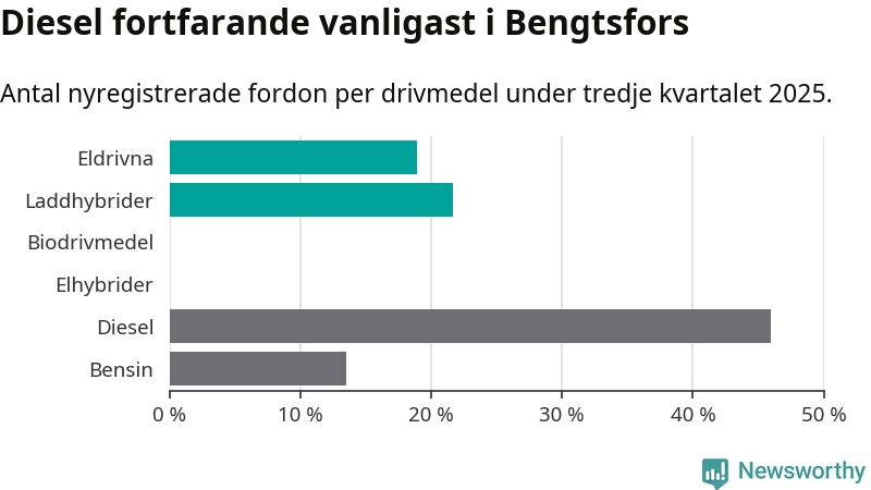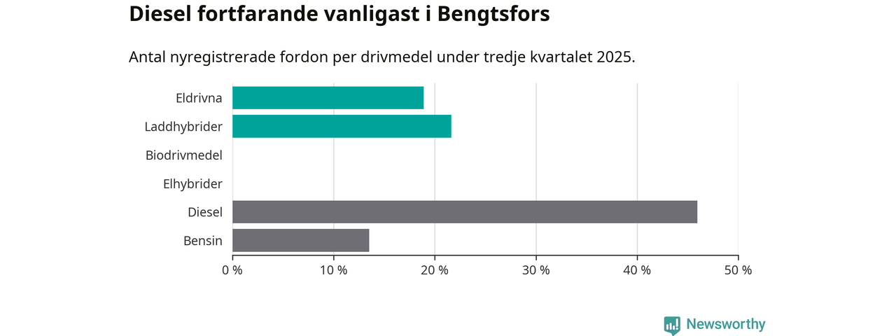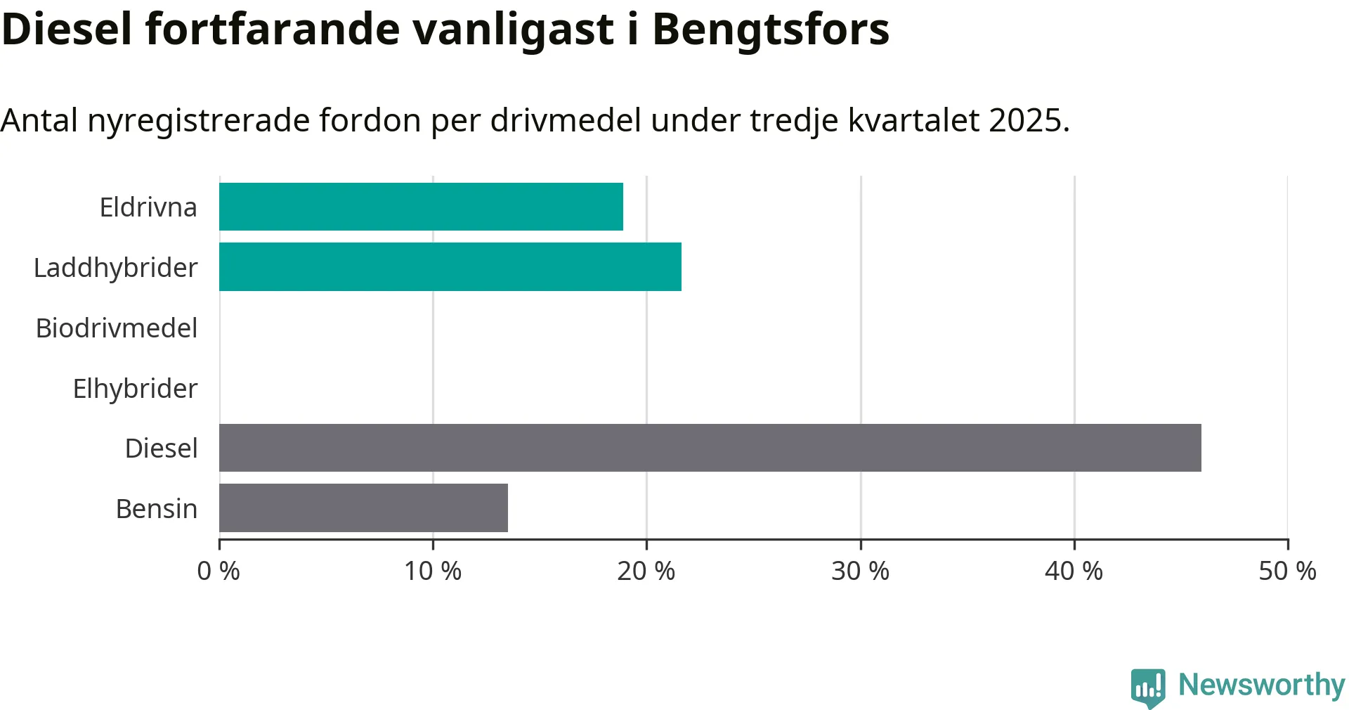 Under tredje kvartalet 2025 var 41 procent av alla nyregistrerade personbilar i Bengtsfors laddbara (sammanlagt registrerades 37 nya bilar). Merparten av de laddbara bilarna var så kallade laddhybrider, det vill säga fordon som går att ladda och köra på el, men som även har en förbränningsmotor. 19 procent av alla nya bilar var rena elbilar.