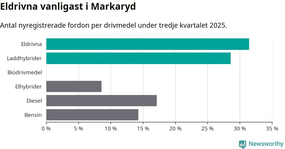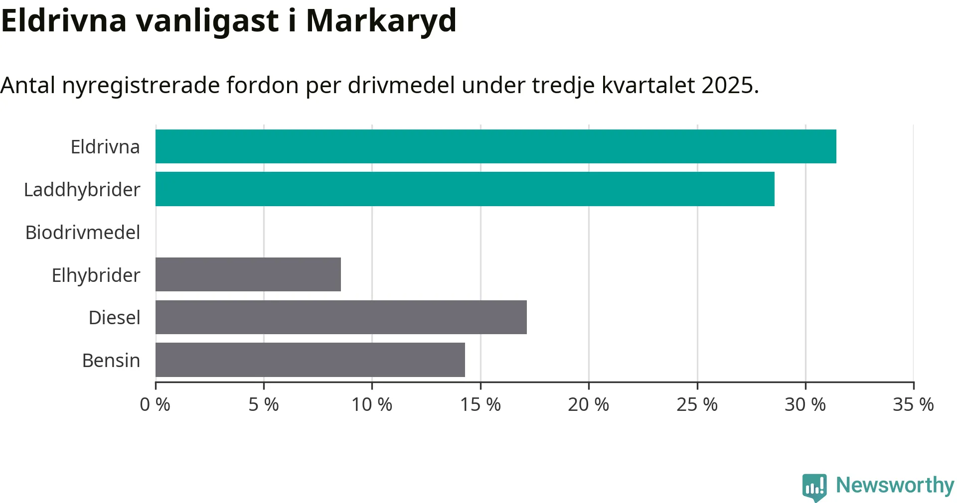 Under tredje kvartalet 2025 var 60 procent av alla nyregistrerade personbilar i Markaryd laddbara (sammanlagt registrerades 35 nya bilar). Merparten av de laddbara bilarna var rena elbilar (31 procent av alla).