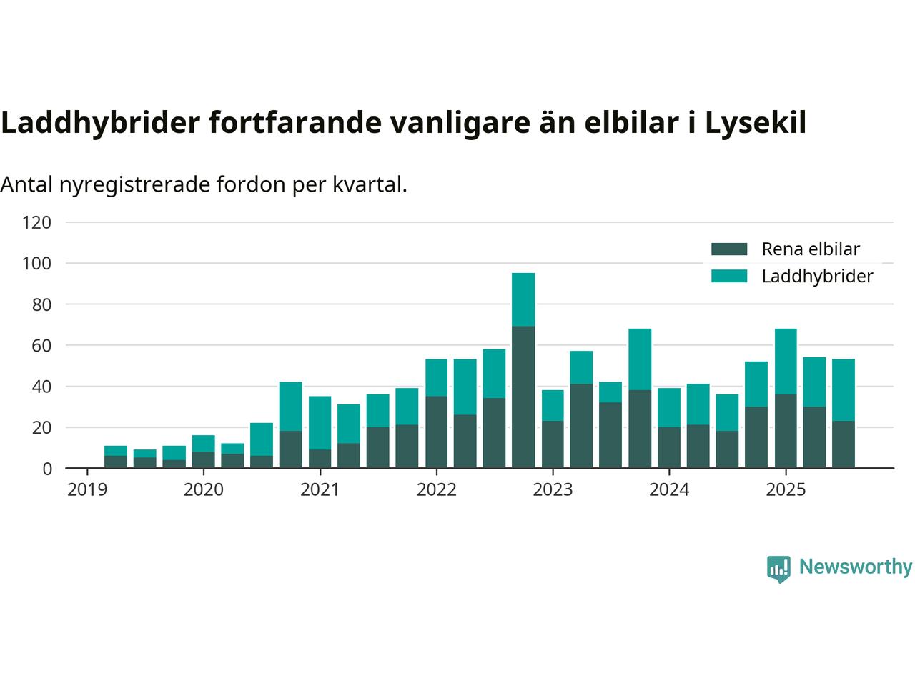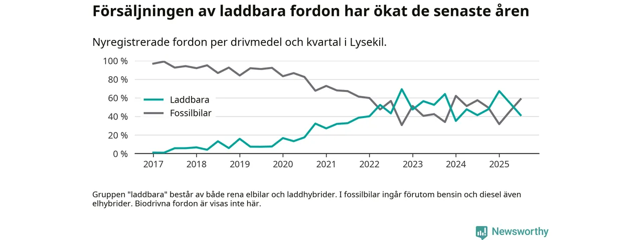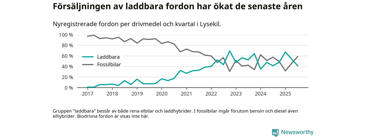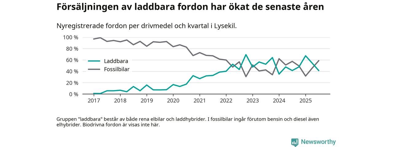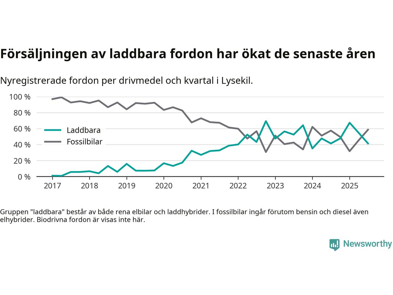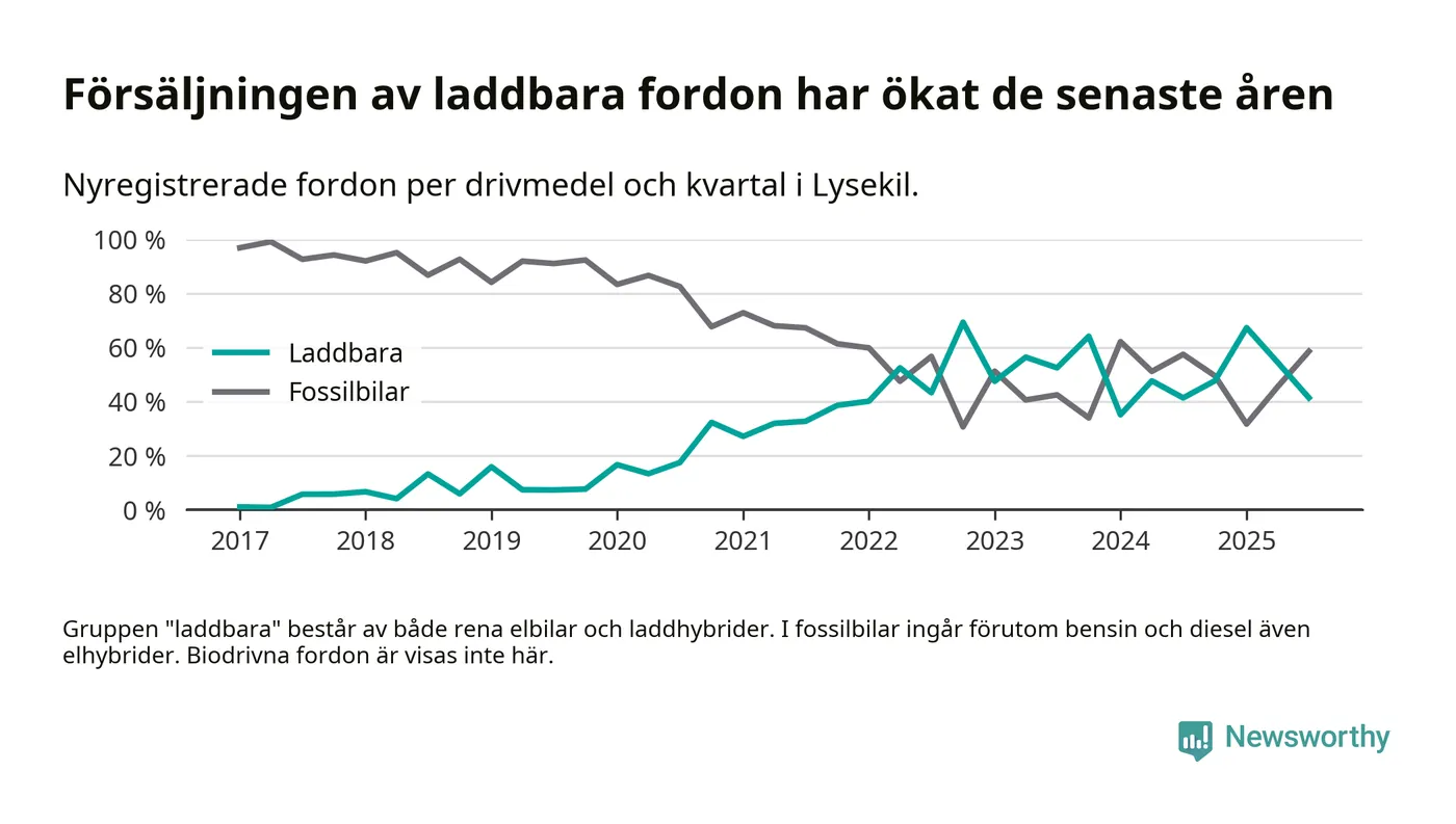 Under tredje kvartalet 2025 var 41 procent av alla nyregistrerade personbilar i Lysekil laddbara (sammanlagt registrerades 128 nya bilar). Merparten av de laddbara bilarna var så kallade laddhybrider, det vill säga fordon som går att ladda och köra på el, men som även har en förbränningsmotor. 18 procent av alla nya bilar var rena elbilar.