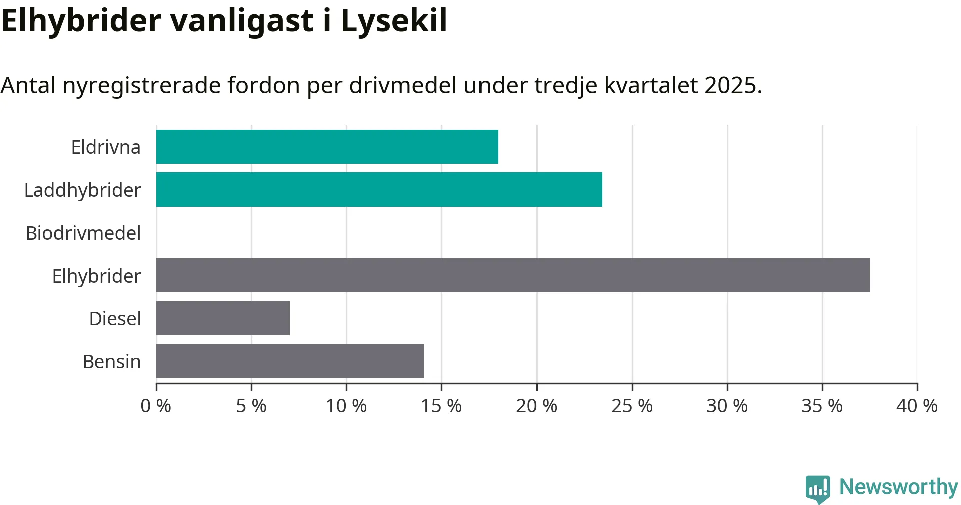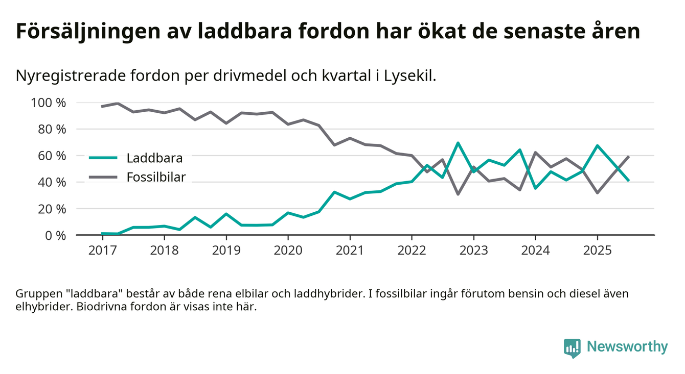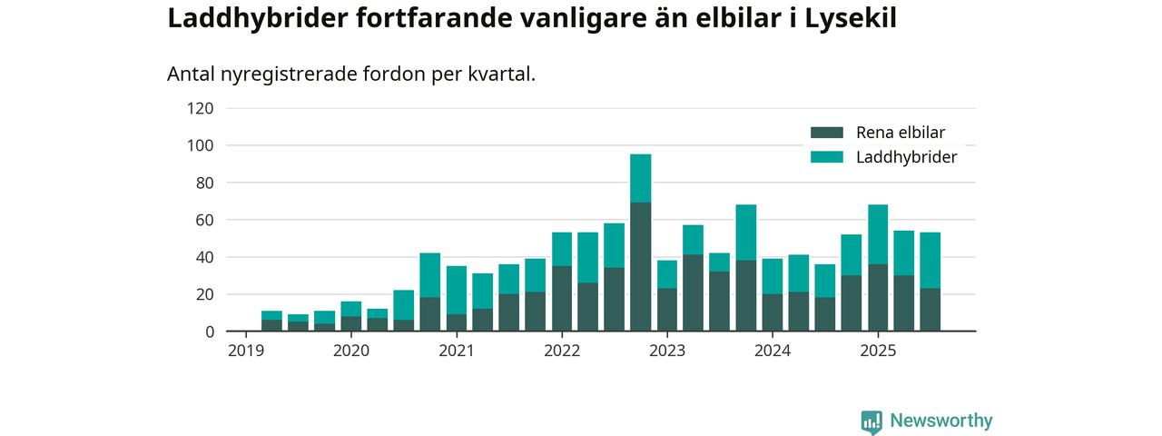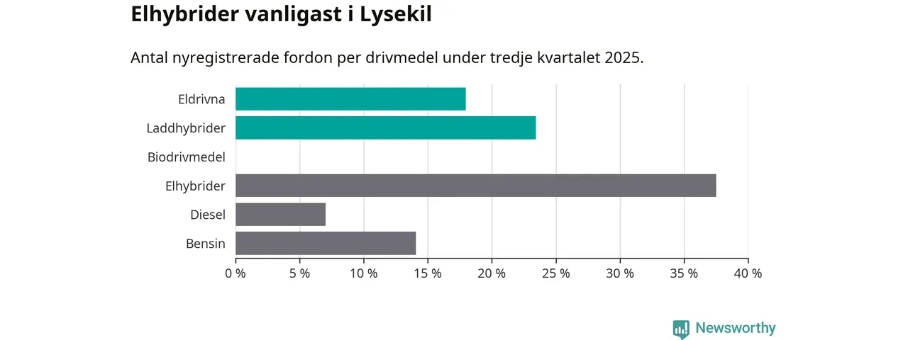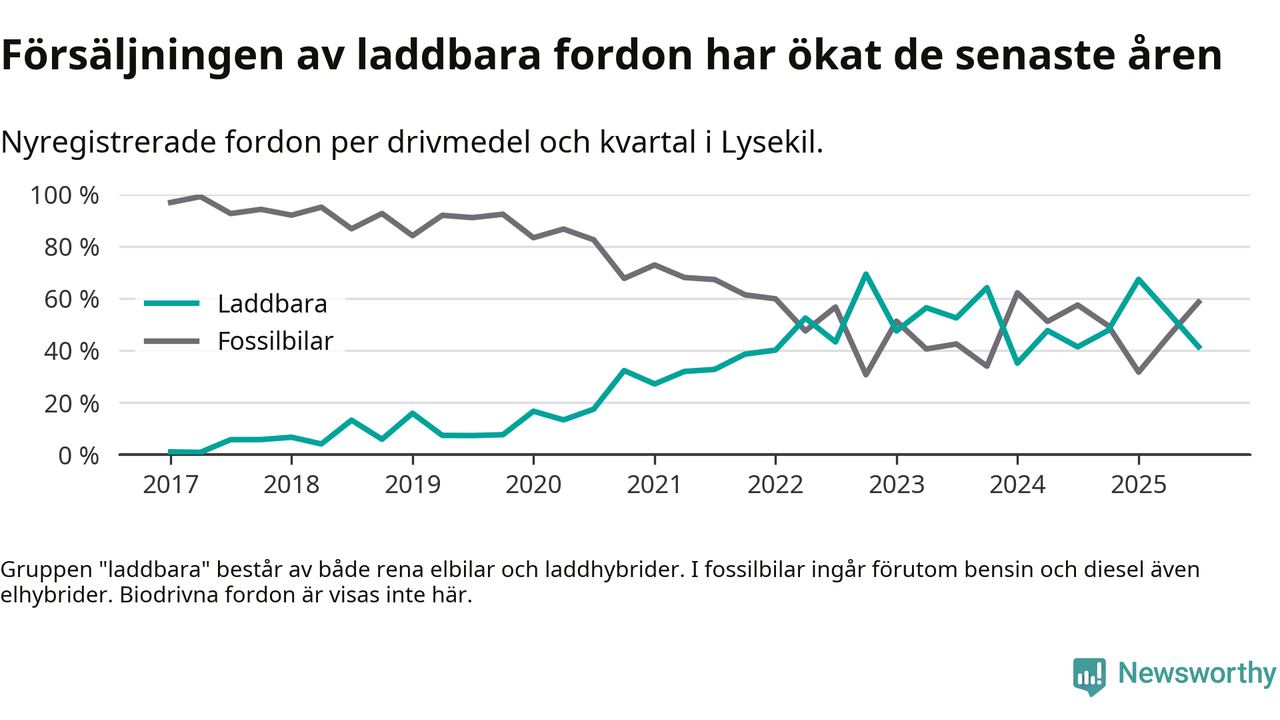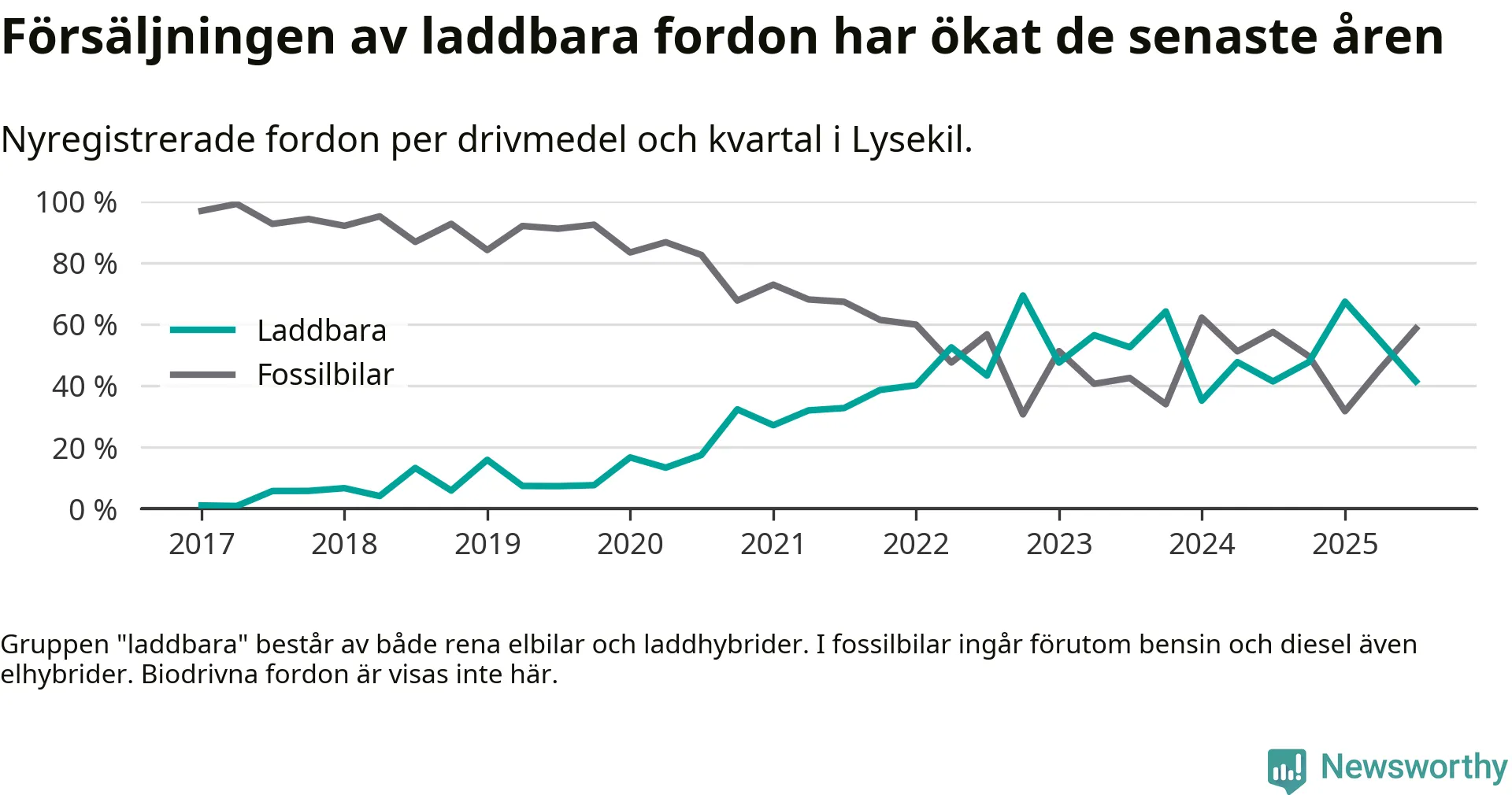 Under tredje kvartalet 2025 var 41 procent av alla nyregistrerade personbilar i Lysekil laddbara (sammanlagt registrerades 128 nya bilar). Merparten av de laddbara bilarna var så kallade laddhybrider, det vill säga fordon som går att ladda och köra på el, men som även har en förbränningsmotor. 18 procent av alla nya bilar var rena elbilar.