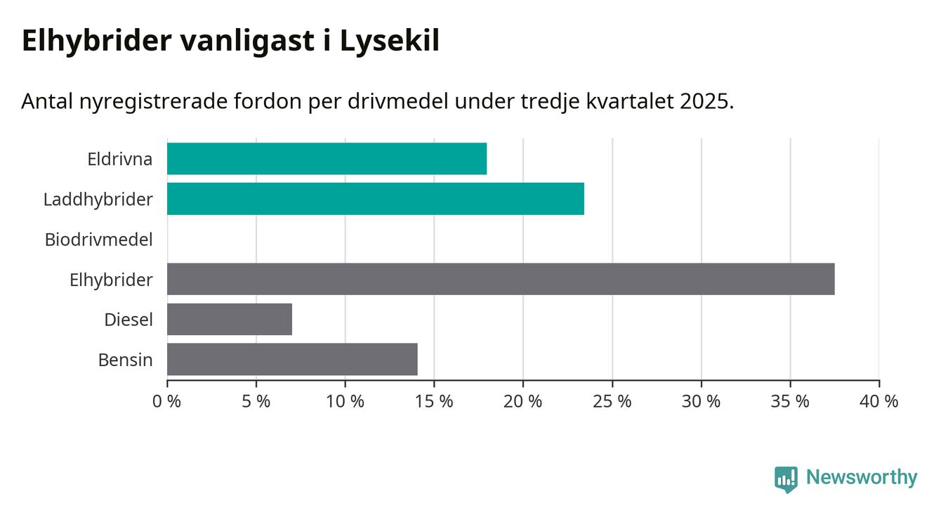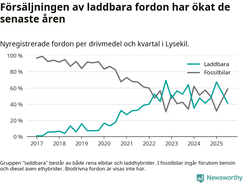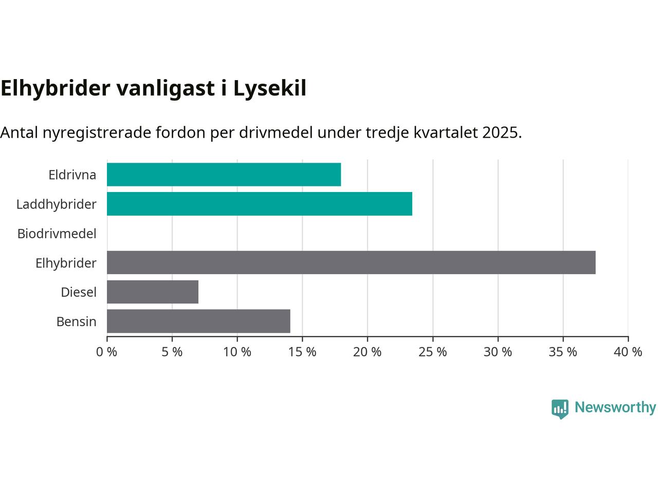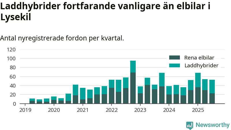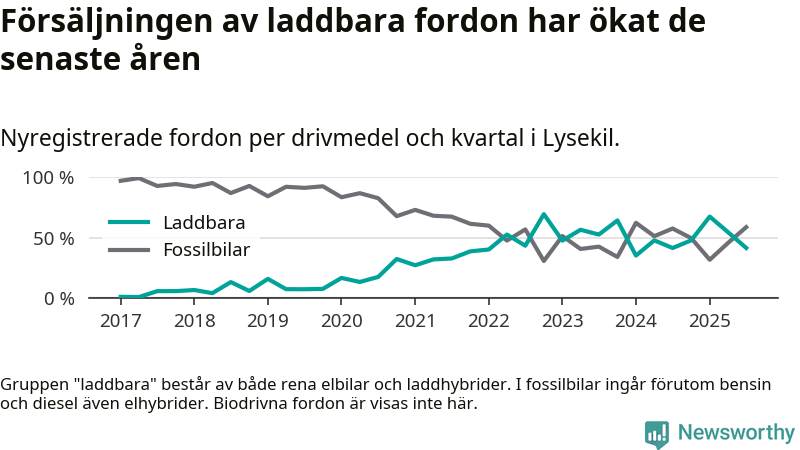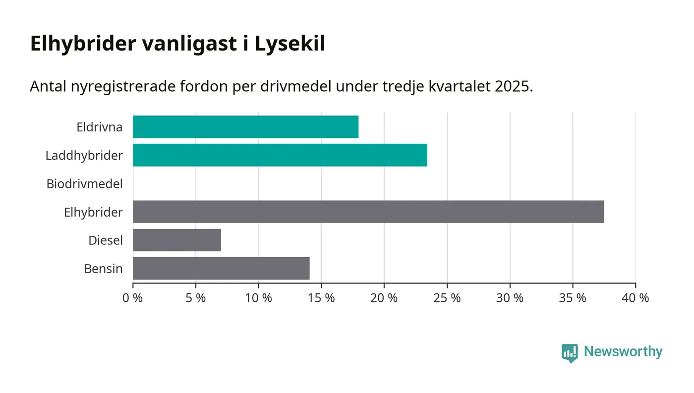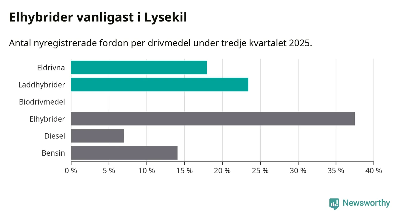 Under tredje kvartalet 2025 var 41 procent av alla nyregistrerade personbilar i Lysekil laddbara (sammanlagt registrerades 128 nya bilar). Merparten av de laddbara bilarna var så kallade laddhybrider, det vill säga fordon som går att ladda och köra på el, men som även har en förbränningsmotor. 18 procent av alla nya bilar var rena elbilar.