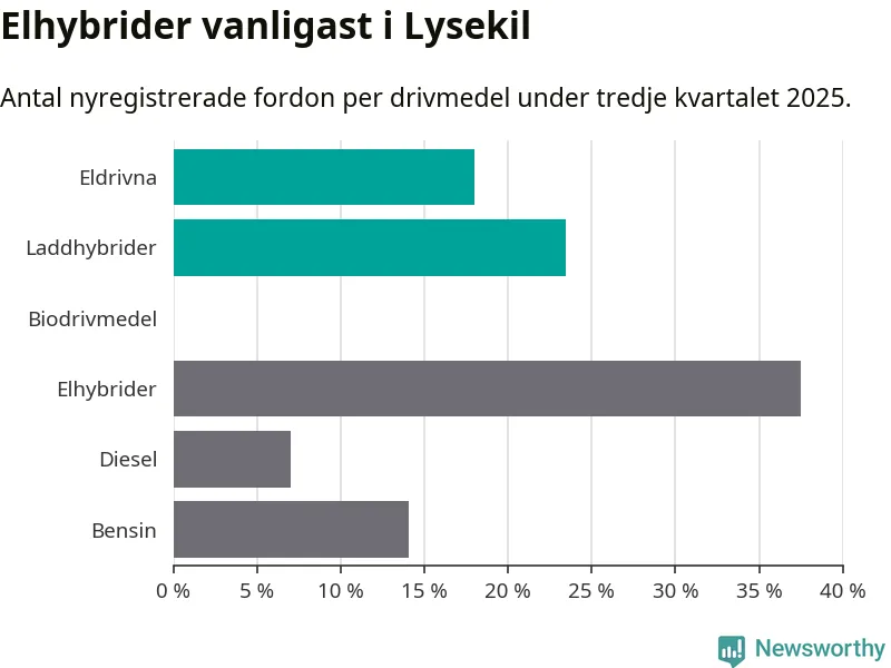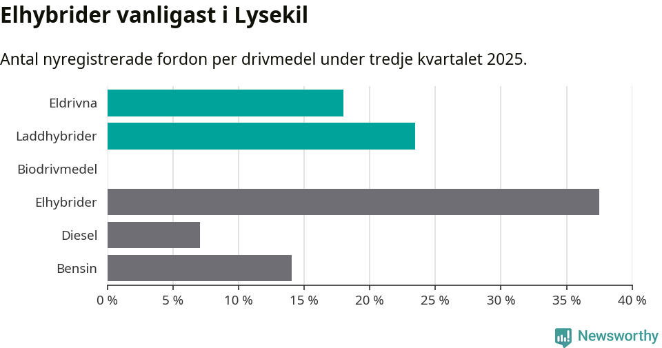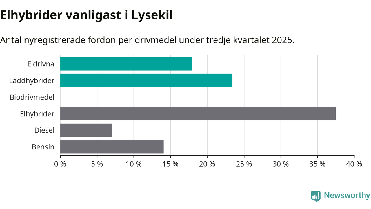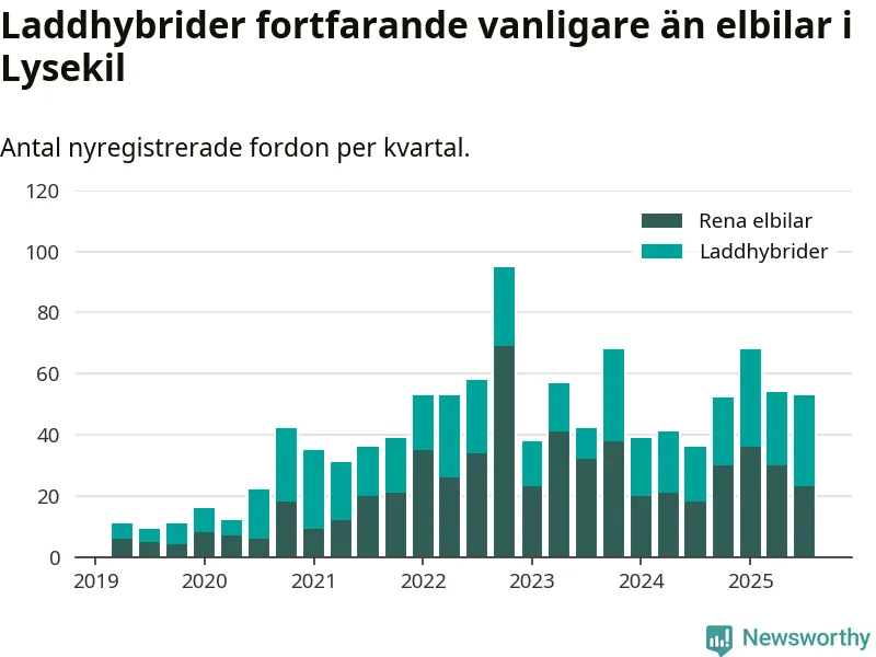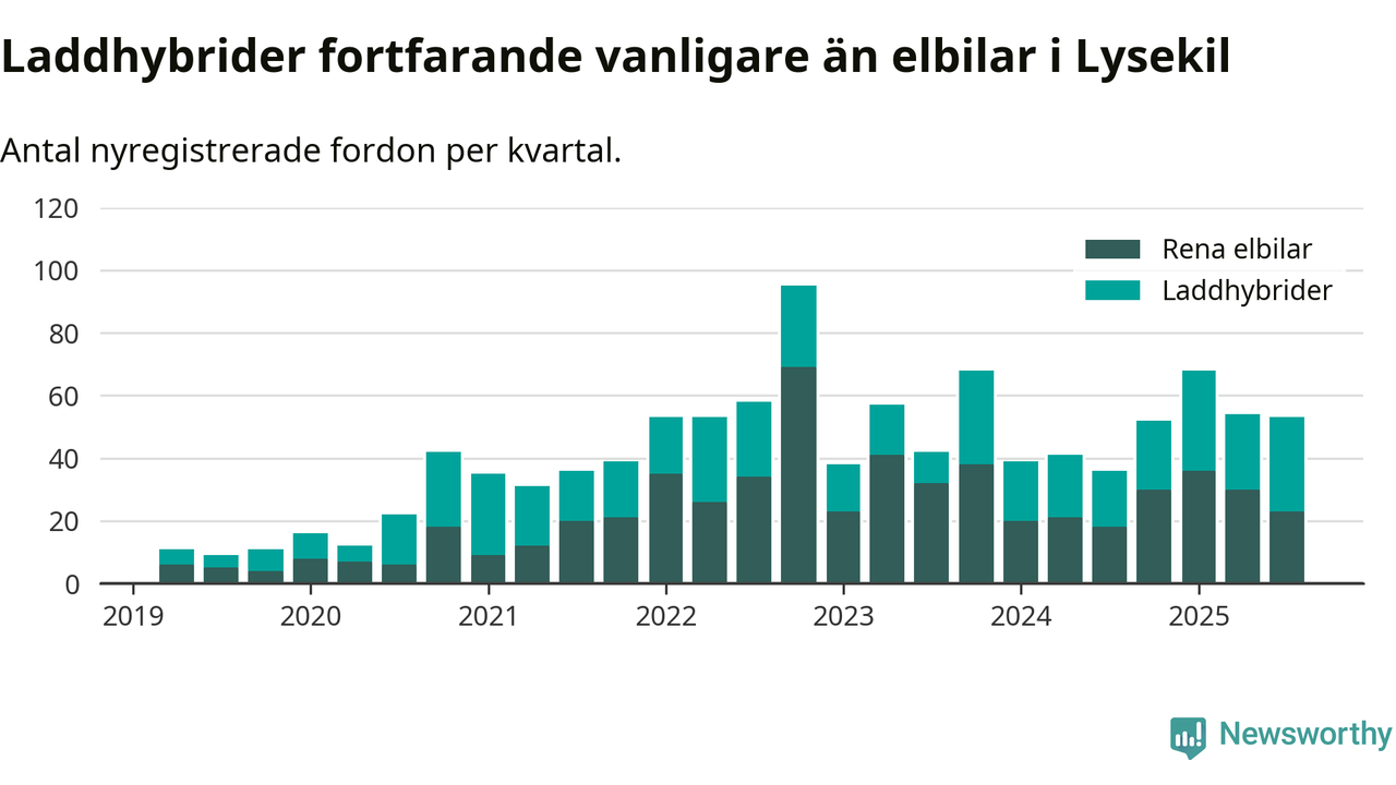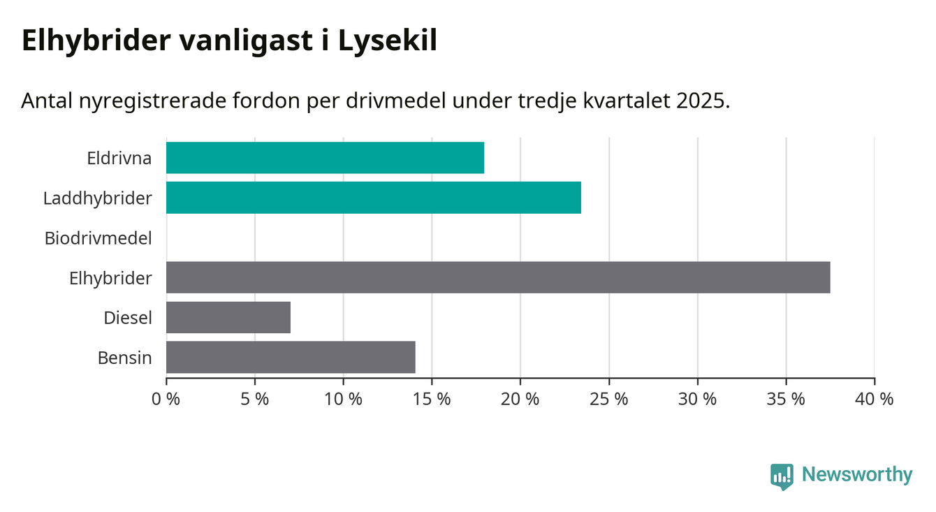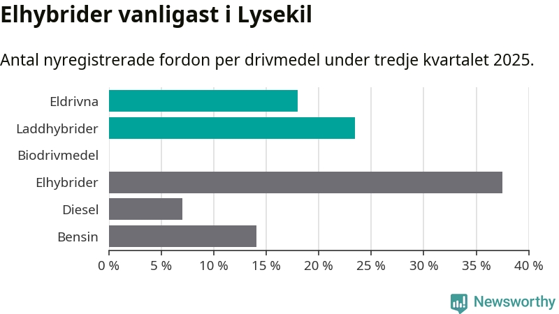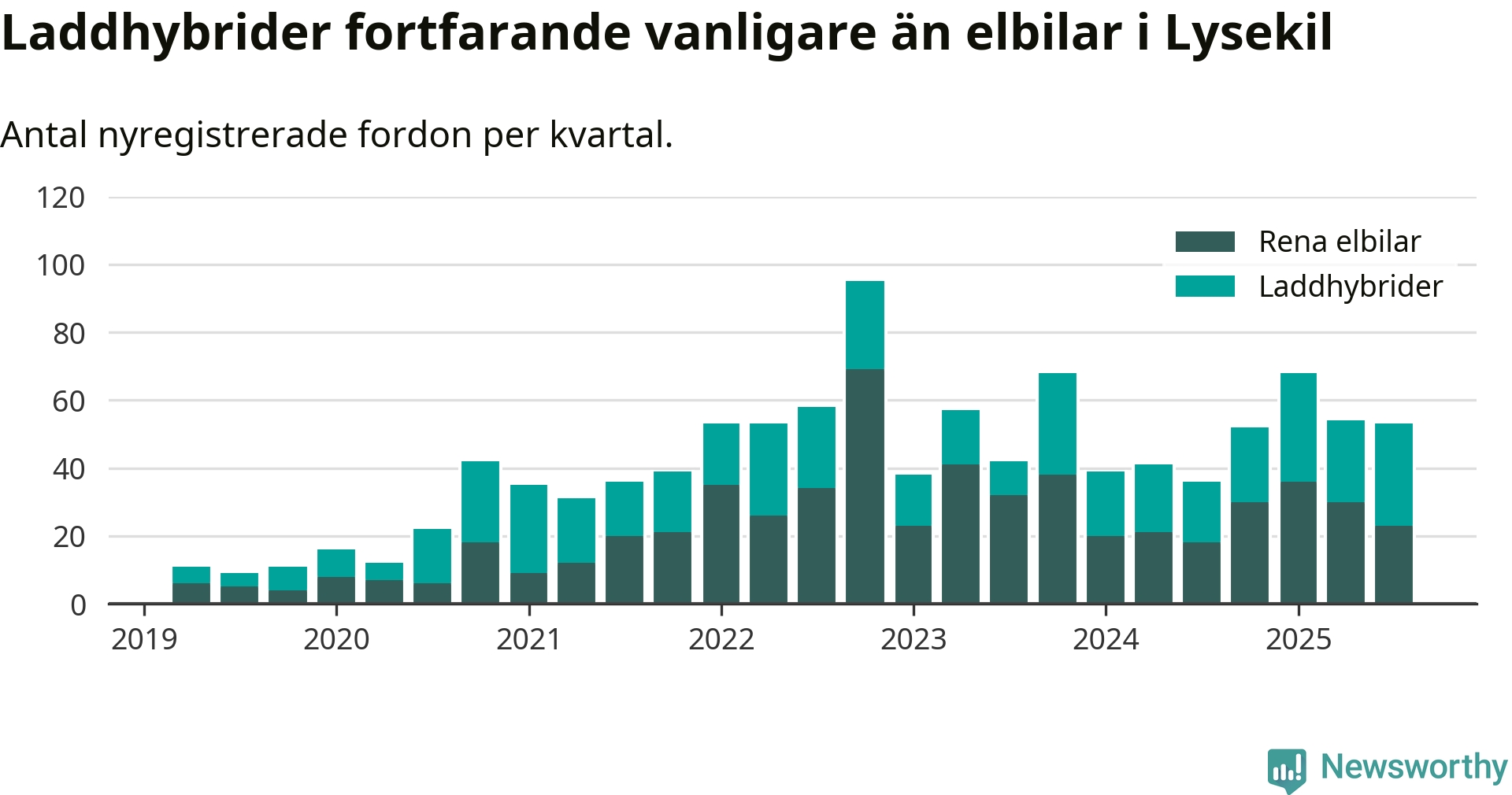 Under tredje kvartalet 2025 var 41 procent av alla nyregistrerade personbilar i Lysekil laddbara (sammanlagt registrerades 128 nya bilar). Merparten av de laddbara bilarna var så kallade laddhybrider, det vill säga fordon som går att ladda och köra på el, men som även har en förbränningsmotor. 18 procent av alla nya bilar var rena elbilar.