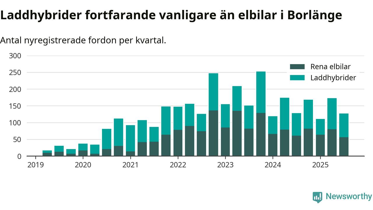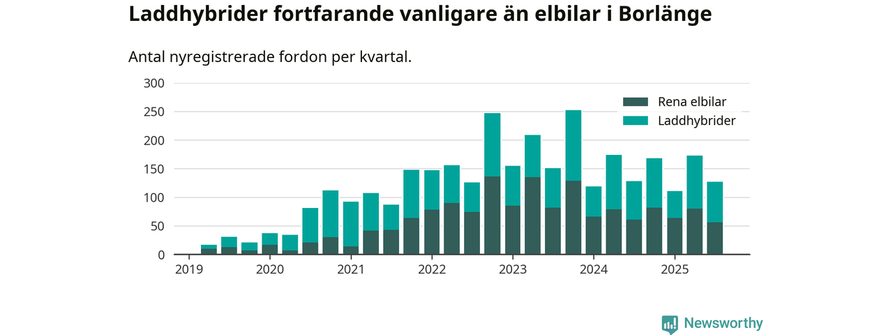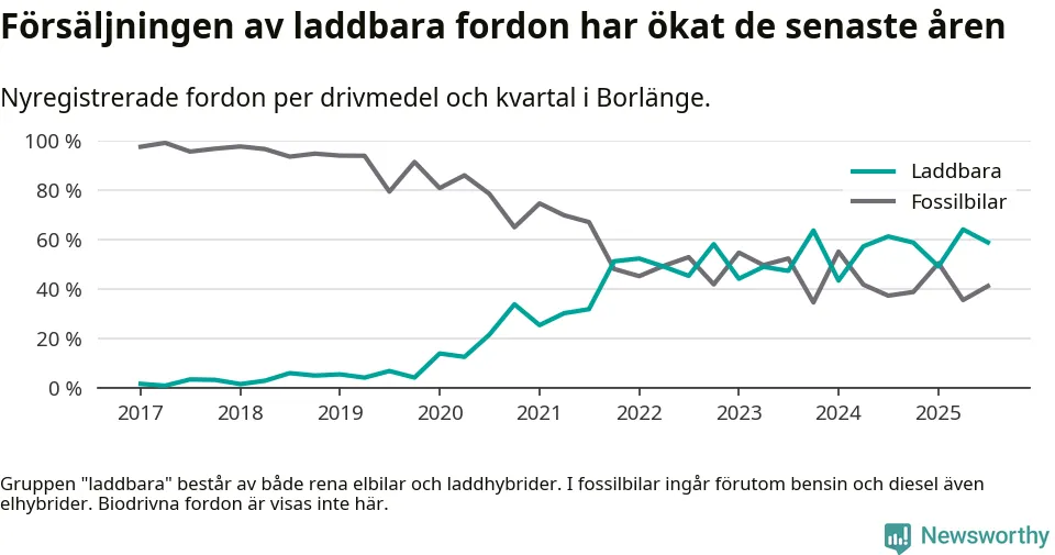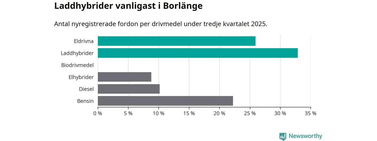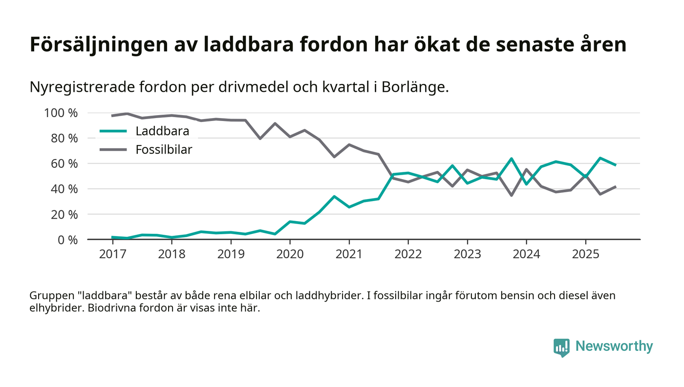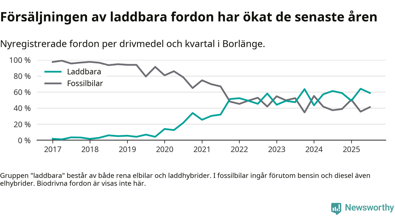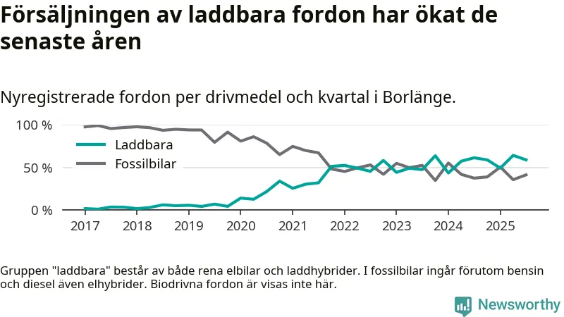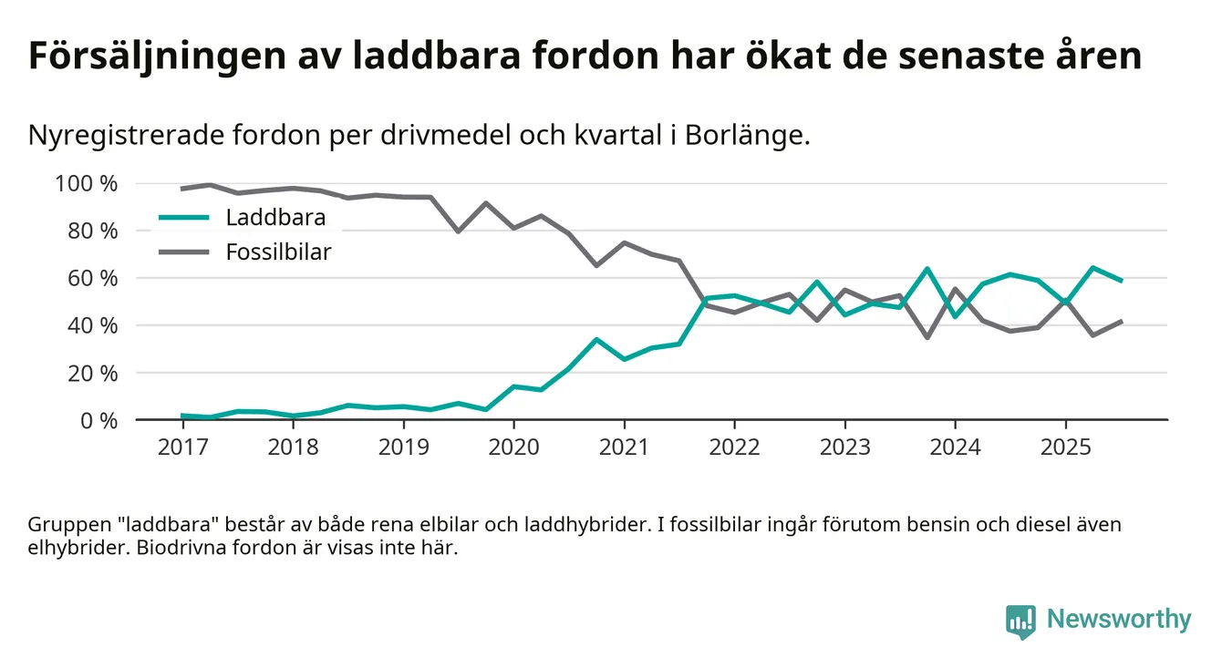 Under tredje kvartalet 2025 var 59 procent av alla nyregistrerade personbilar i Borlänge laddbara (sammanlagt registrerades 216 nya bilar). Merparten av de laddbara bilarna var så kallade laddhybrider, det vill säga fordon som går att ladda och köra på el, men som även har en förbränningsmotor. 26 procent av alla nya bilar var rena elbilar.