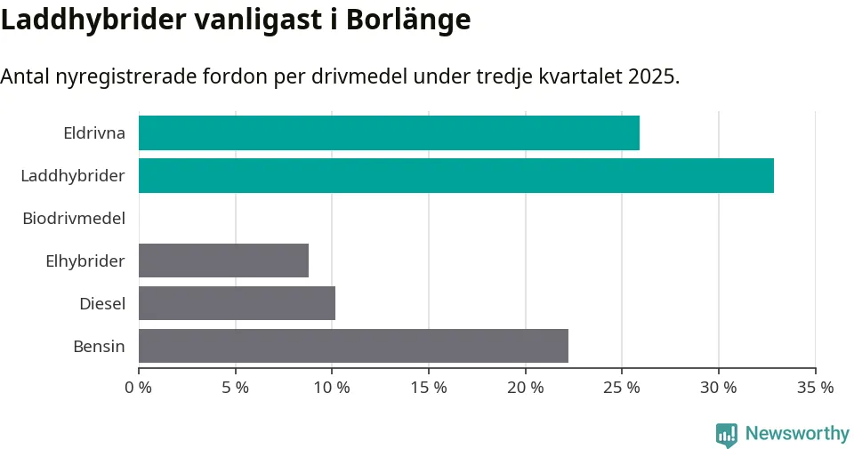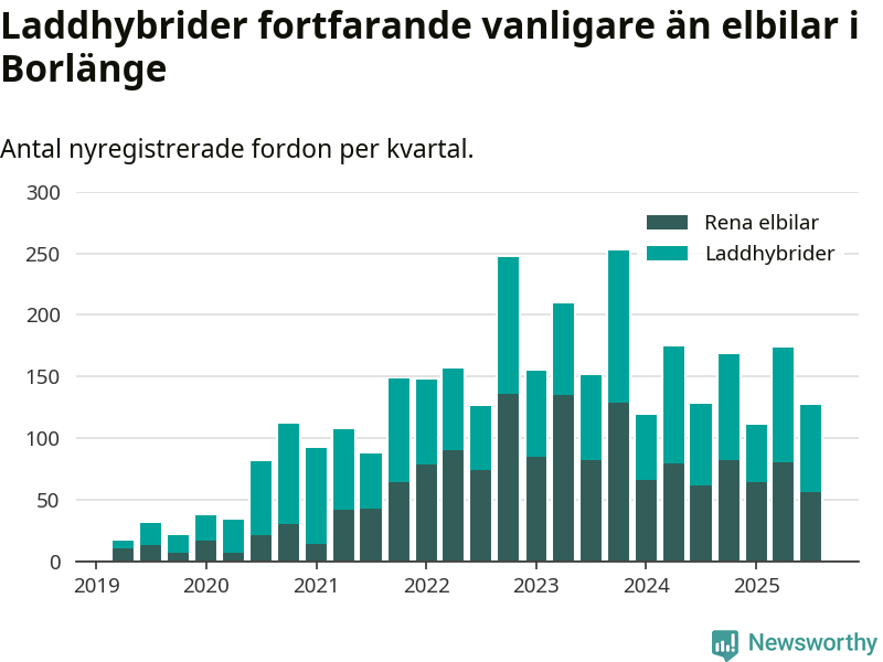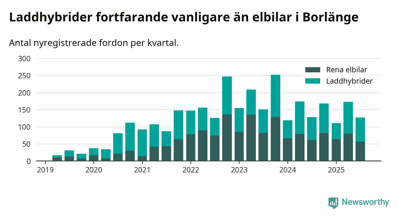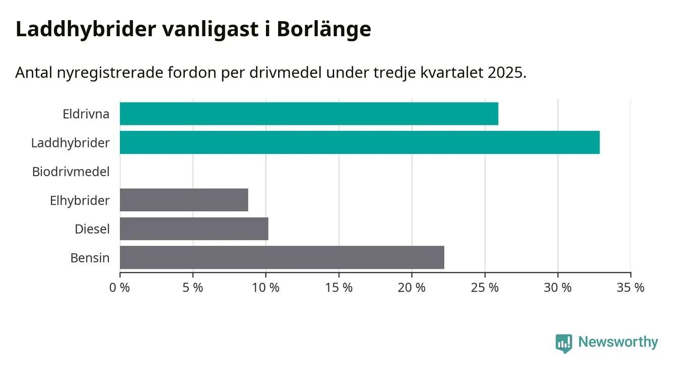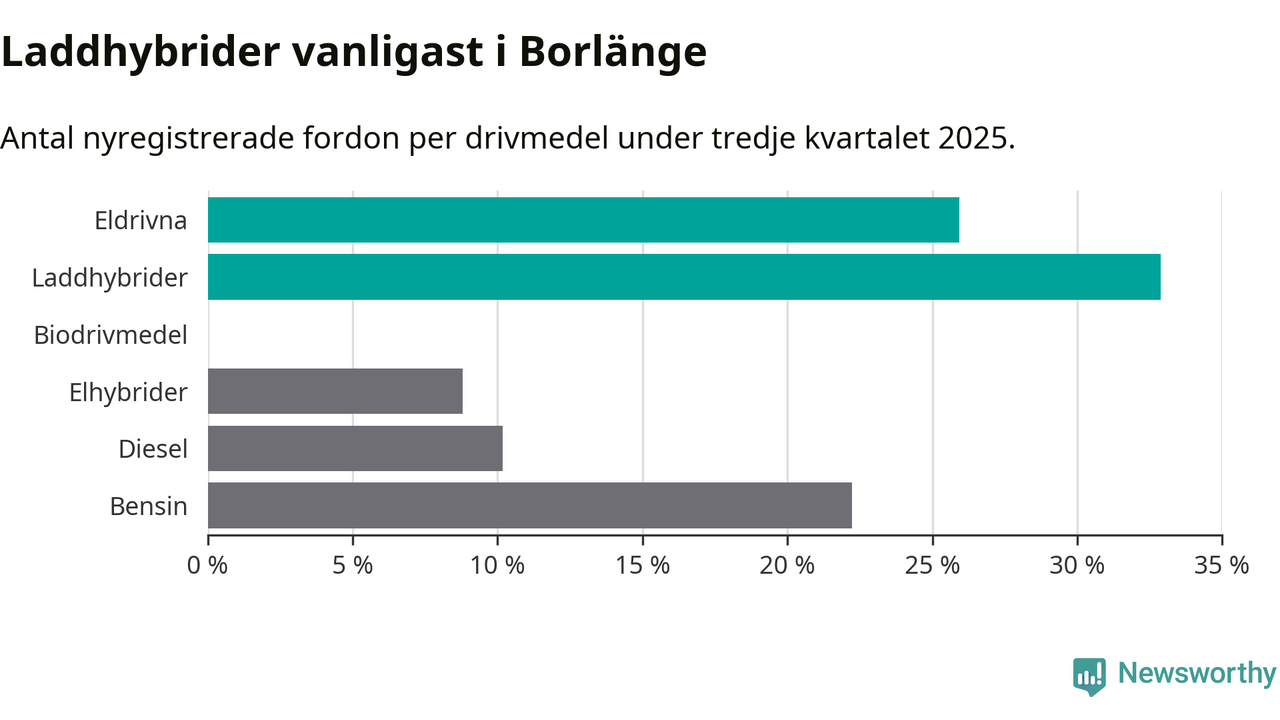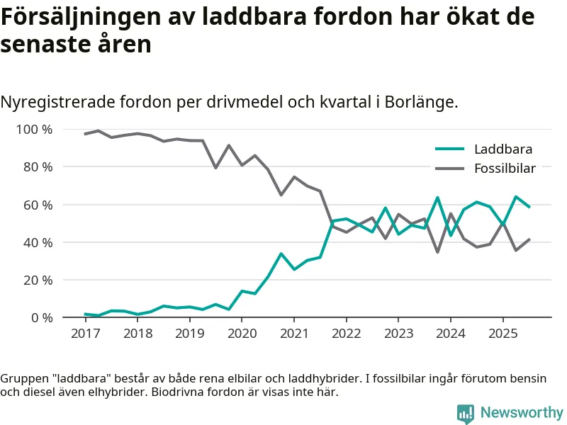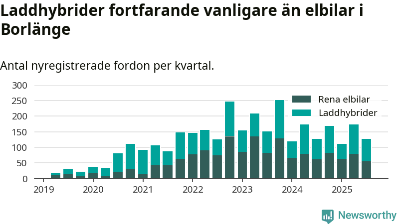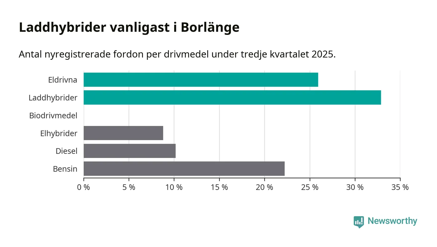 Under tredje kvartalet 2025 var 59 procent av alla nyregistrerade personbilar i Borlänge laddbara (sammanlagt registrerades 216 nya bilar). Merparten av de laddbara bilarna var så kallade laddhybrider, det vill säga fordon som går att ladda och köra på el, men som även har en förbränningsmotor. 26 procent av alla nya bilar var rena elbilar.
