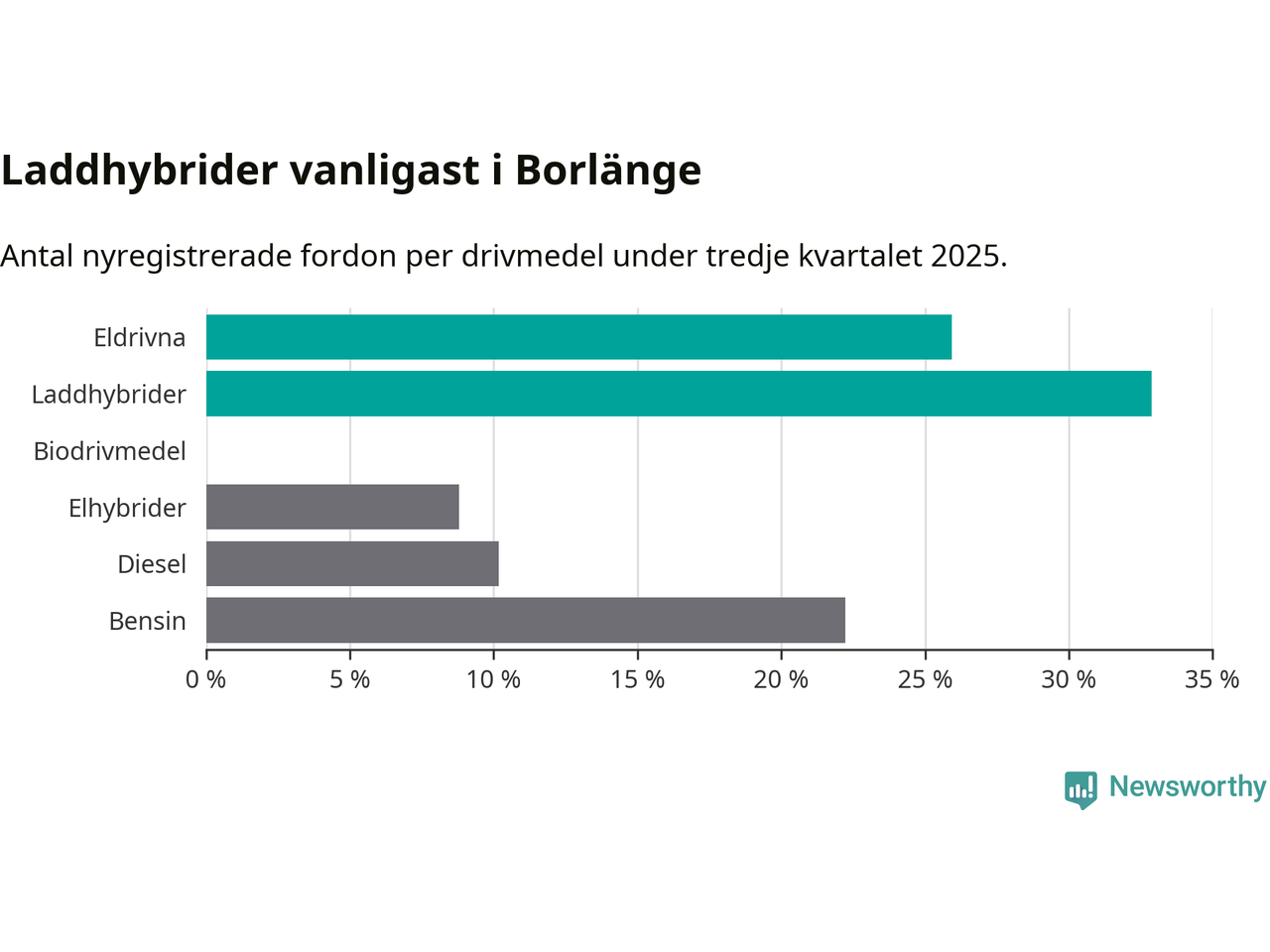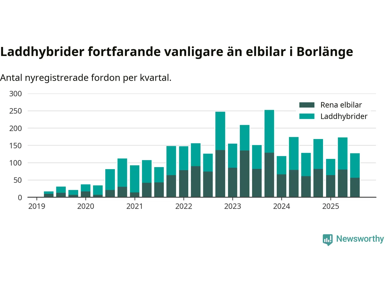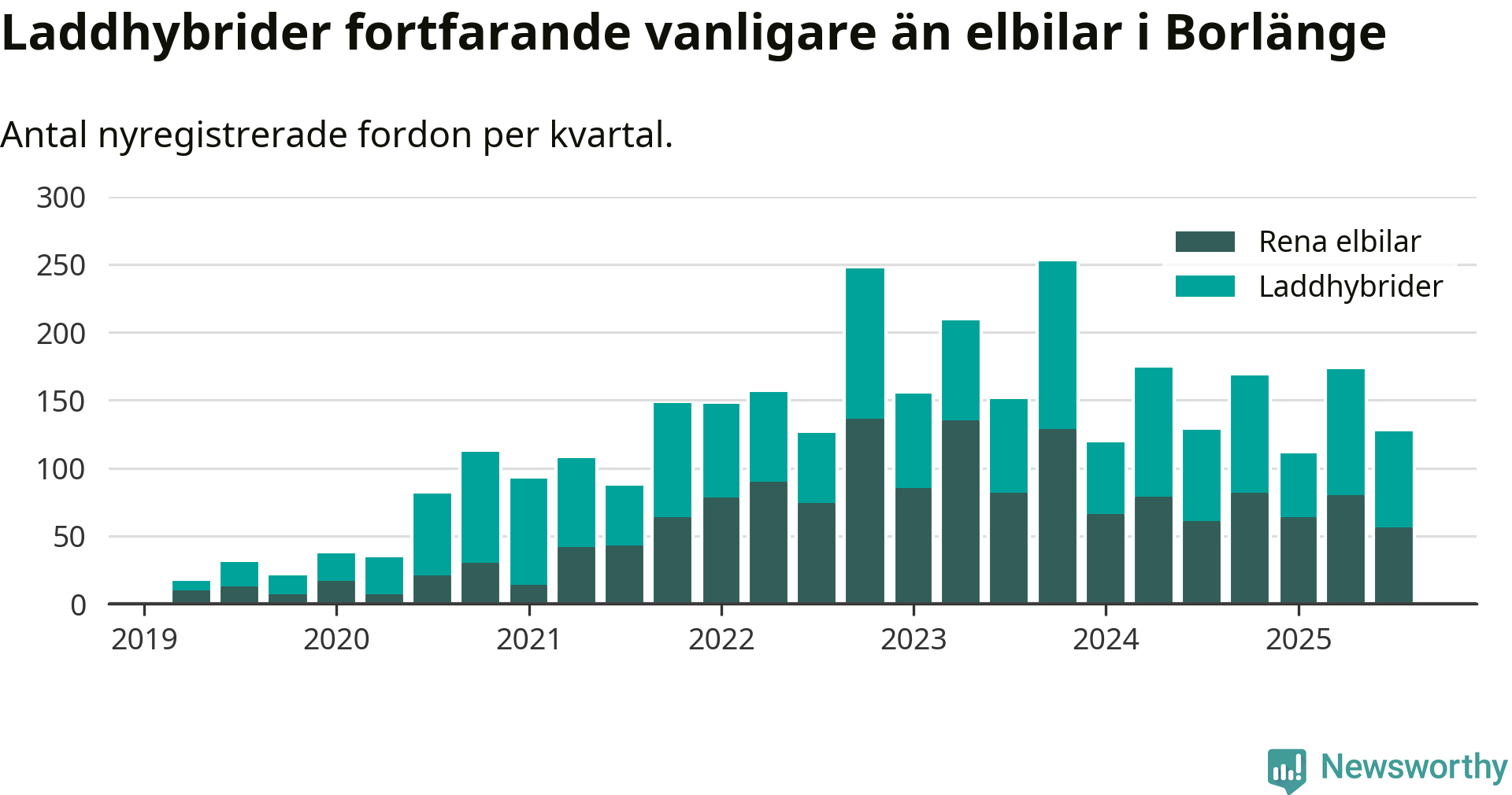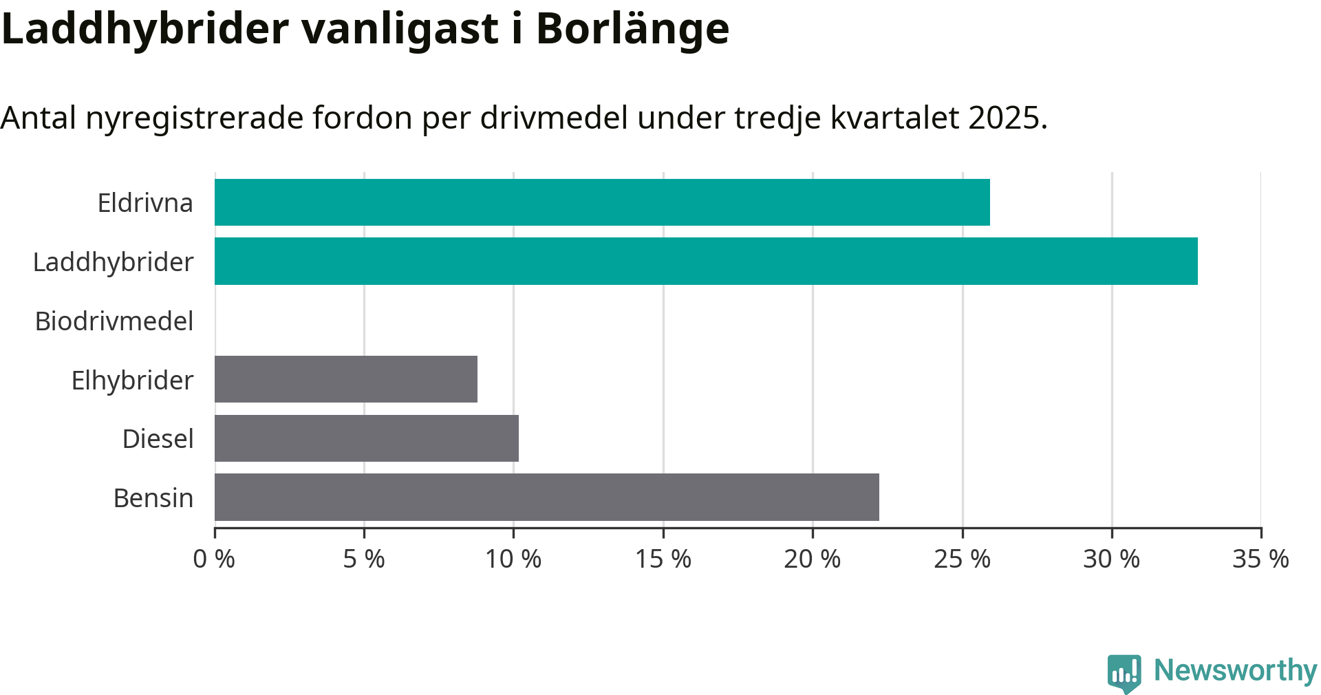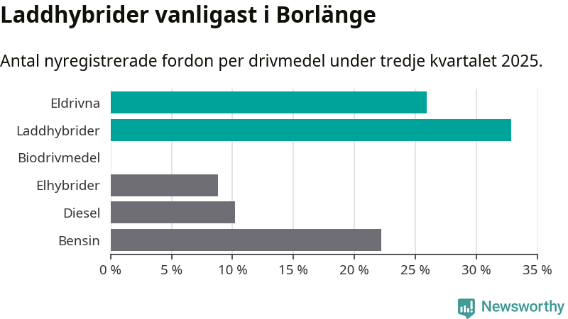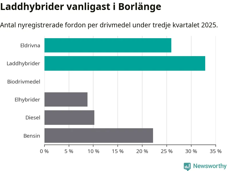 Under tredje kvartalet 2025 var 59 procent av alla nyregistrerade personbilar i Borlänge laddbara (sammanlagt registrerades 216 nya bilar). Merparten av de laddbara bilarna var så kallade laddhybrider, det vill säga fordon som går att ladda och köra på el, men som även har en förbränningsmotor. 26 procent av alla nya bilar var rena elbilar.