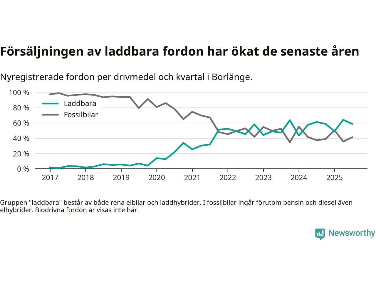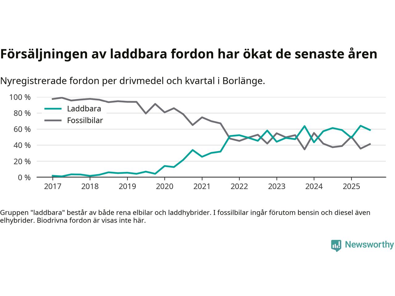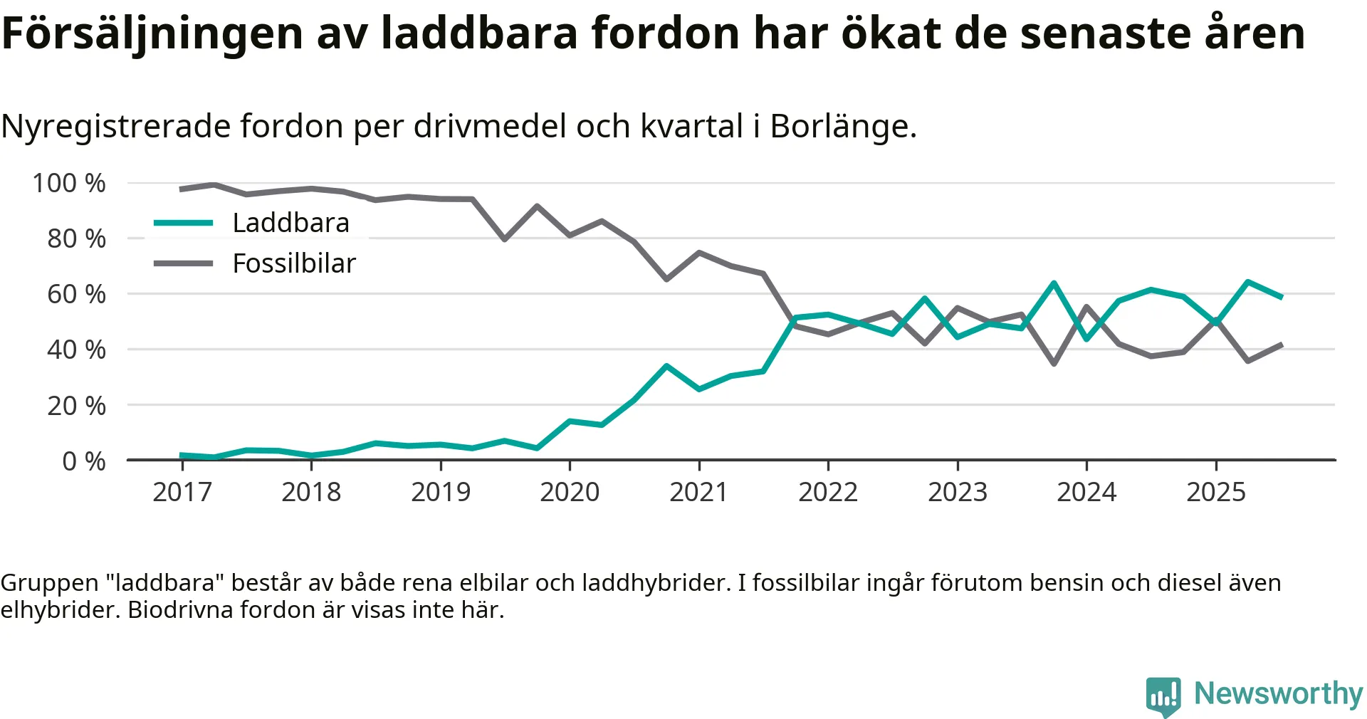 I Borlänge minskade andelen laddbara bilar under tredje kvartalet jämfört med kvartalet innan. Nyregistreringen peakade under andra kvartalet 2025 då 64 procent av de nya bilarna var laddbara.