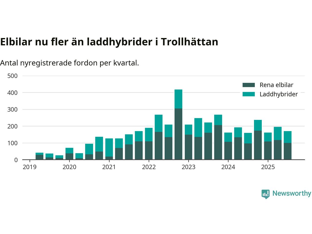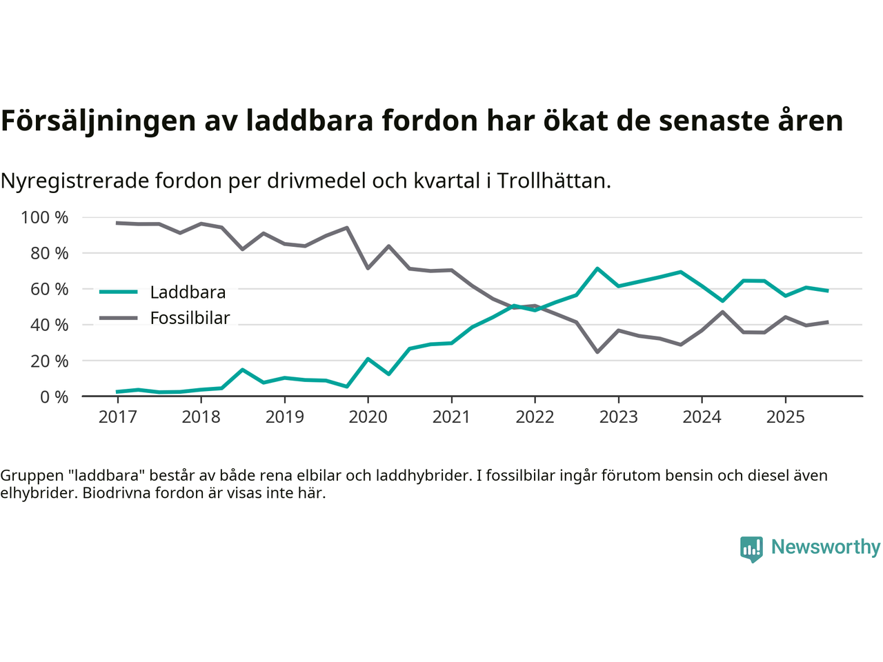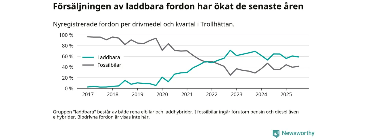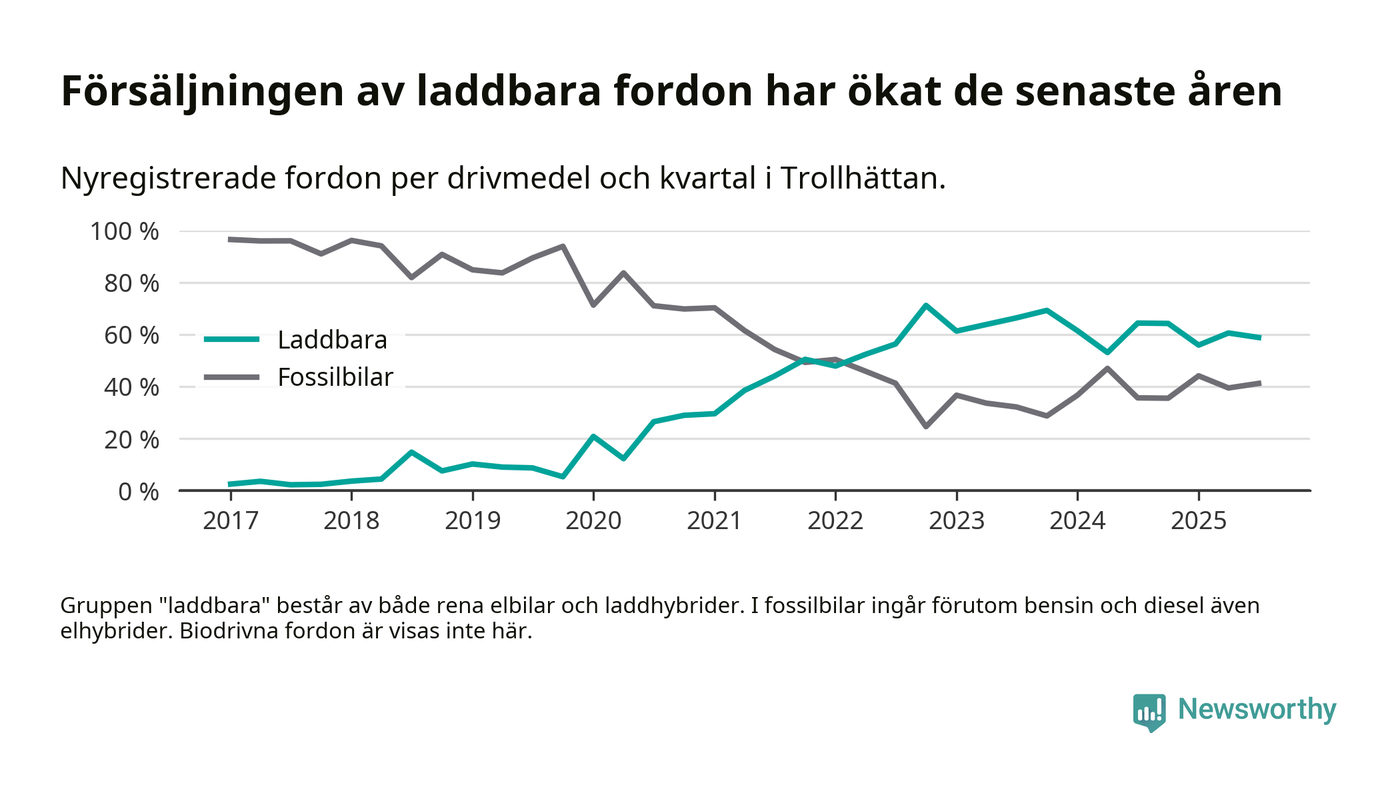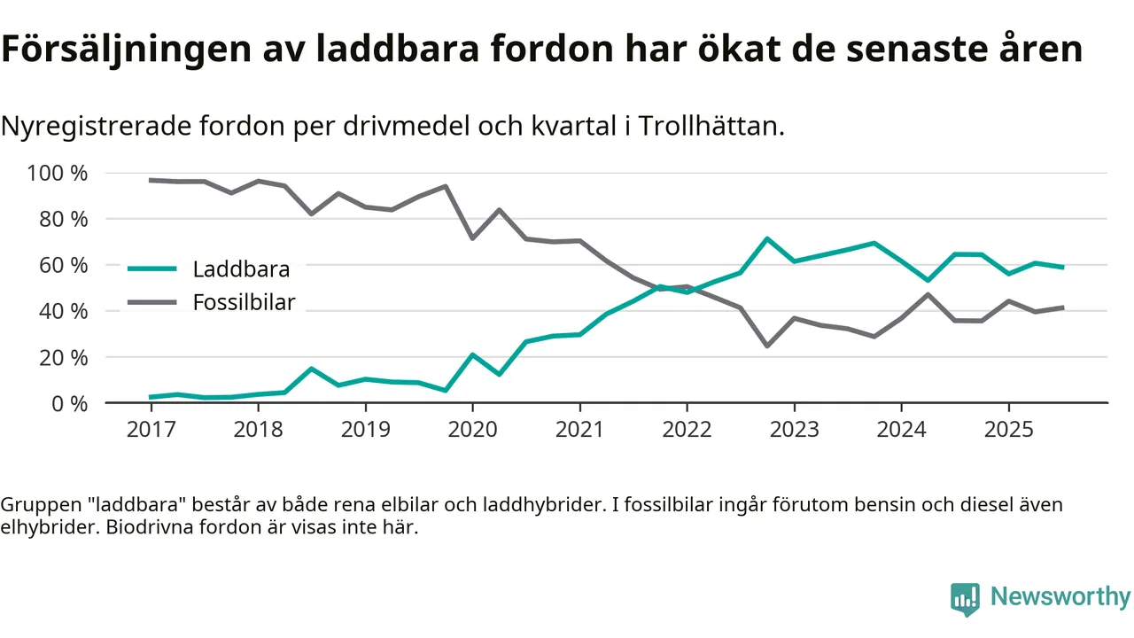 Under tredje kvartalet 2025 var 59 procent av alla nyregistrerade personbilar i Trollhättan laddbara (sammanlagt registrerades 289 nya bilar). Merparten av de laddbara bilarna var rena elbilar (35 procent av alla).