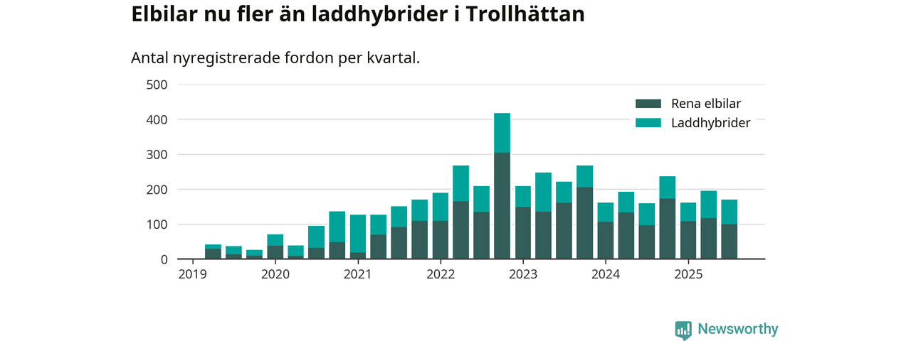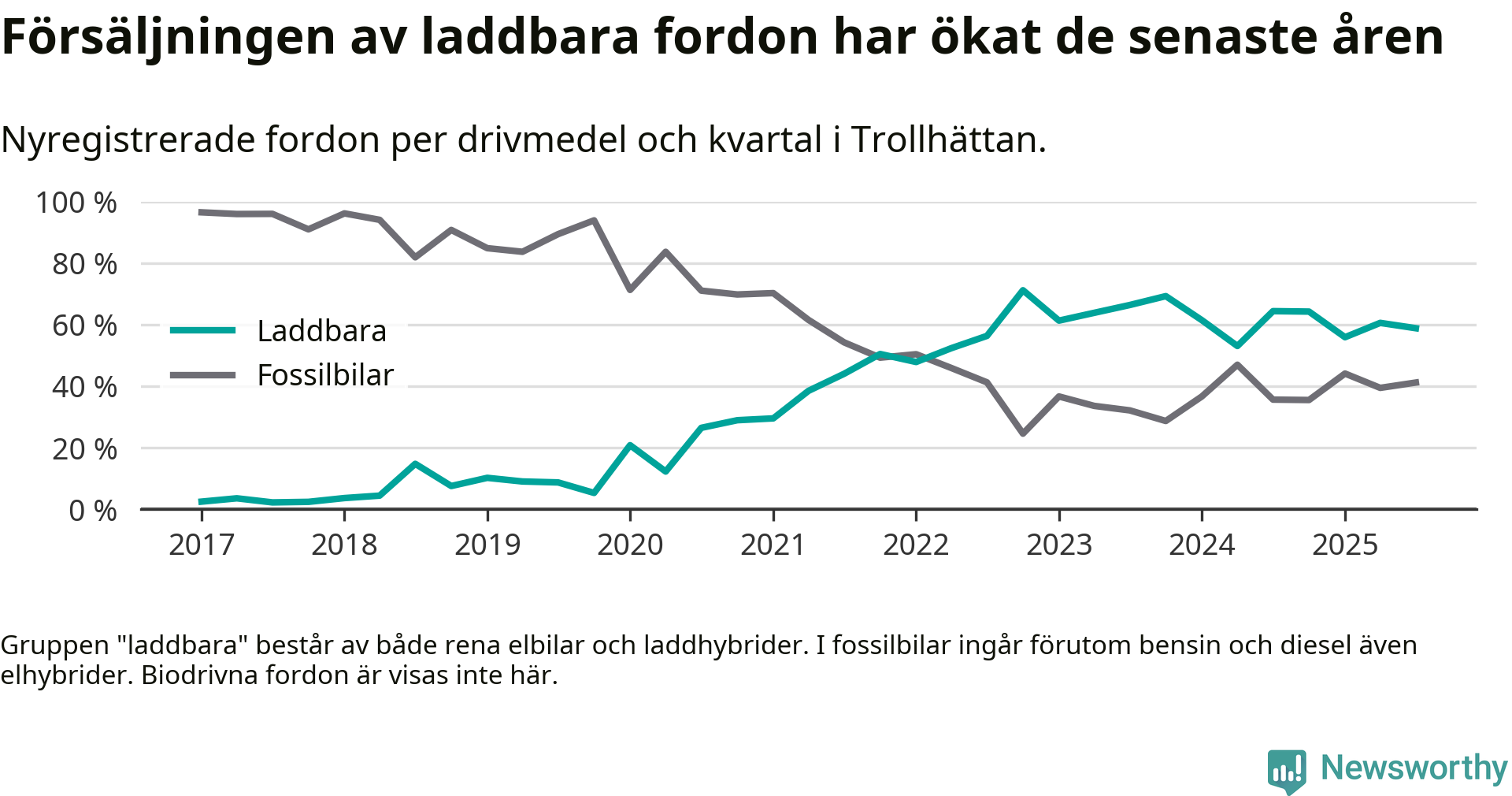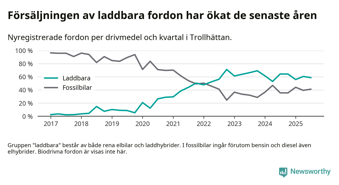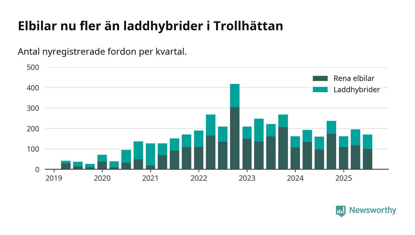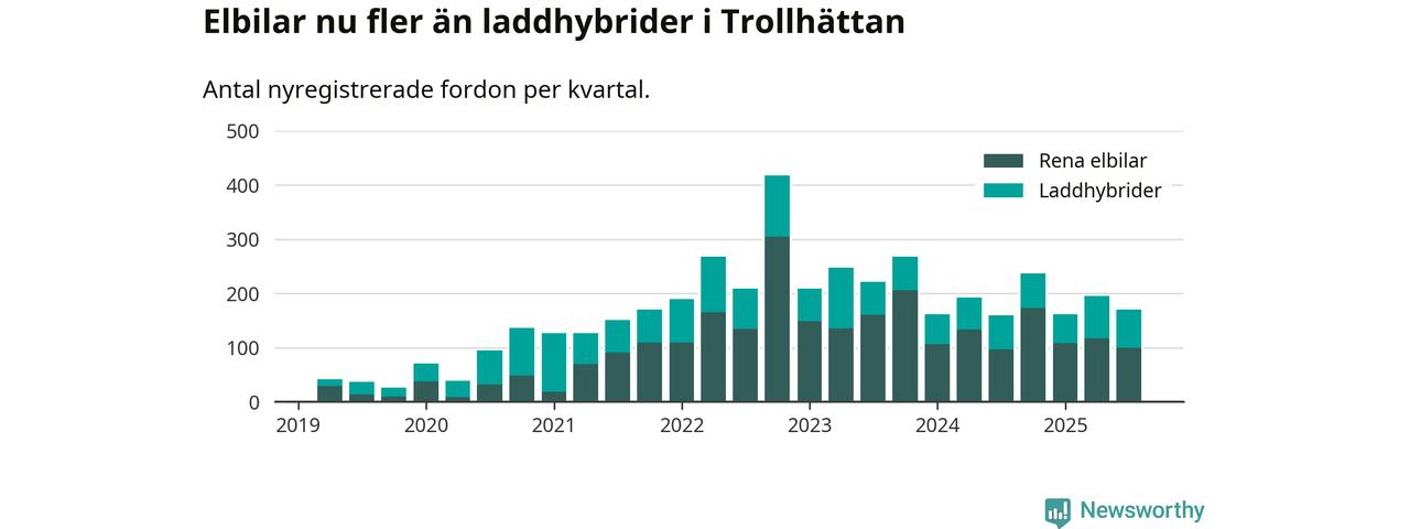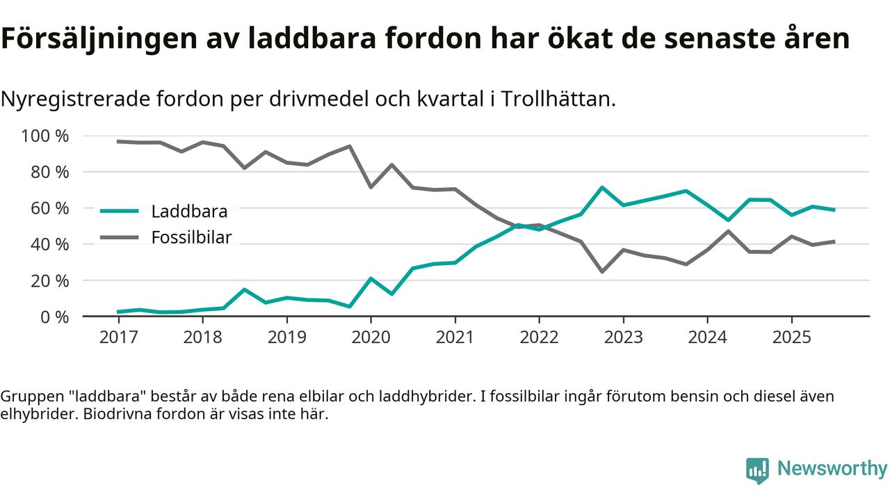 Under tredje kvartalet 2025 var 59 procent av alla nyregistrerade personbilar i Trollhättan laddbara (sammanlagt registrerades 289 nya bilar). Merparten av de laddbara bilarna var rena elbilar (35 procent av alla).