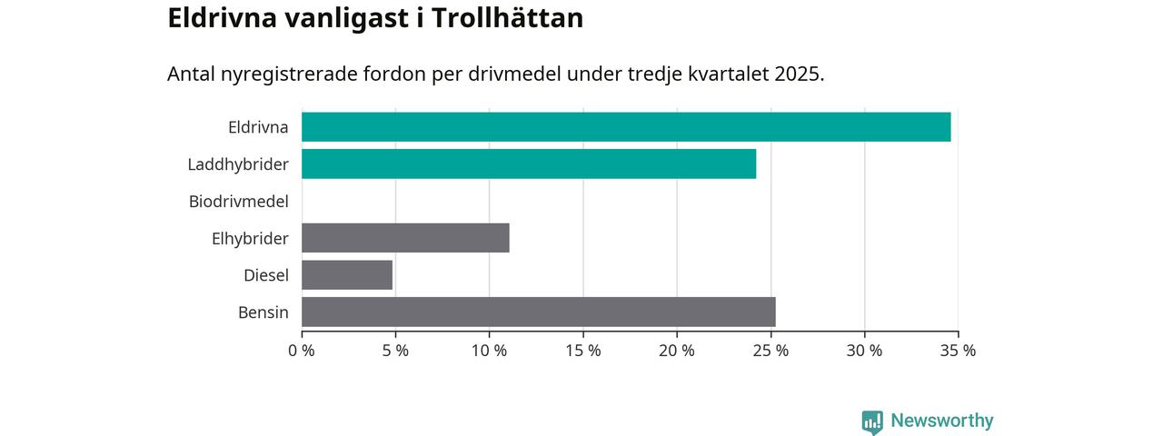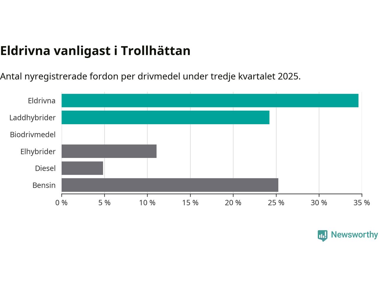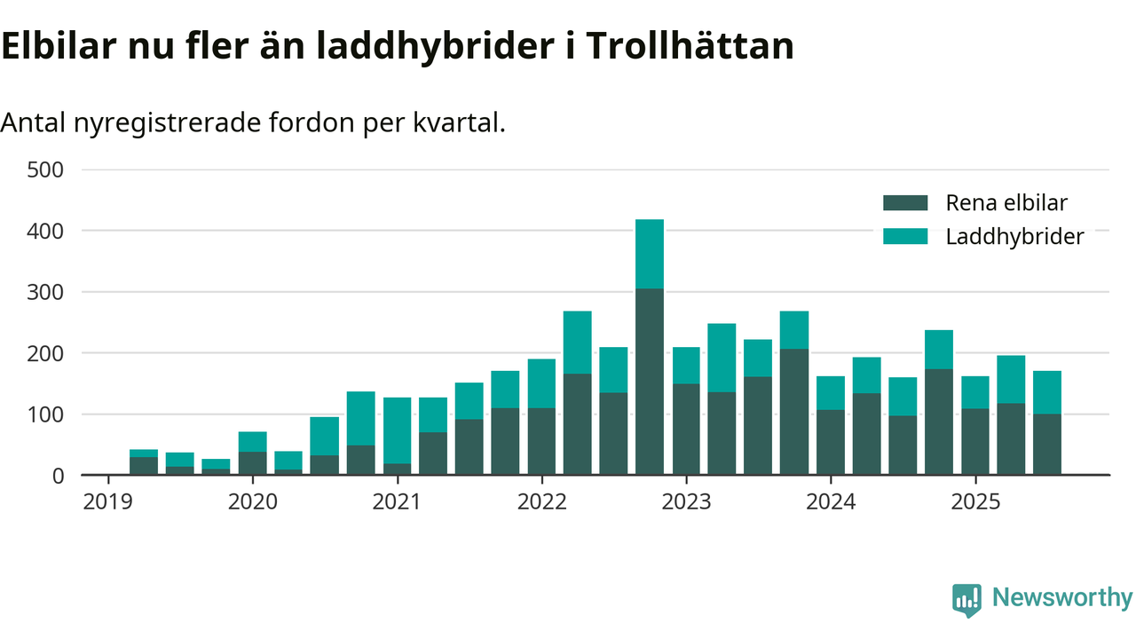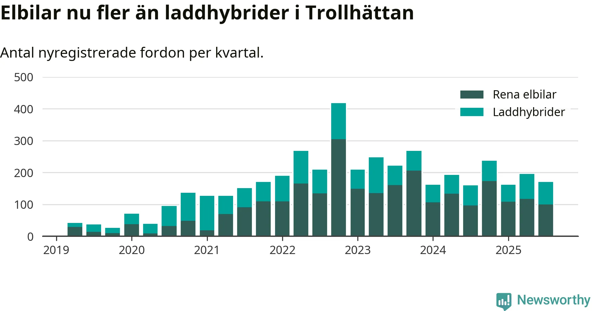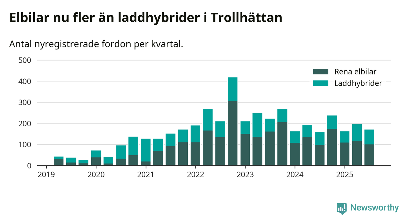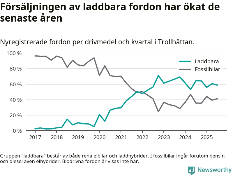 Under tredje kvartalet 2025 var 59 procent av alla nyregistrerade personbilar i Trollhättan laddbara (sammanlagt registrerades 289 nya bilar). Merparten av de laddbara bilarna var rena elbilar (35 procent av alla).