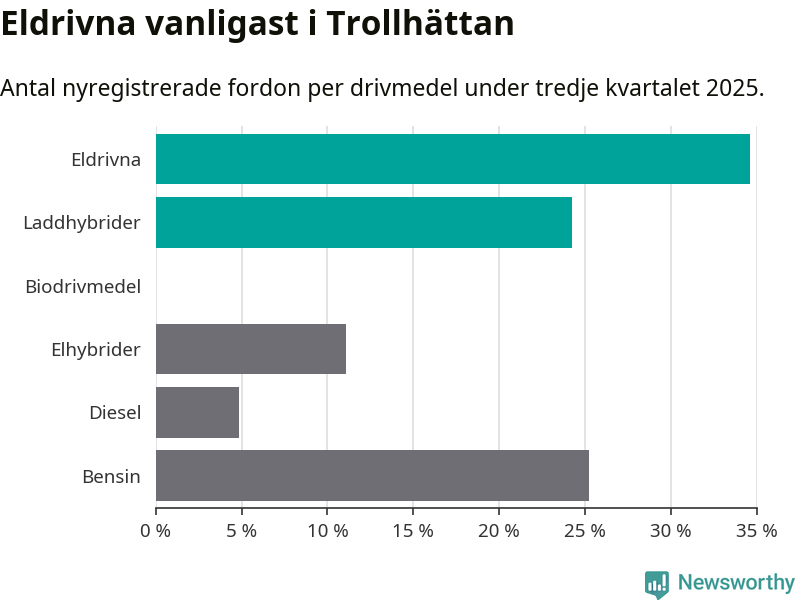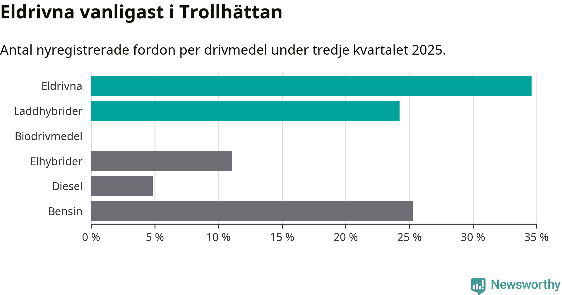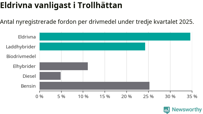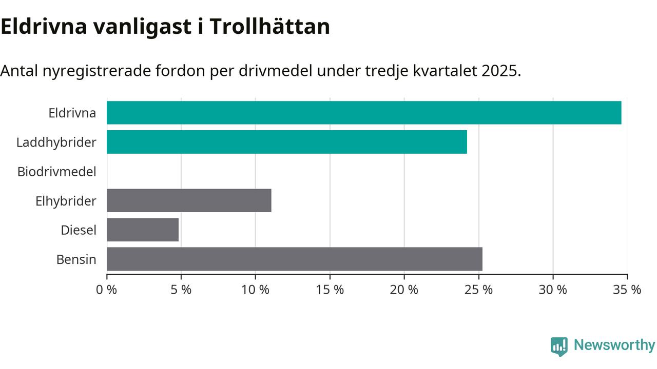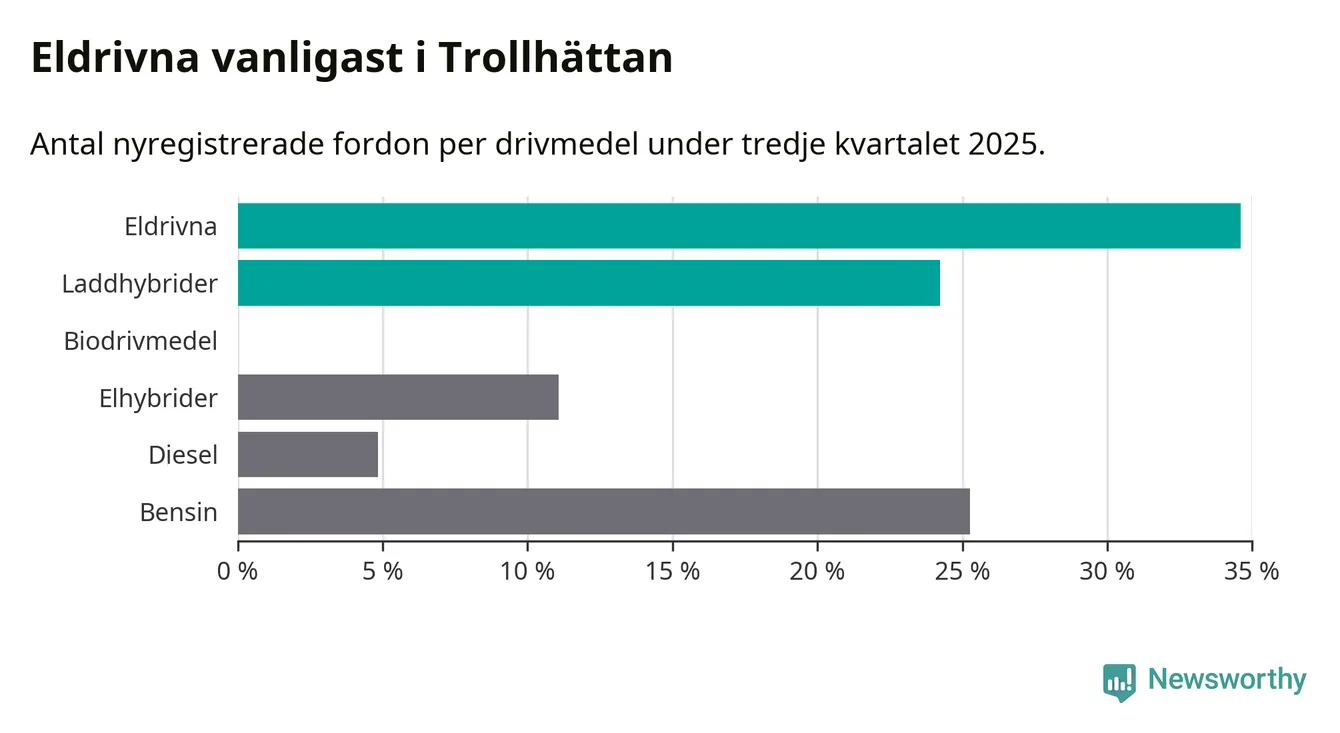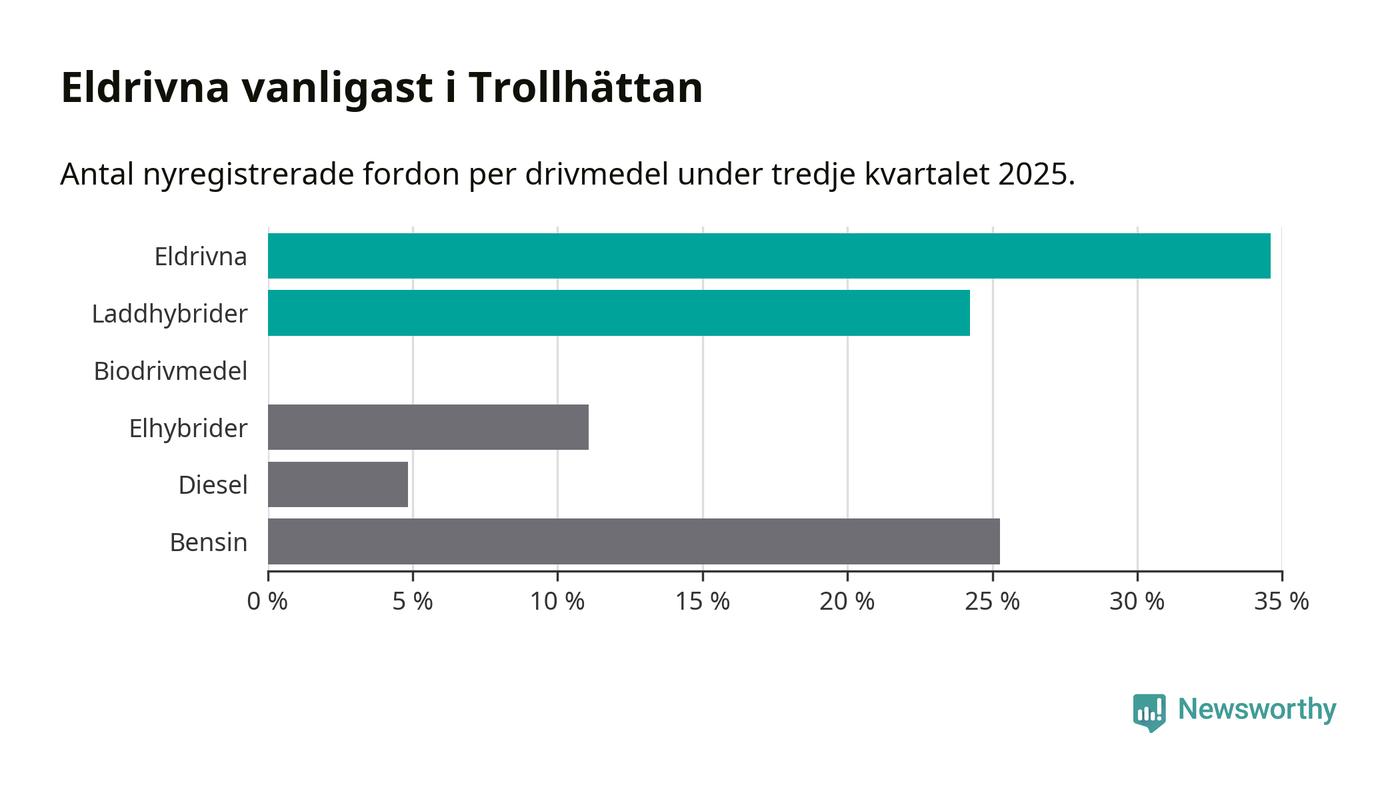 Under tredje kvartalet 2025 var 59 procent av alla nyregistrerade personbilar i Trollhättan laddbara (sammanlagt registrerades 289 nya bilar). Merparten av de laddbara bilarna var rena elbilar (35 procent av alla).