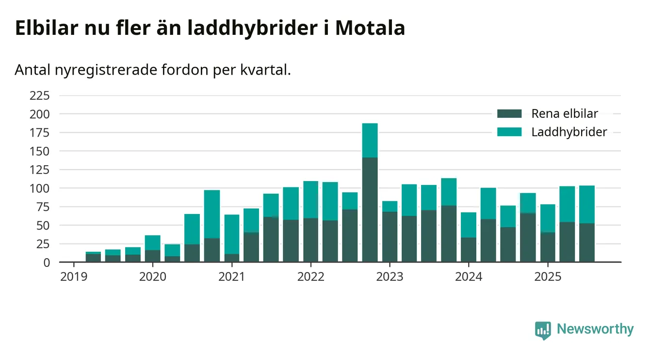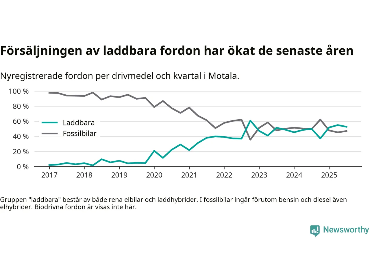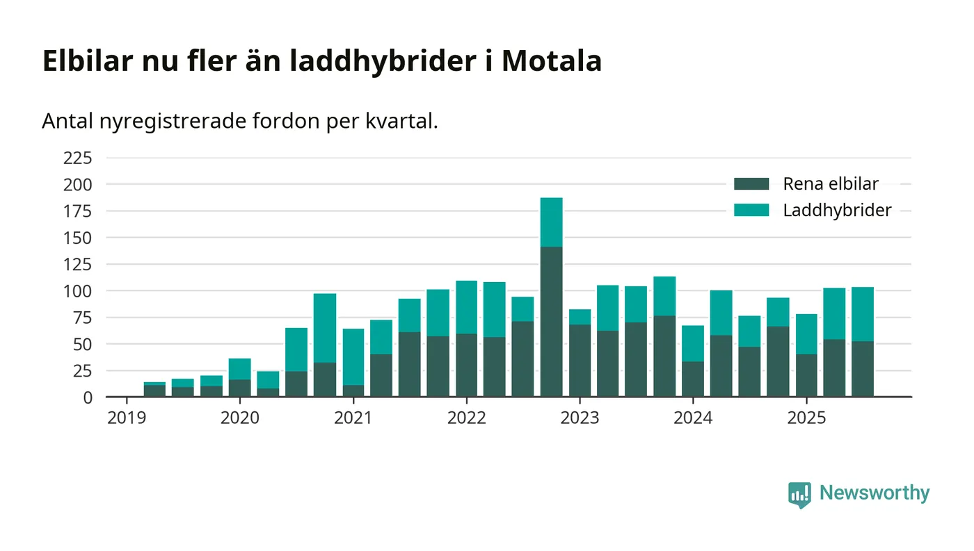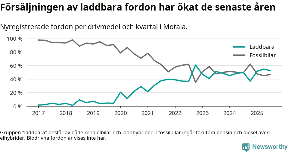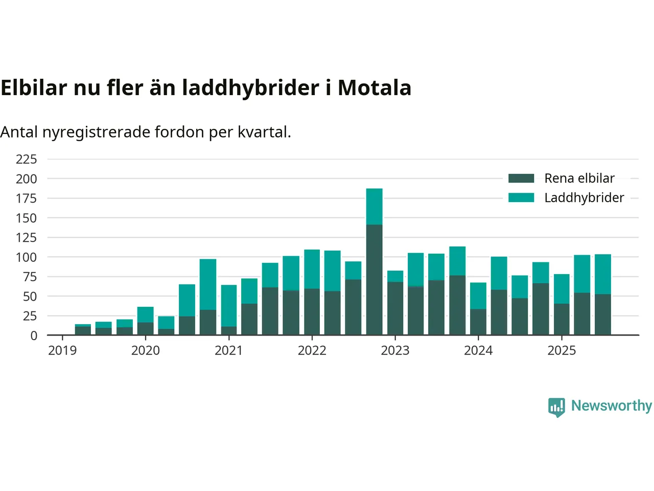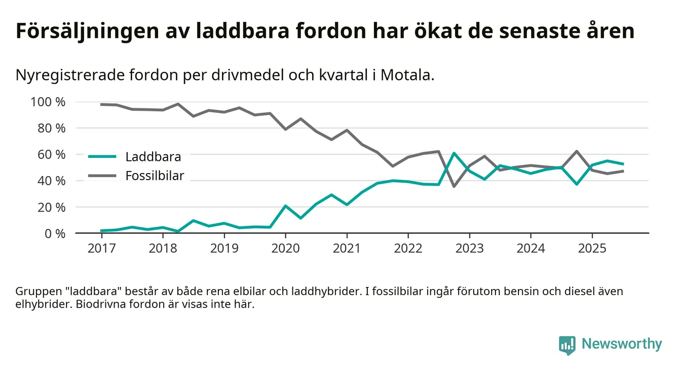 Under tredje kvartalet 2025 var 53 procent av alla nyregistrerade personbilar i Motala laddbara (sammanlagt registrerades 196 nya bilar). Merparten av de laddbara bilarna var rena elbilar (27 procent av alla).