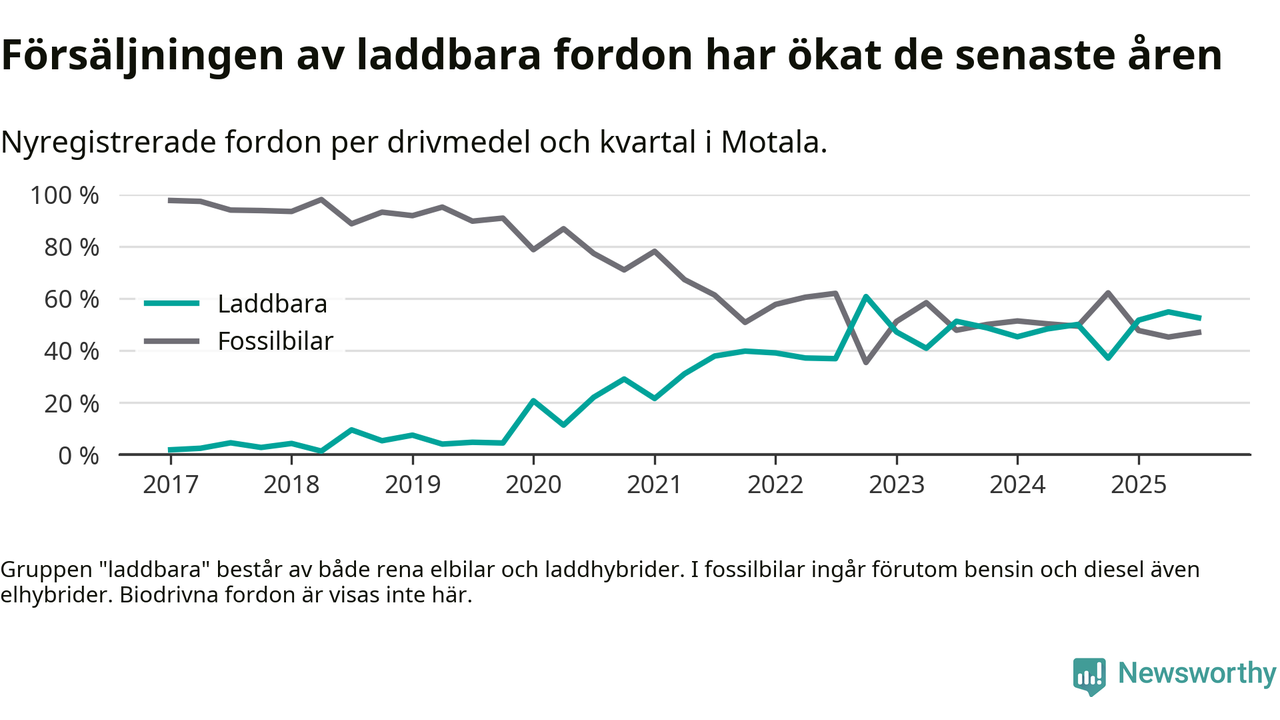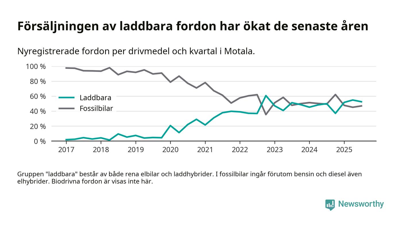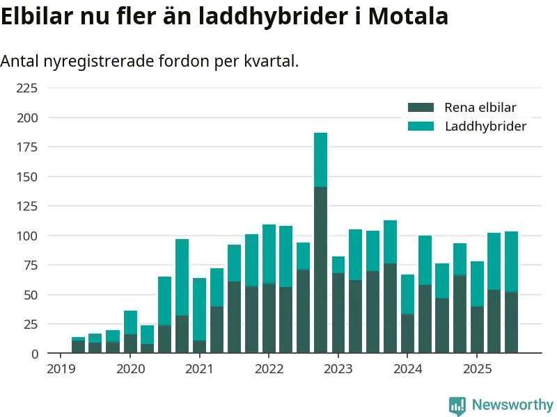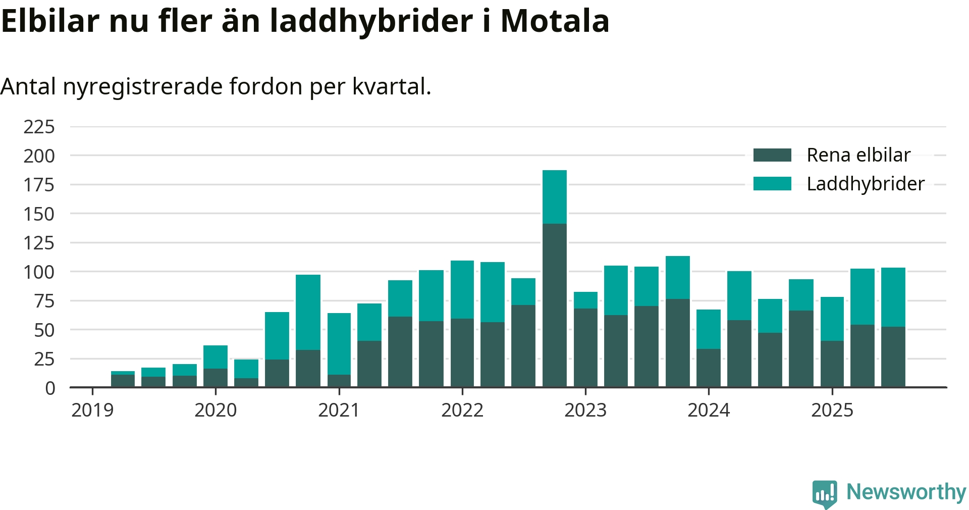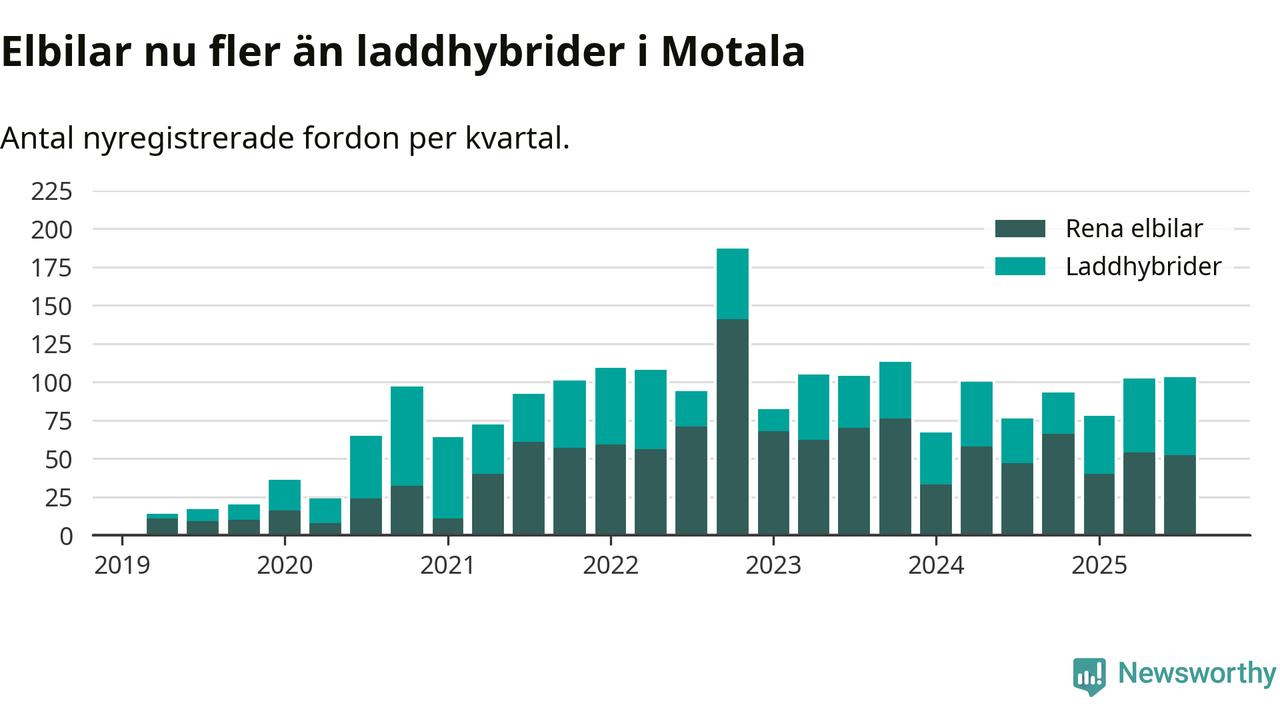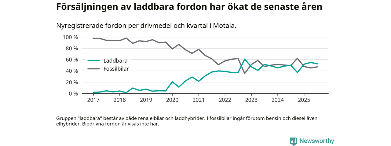 Under tredje kvartalet 2025 var 53 procent av alla nyregistrerade personbilar i Motala laddbara (sammanlagt registrerades 196 nya bilar). Merparten av de laddbara bilarna var rena elbilar (27 procent av alla).