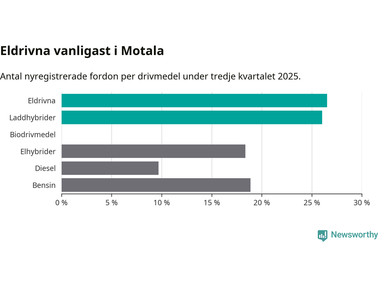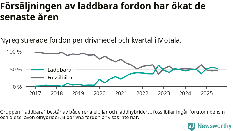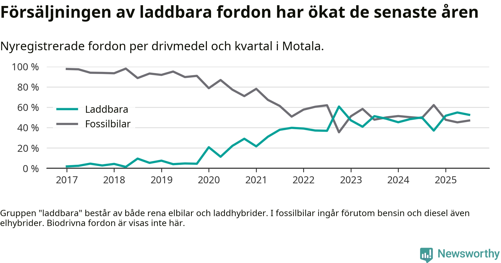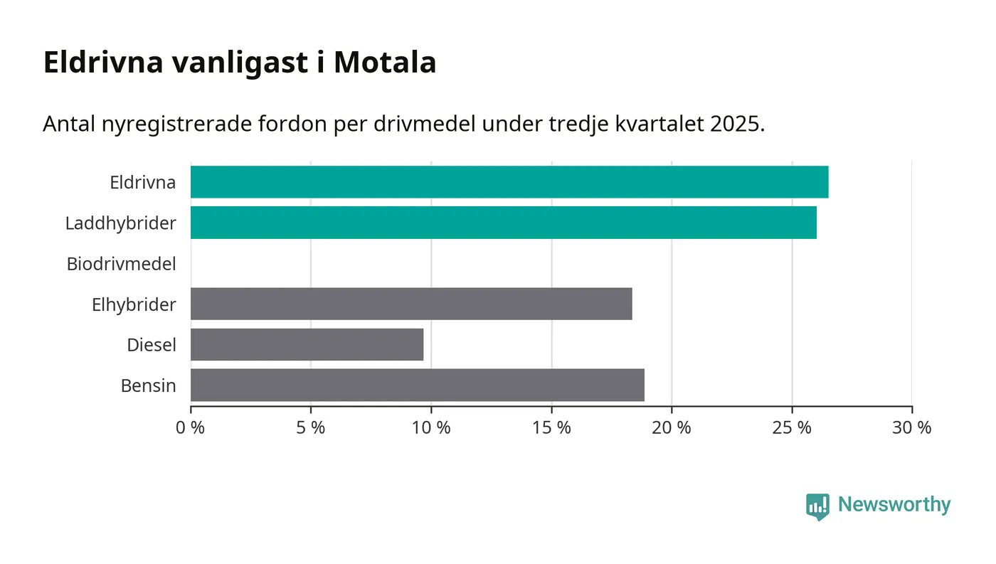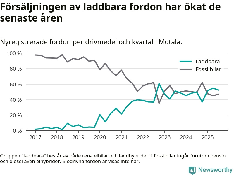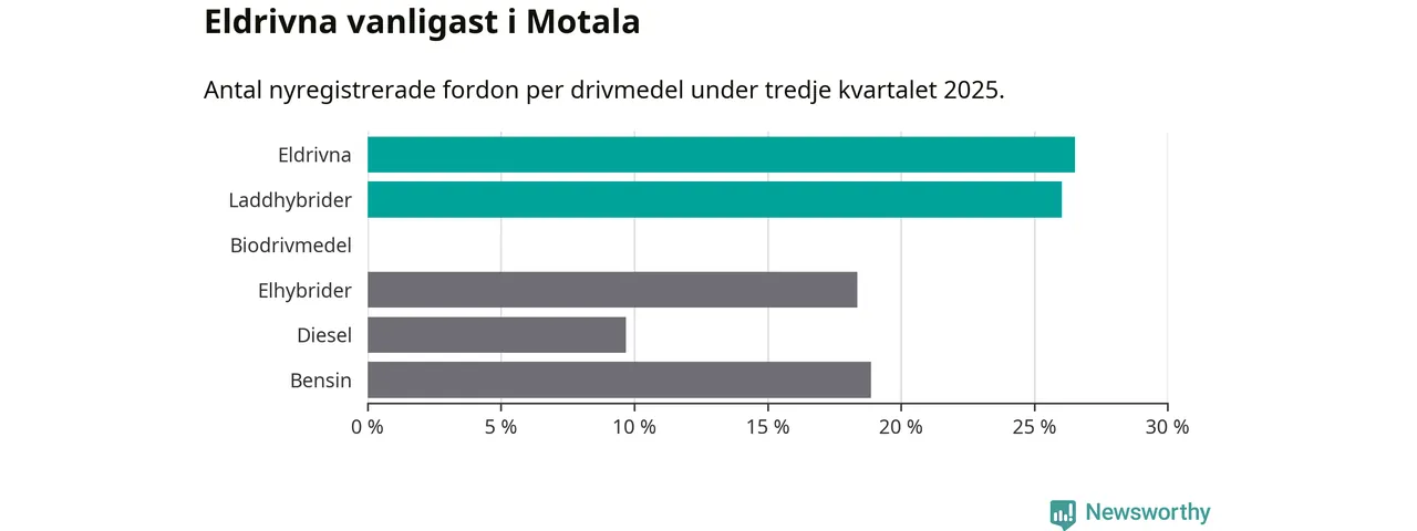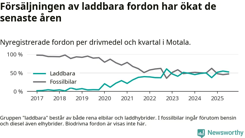Under tredje kvartalet 2025 var 53 procent av alla nyregistrerade personbilar i Motala laddbara (sammanlagt registrerades 196 nya bilar). Merparten av de laddbara bilarna var rena elbilar (27 procent av alla).