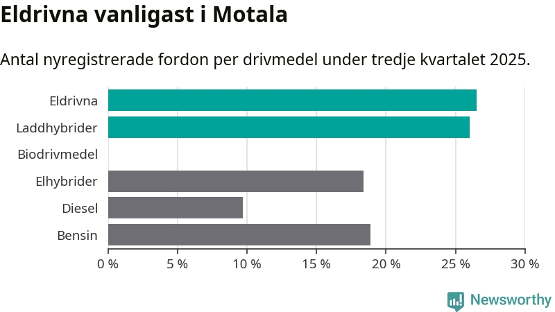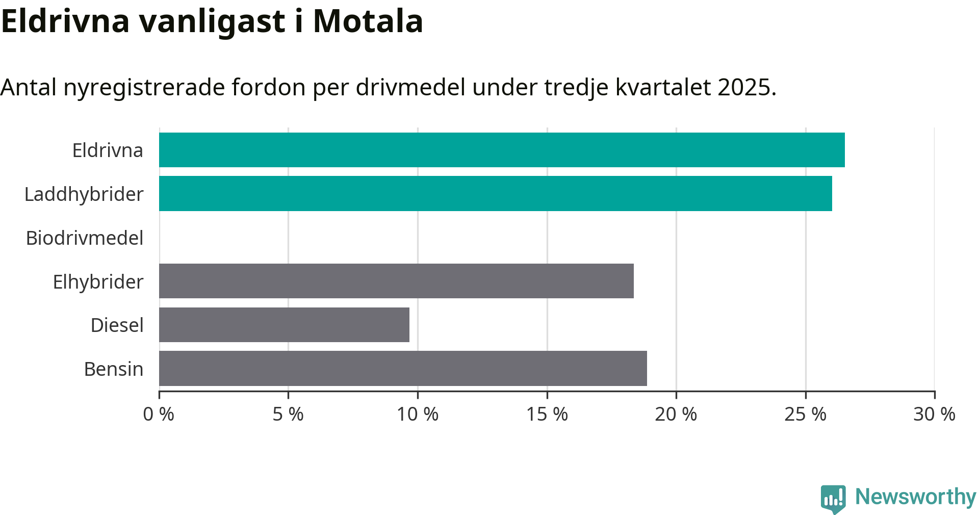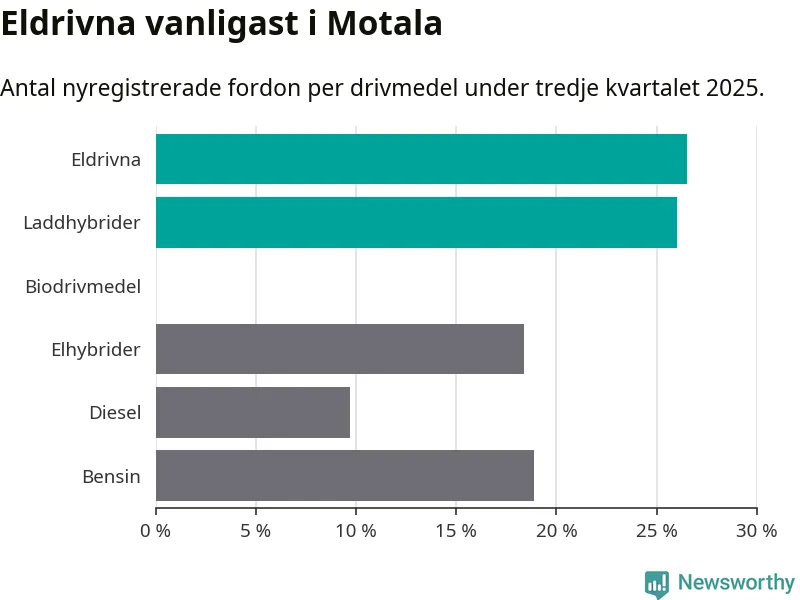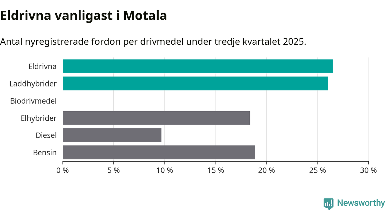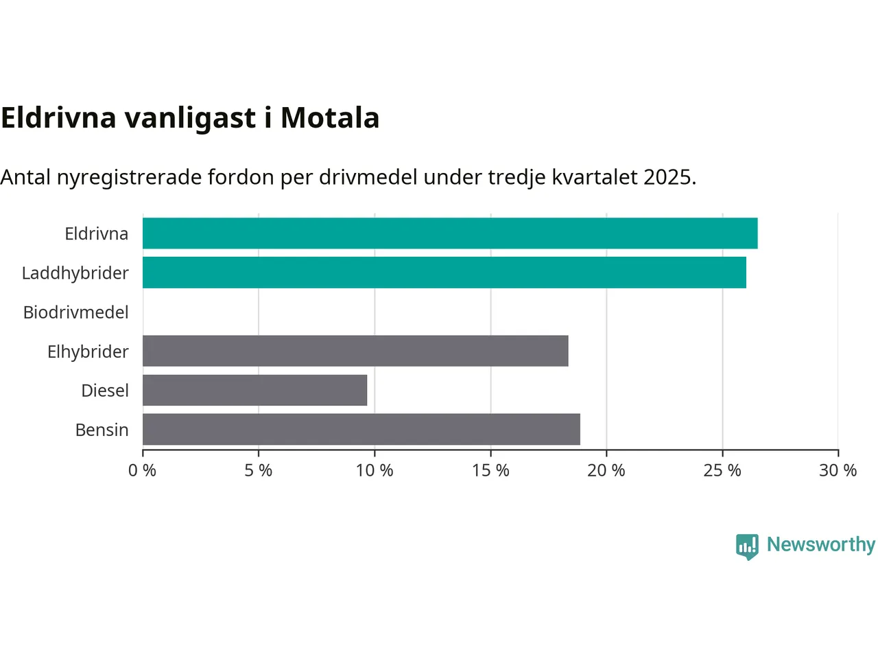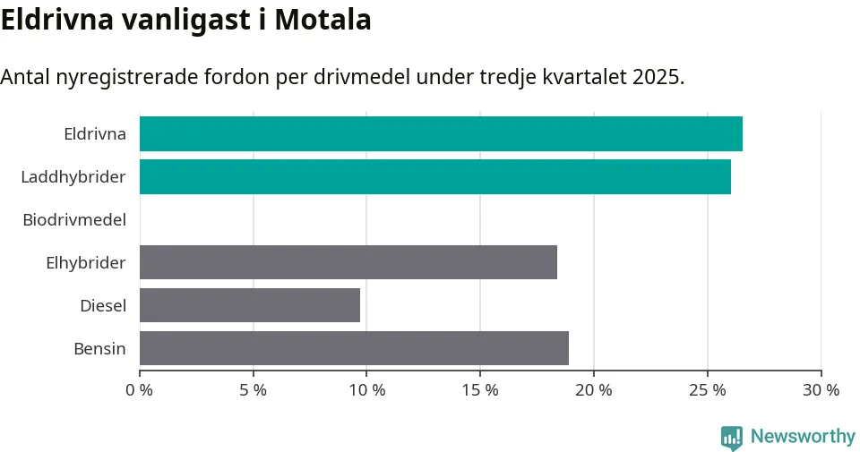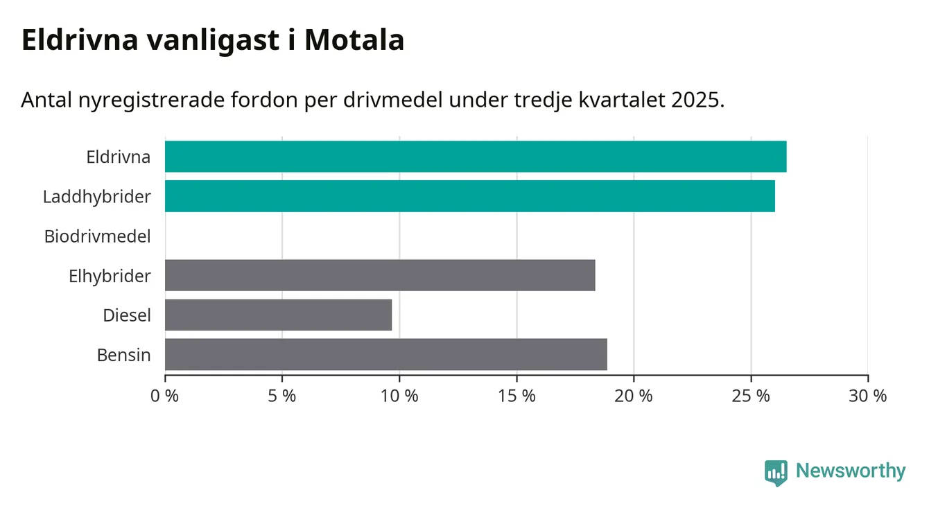 Under tredje kvartalet 2025 var 53 procent av alla nyregistrerade personbilar i Motala laddbara (sammanlagt registrerades 196 nya bilar). Merparten av de laddbara bilarna var rena elbilar (27 procent av alla).