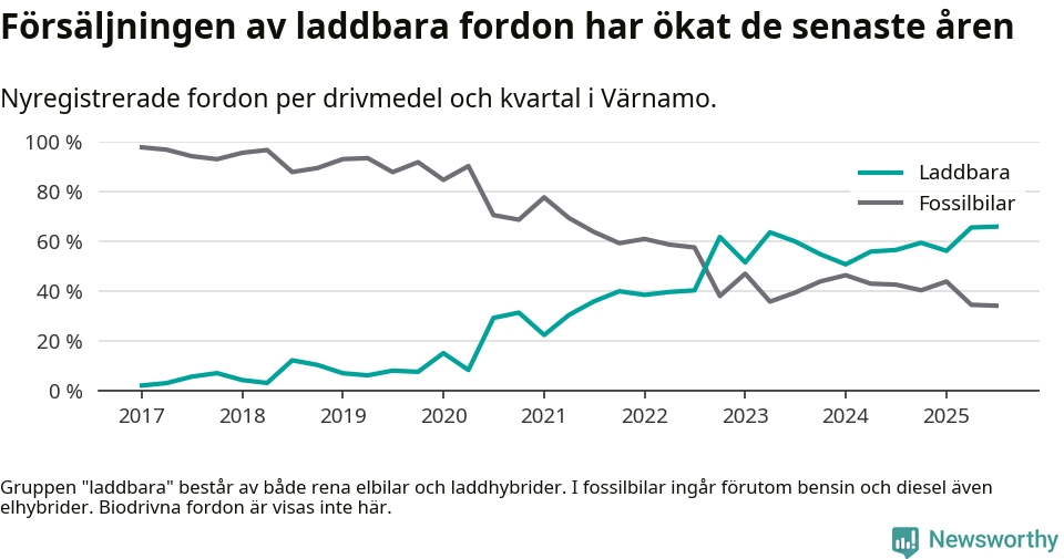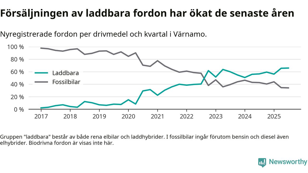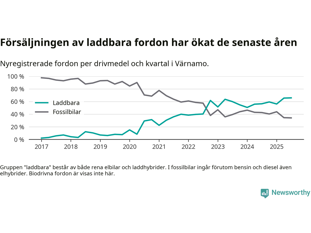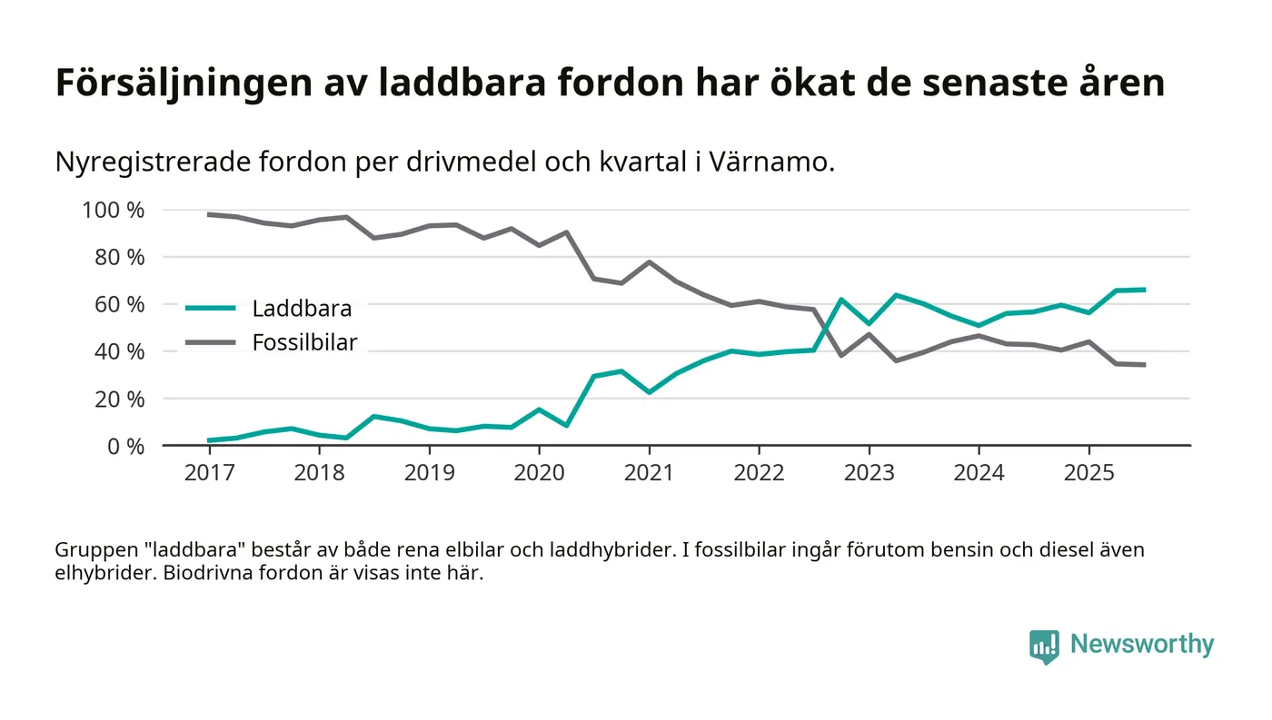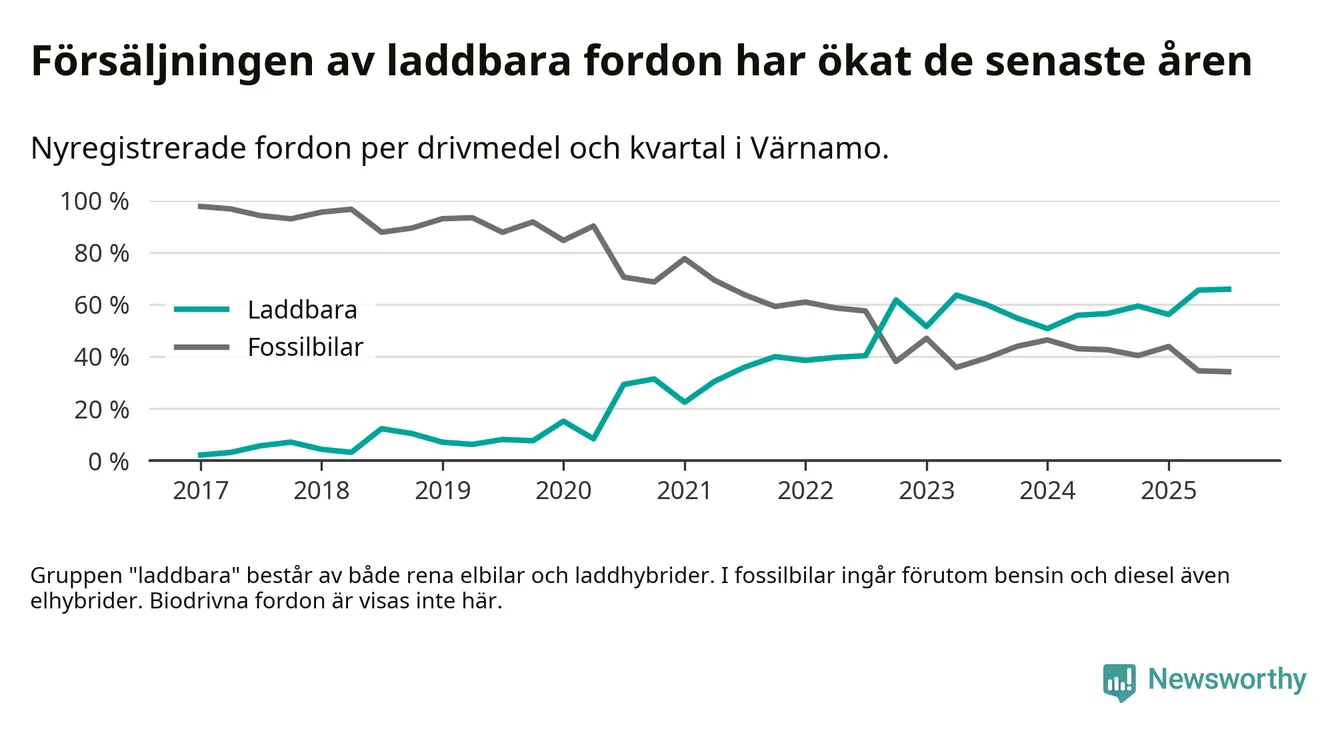 Under tredje kvartalet 2025 var 66 procent av alla nyregistrerade personbilar i Värnamo laddbara (sammanlagt registrerades 328 nya bilar). Merparten av de laddbara bilarna var rena elbilar (36 procent av alla).