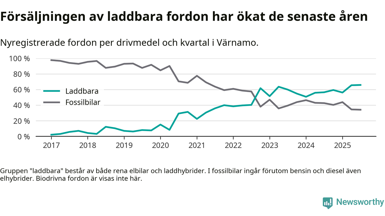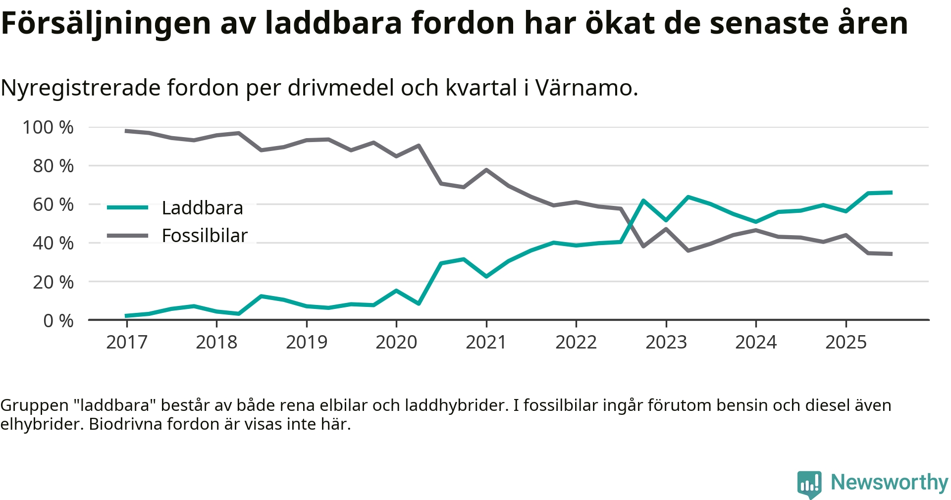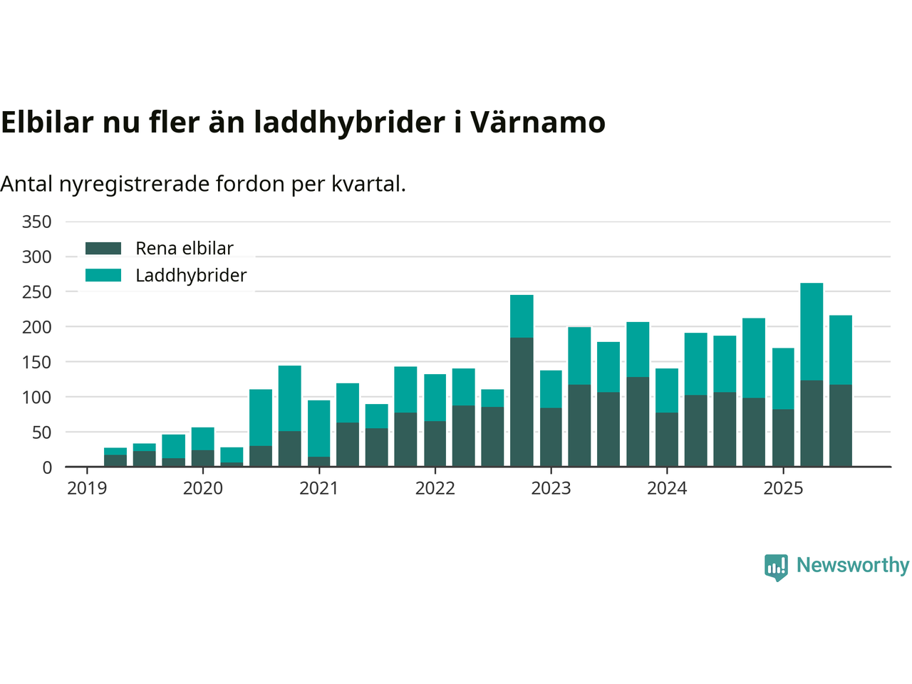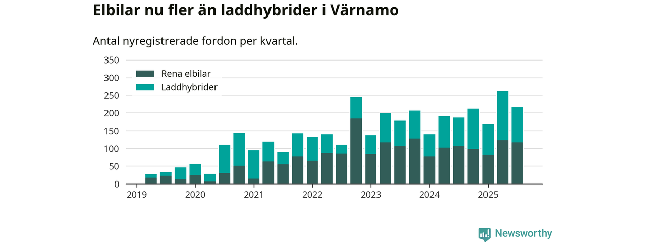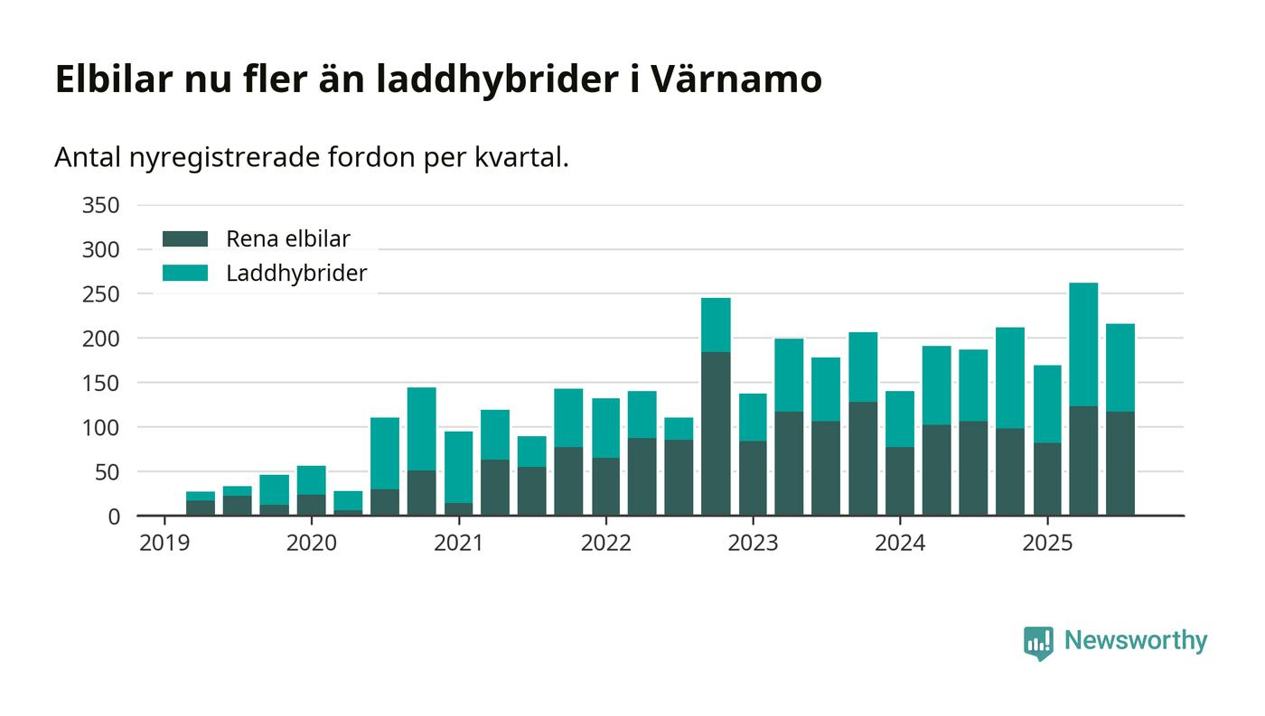 Under tredje kvartalet 2025 var 66 procent av alla nyregistrerade personbilar i Värnamo laddbara (sammanlagt registrerades 328 nya bilar). Merparten av de laddbara bilarna var rena elbilar (36 procent av alla).