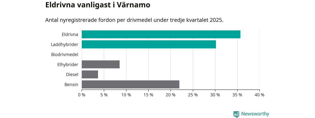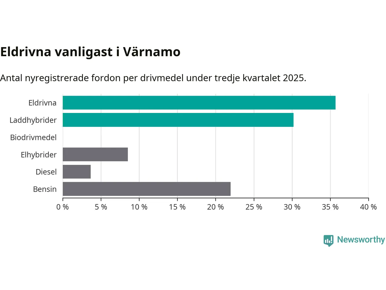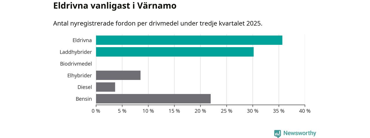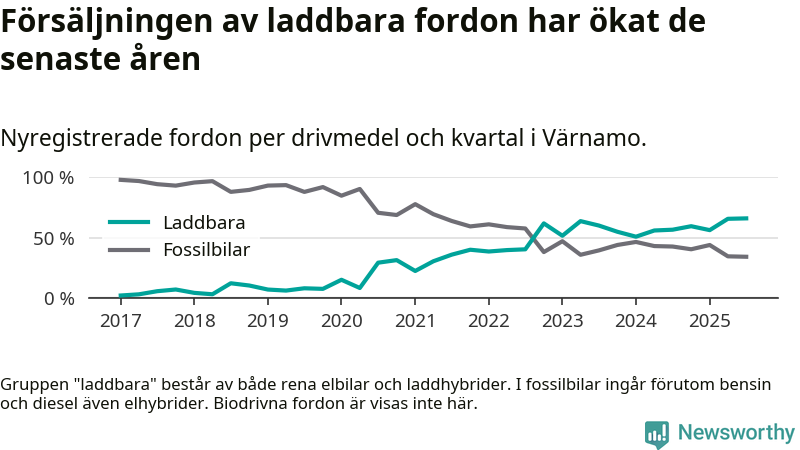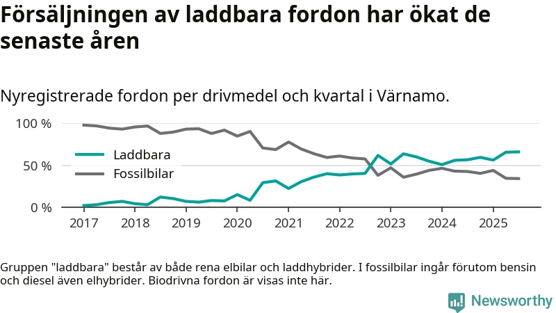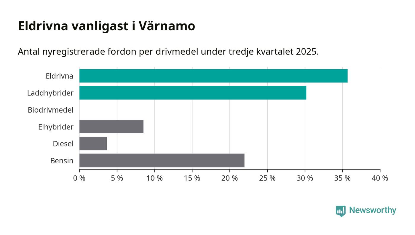 Under tredje kvartalet 2025 var 66 procent av alla nyregistrerade personbilar i Värnamo laddbara (sammanlagt registrerades 328 nya bilar). Merparten av de laddbara bilarna var rena elbilar (36 procent av alla).