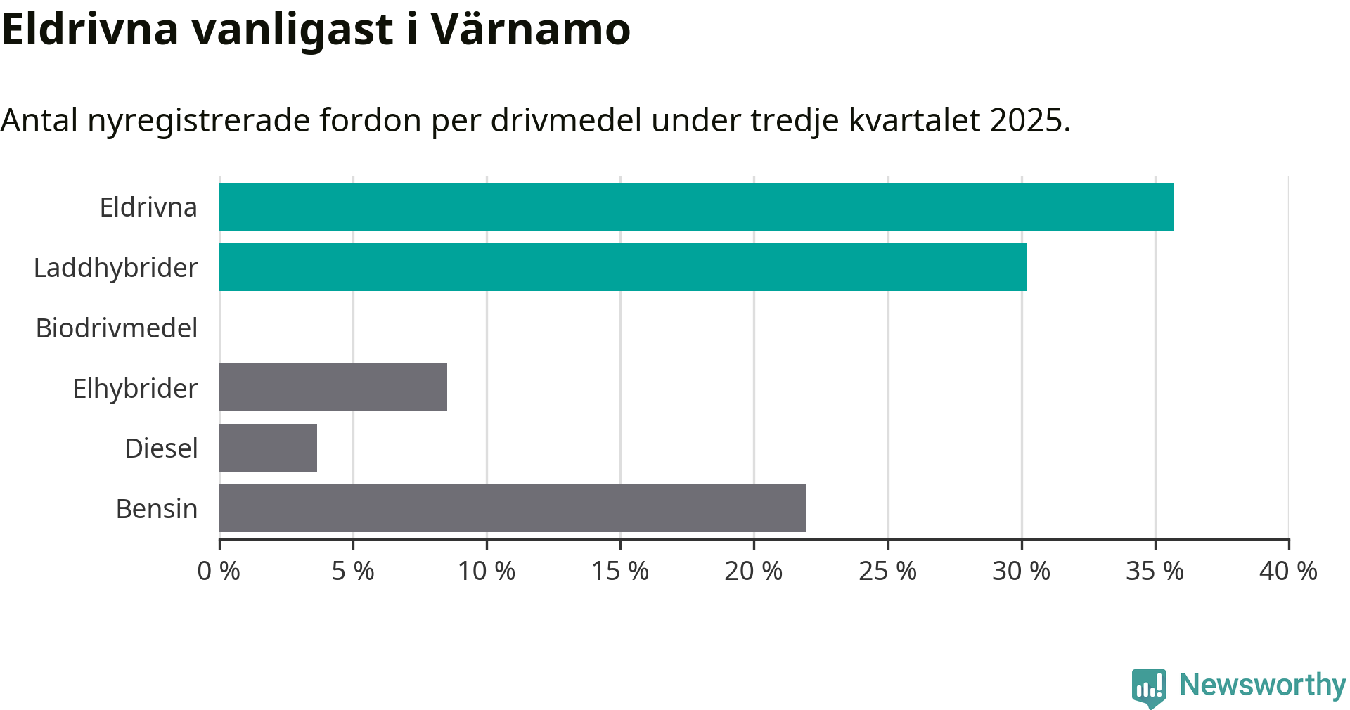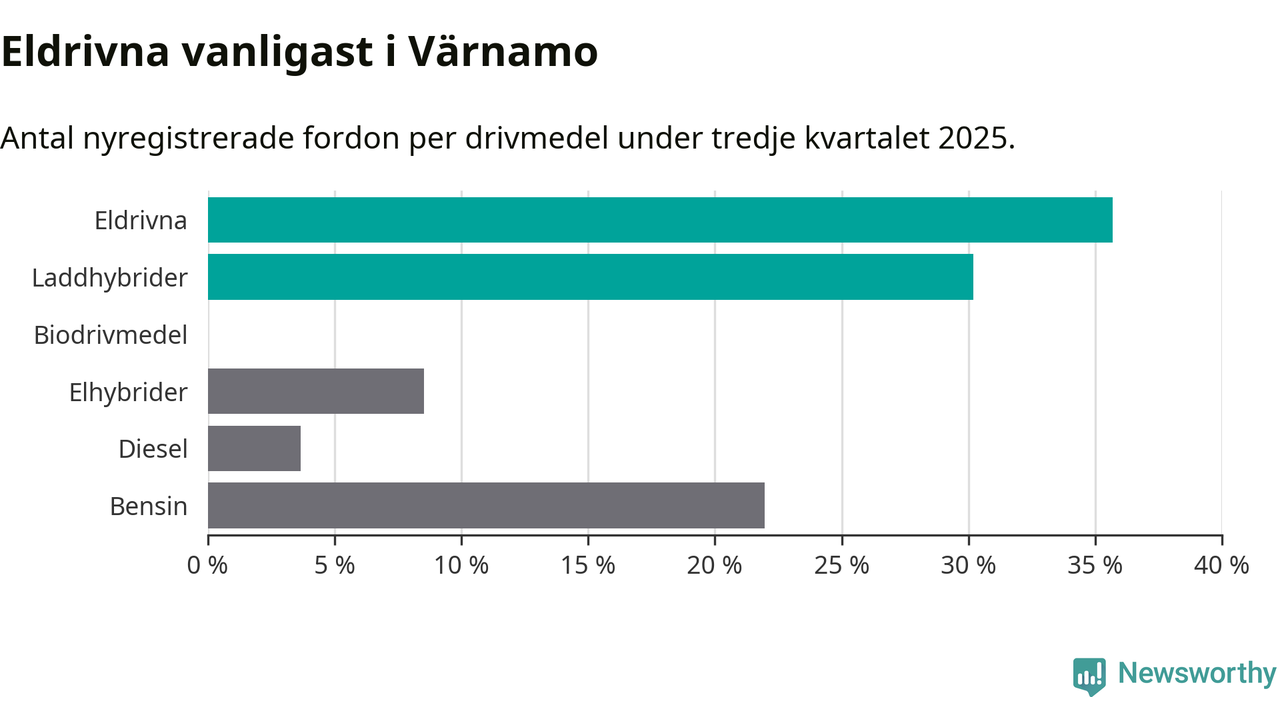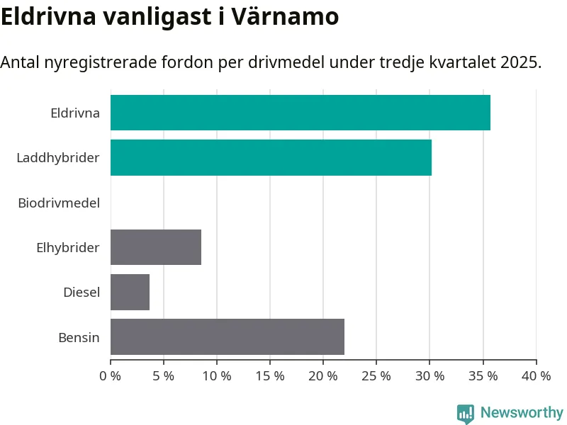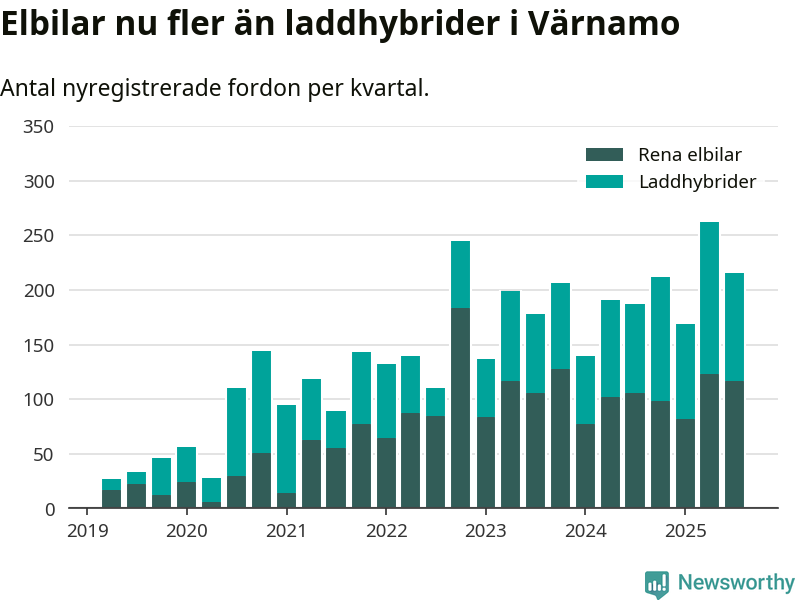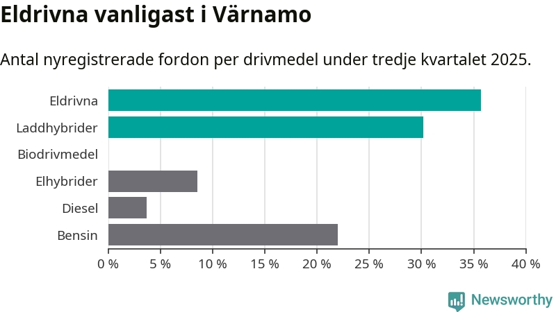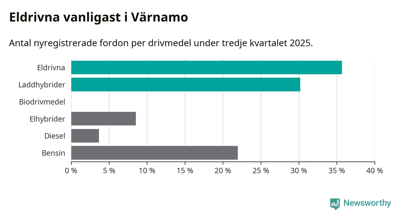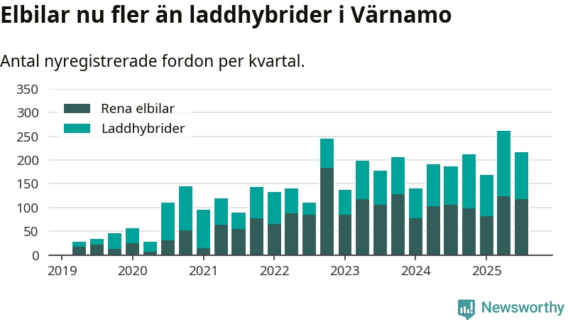 Under tredje kvartalet 2025 var 66 procent av alla nyregistrerade personbilar i Värnamo laddbara (sammanlagt registrerades 328 nya bilar). Merparten av de laddbara bilarna var rena elbilar (36 procent av alla).