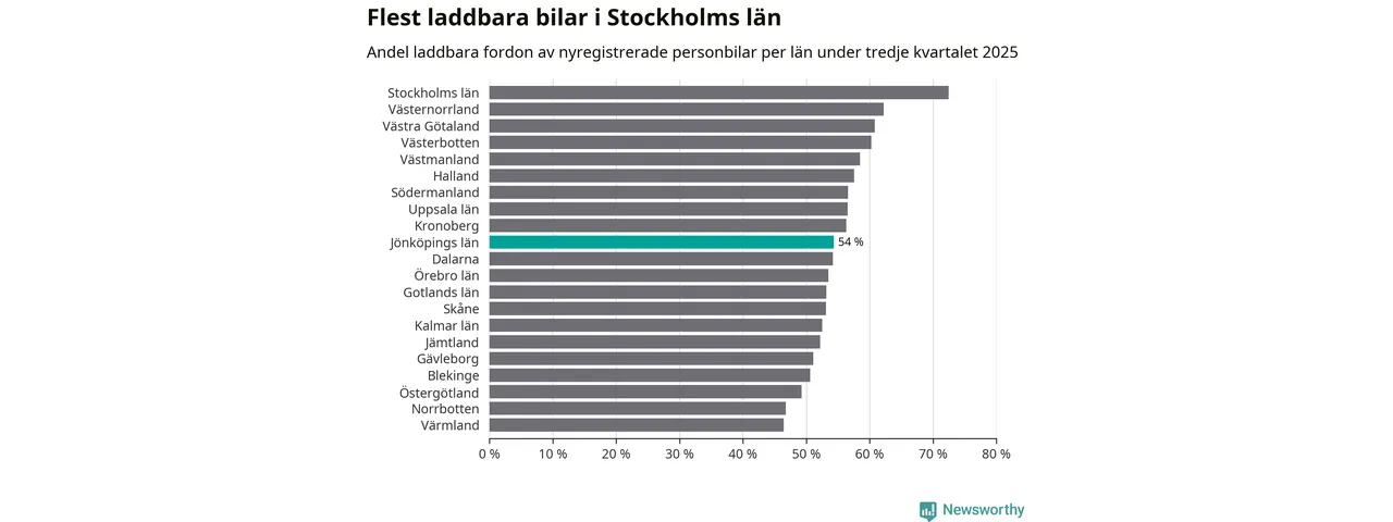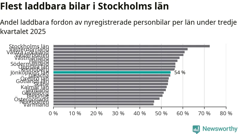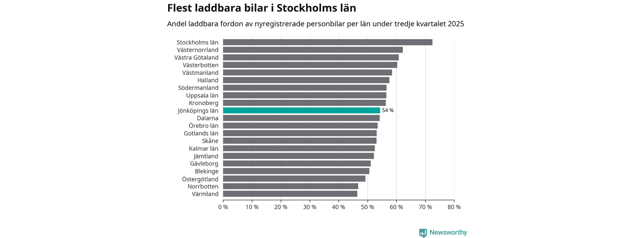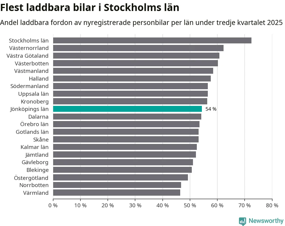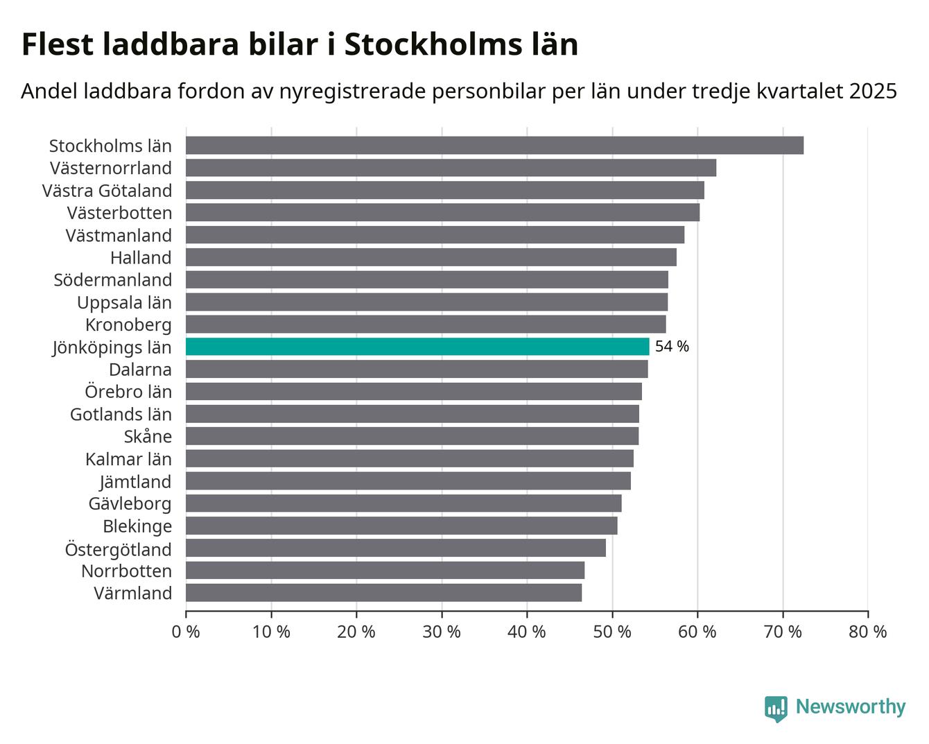 I hela landet var 62 procent av alla nya bilar laddbara under tredje kvartalet. Det är något färre än föregående kvartal (−0,5 procentenheter). I Jönköpings län var 54 procent av de nya bilarna laddbara, vilket är något färre än föregående kvartal (−0,6 procentenheter).