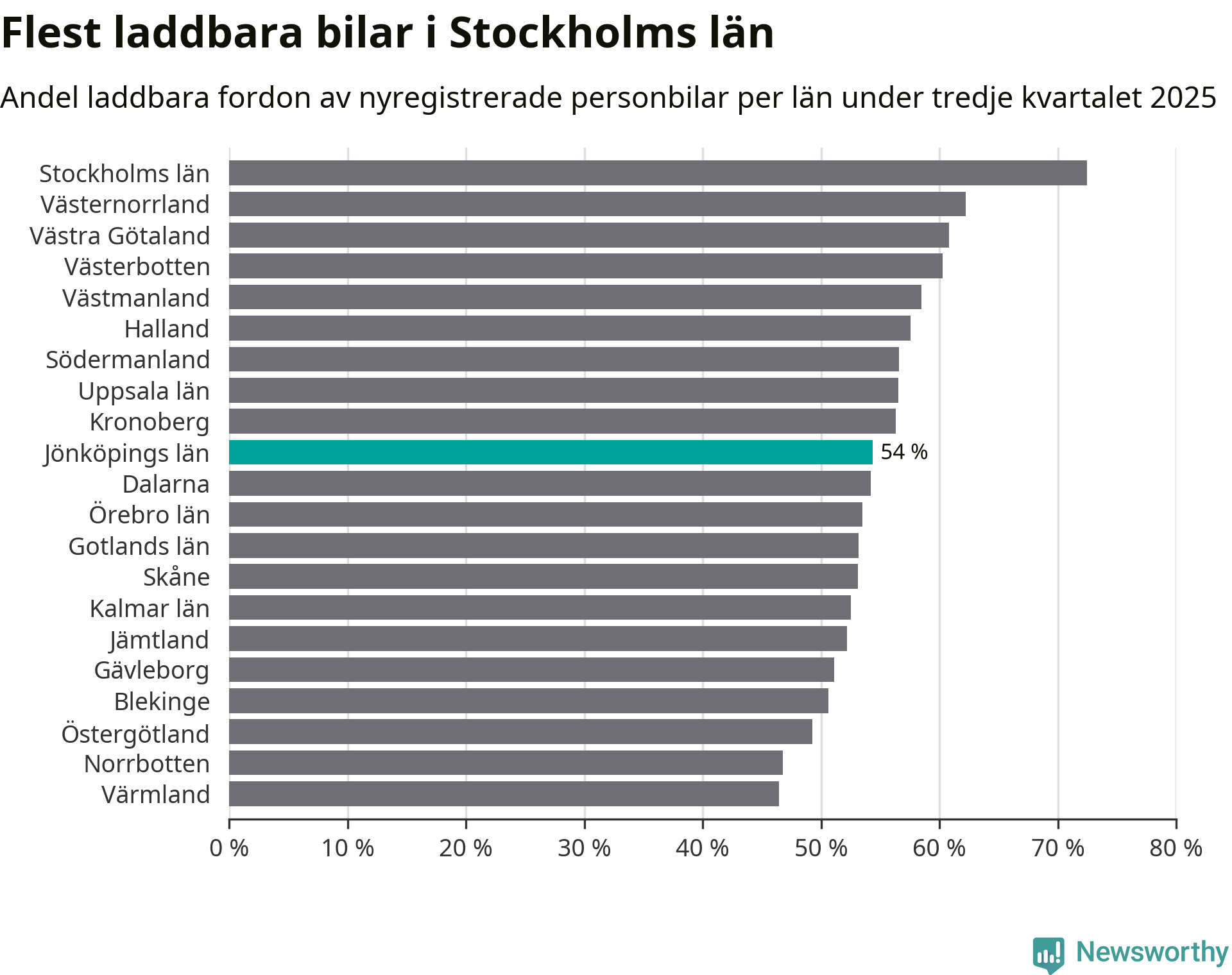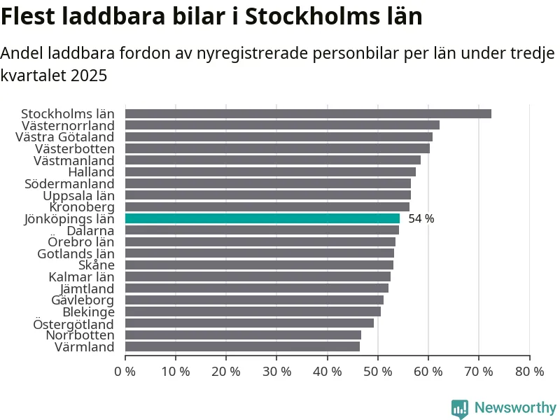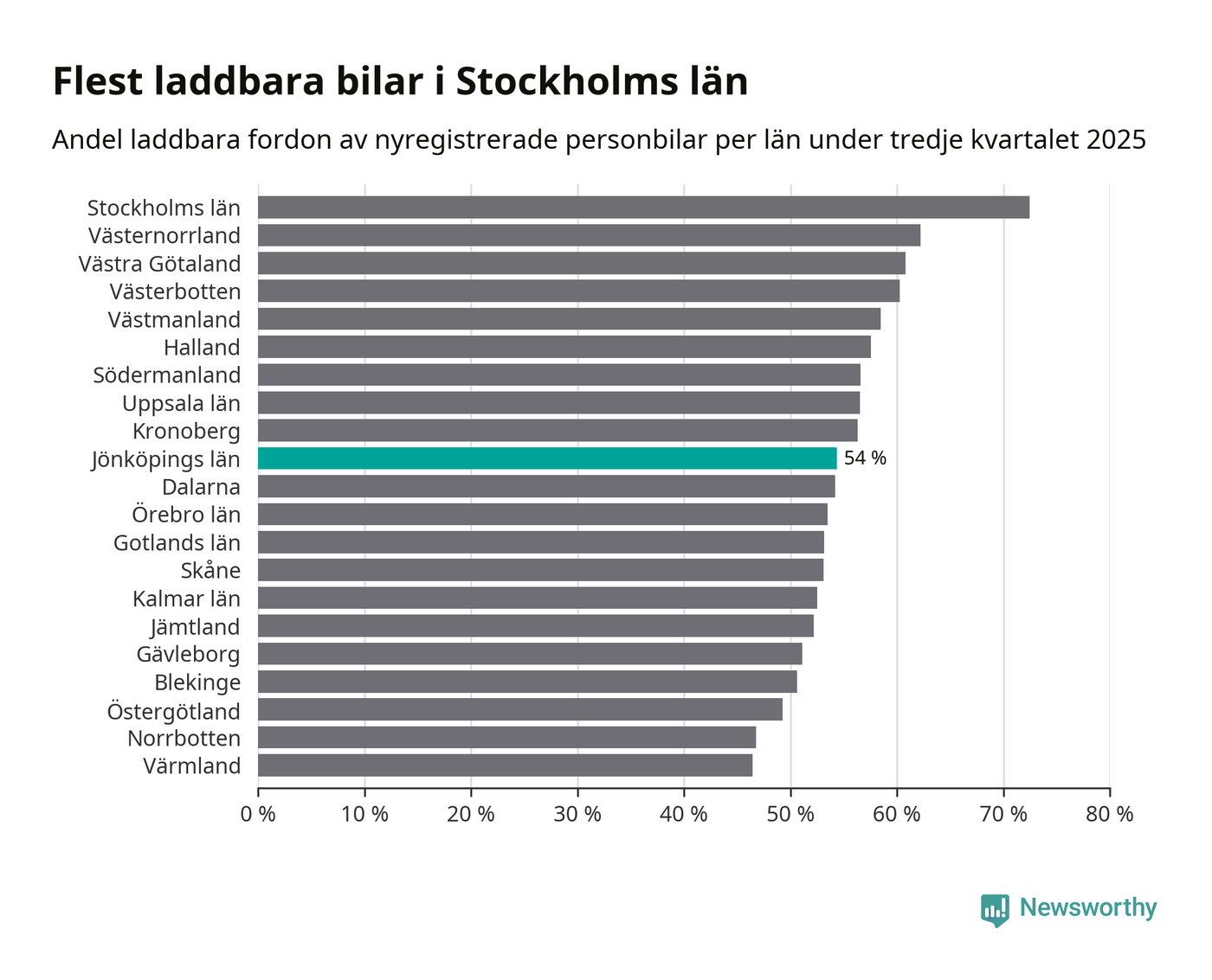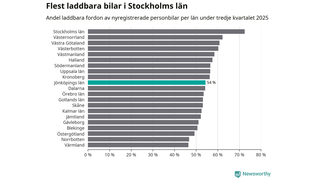 I hela landet var 62 procent av alla nya bilar laddbara under tredje kvartalet. Det är något färre än föregående kvartal (−0,5 procentenheter). I Jönköpings län var 54 procent av de nya bilarna laddbara, vilket är något färre än föregående kvartal (−0,6 procentenheter).
