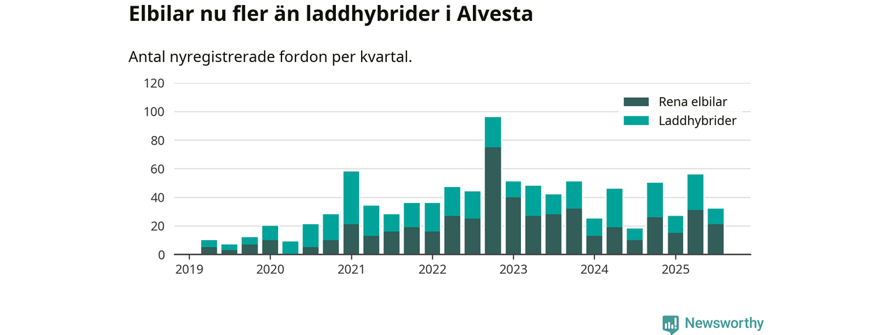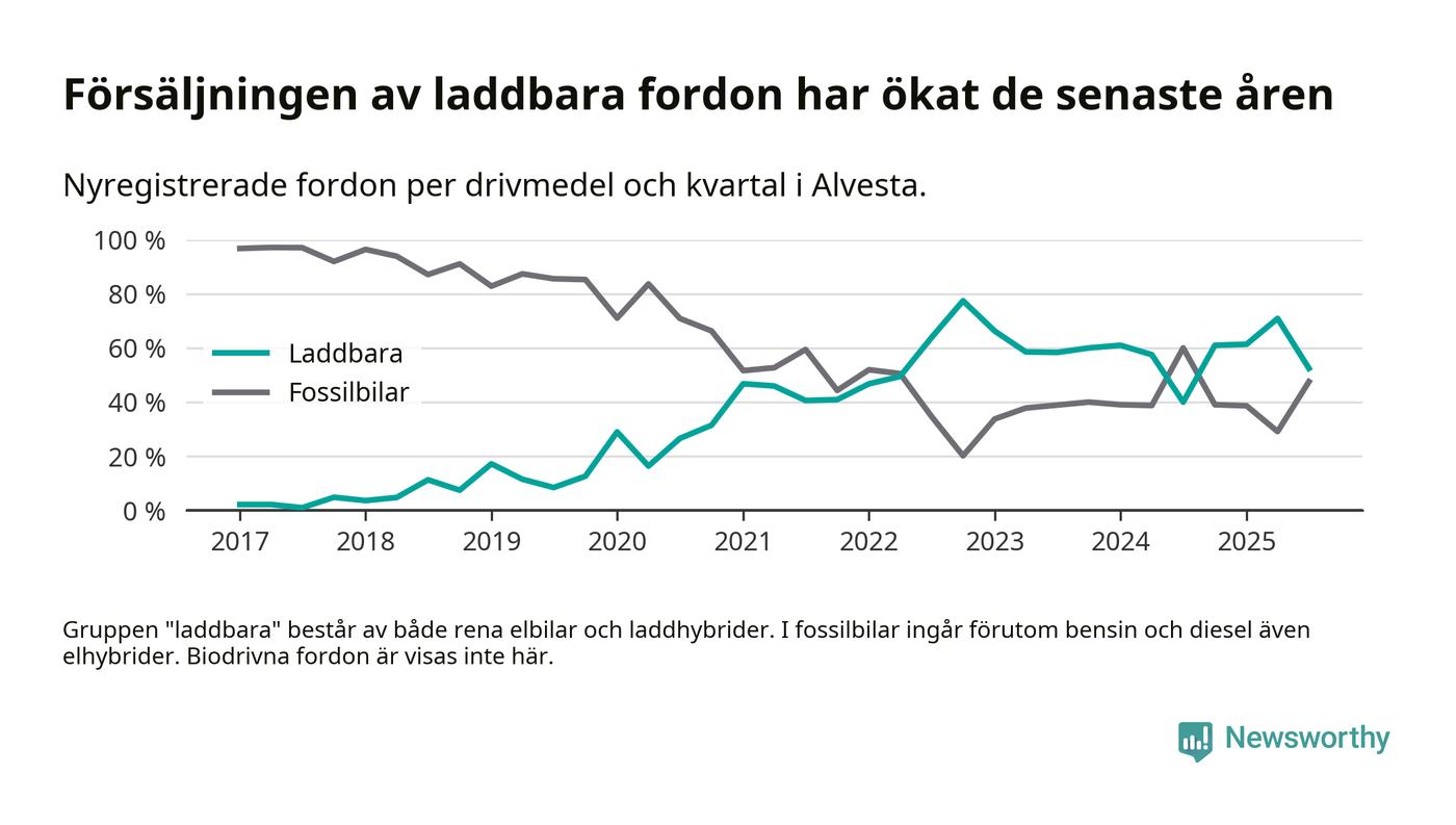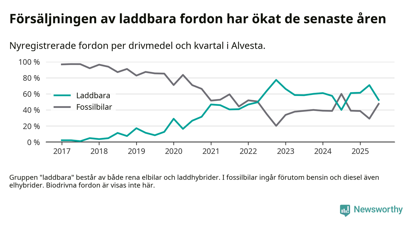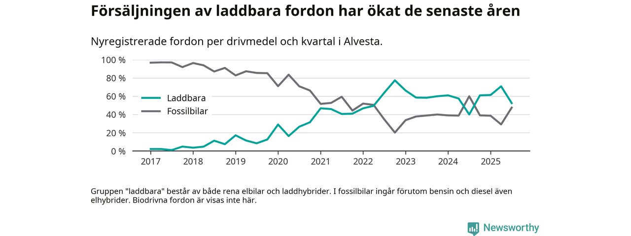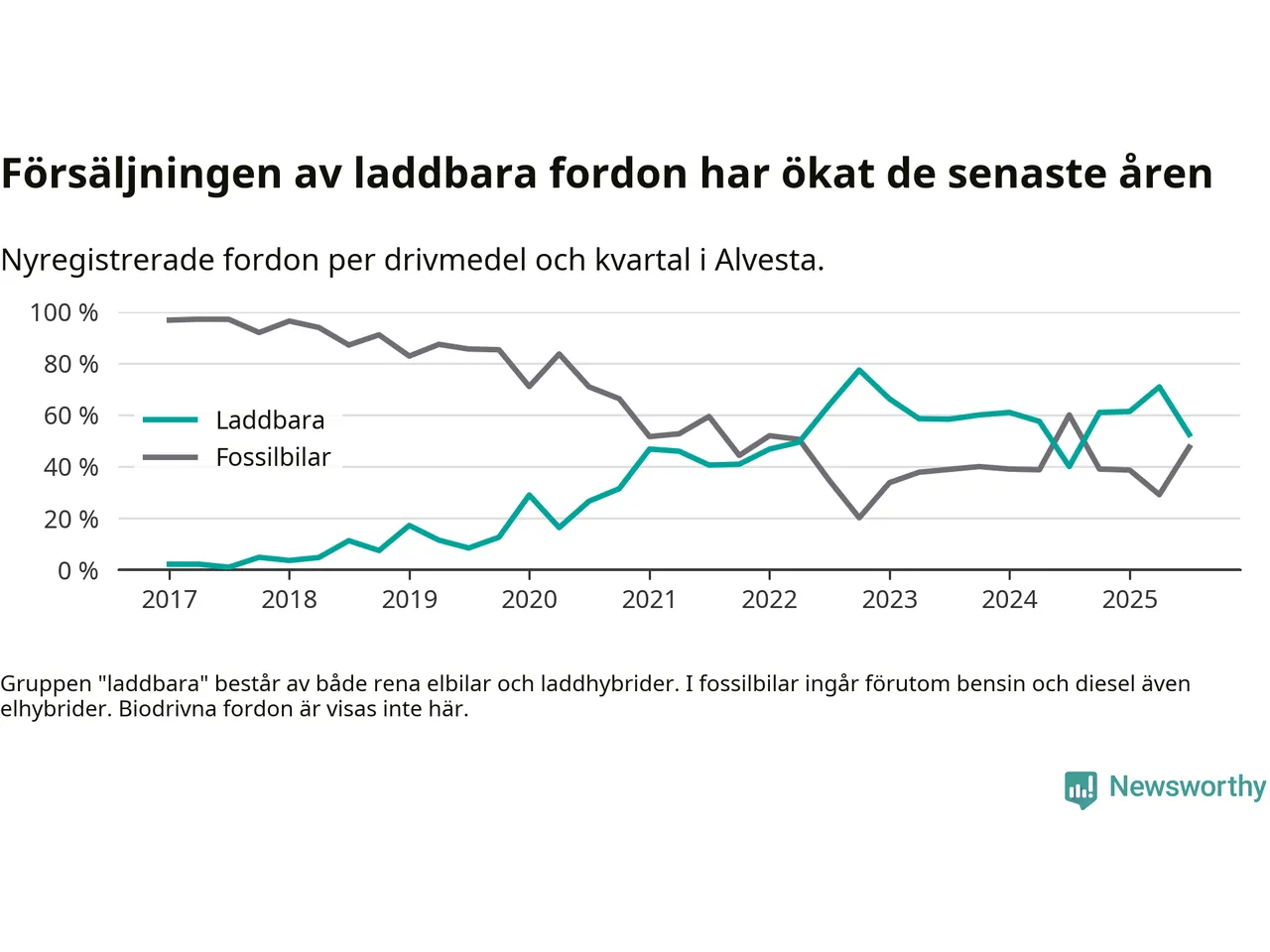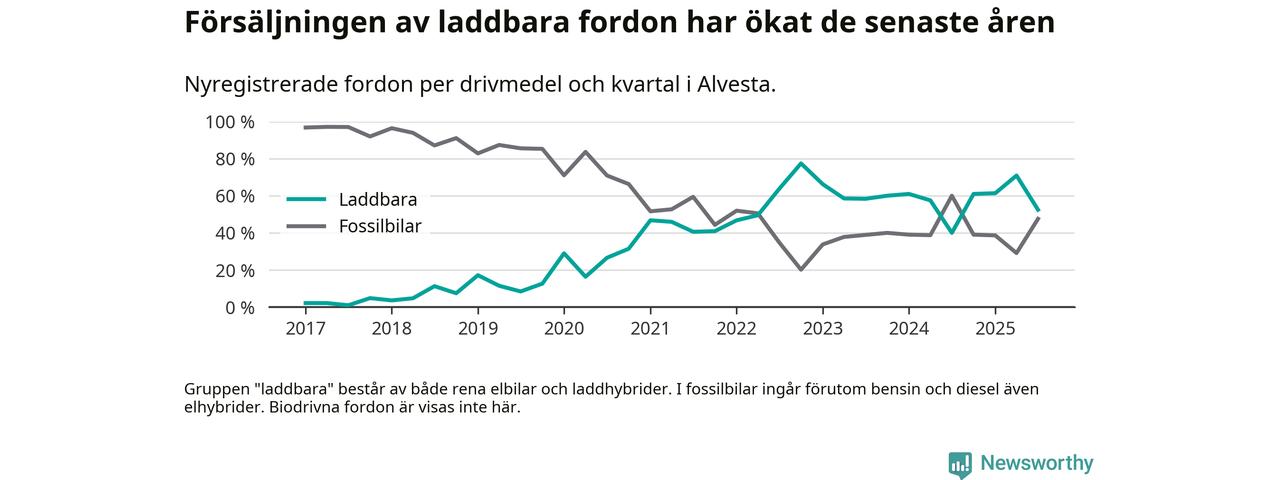 Under tredje kvartalet 2025 var 52 procent av alla nyregistrerade personbilar i Alvesta laddbara (sammanlagt registrerades 61 nya bilar). Merparten av de laddbara bilarna var rena elbilar (34 procent av alla).