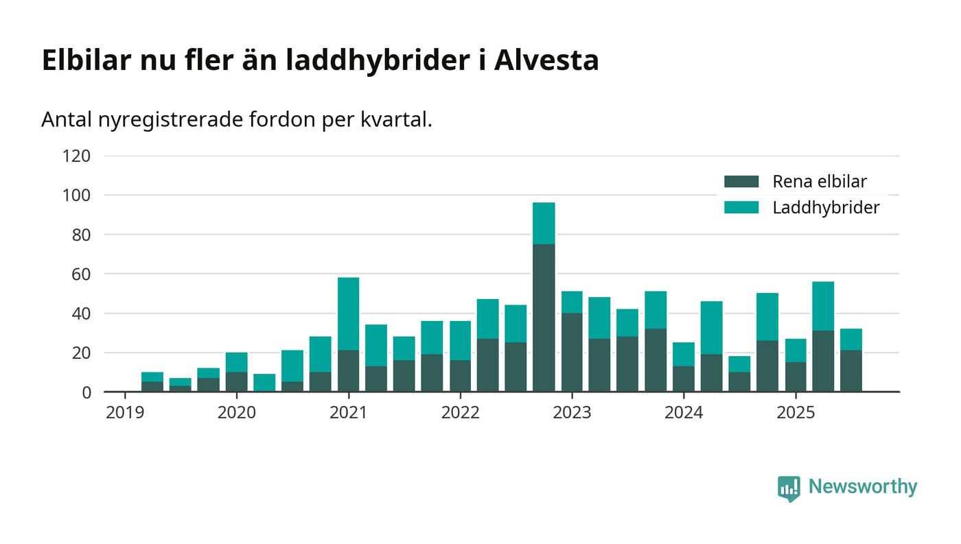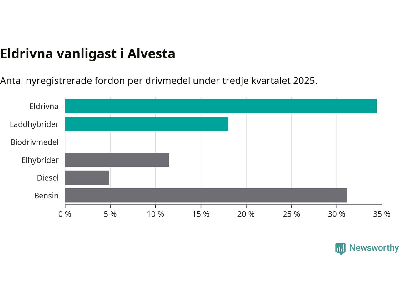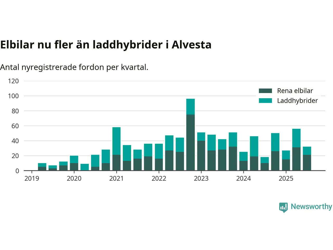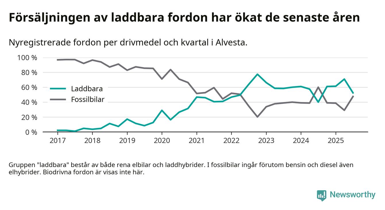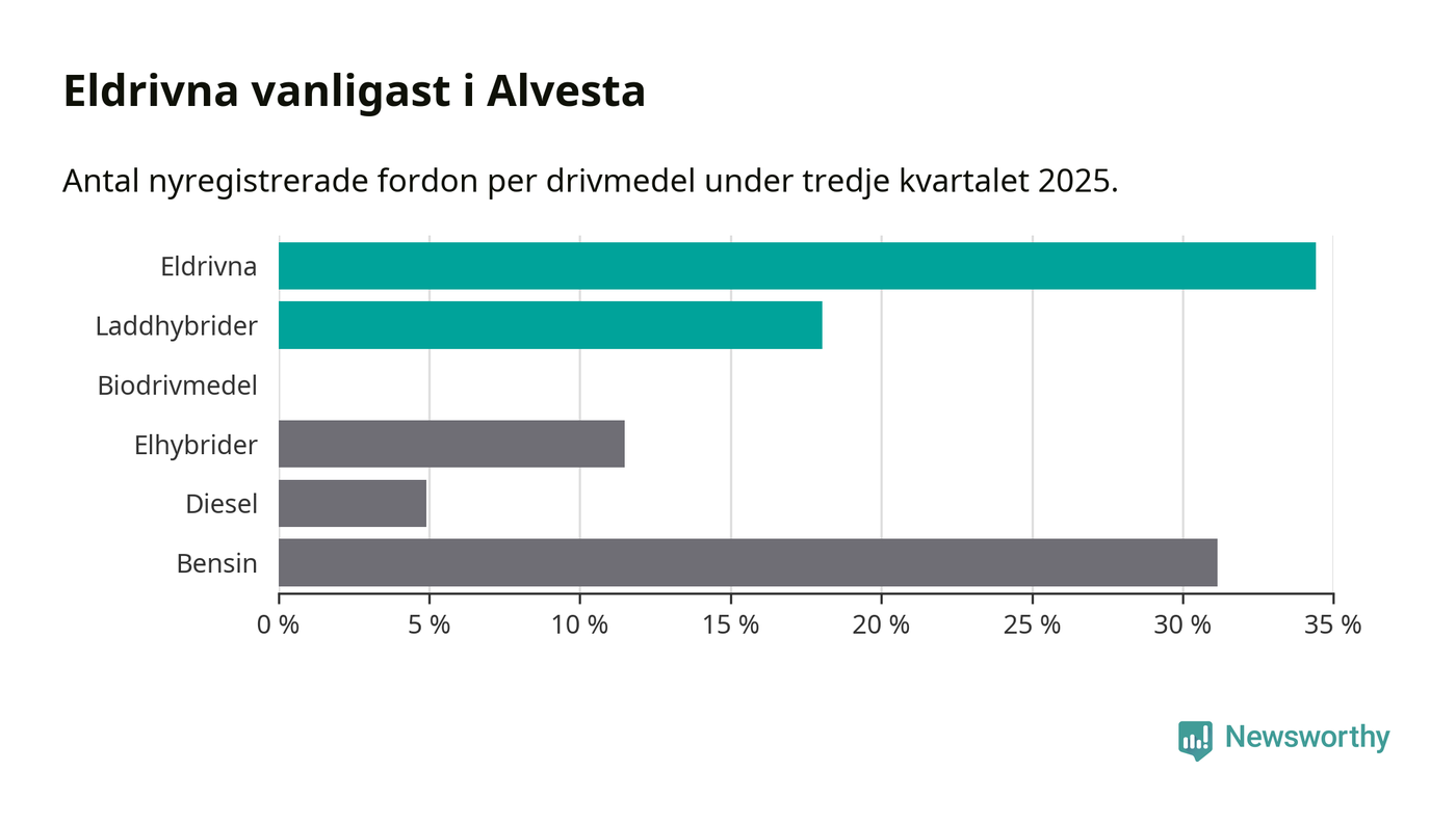 Under tredje kvartalet 2025 var 52 procent av alla nyregistrerade personbilar i Alvesta laddbara (sammanlagt registrerades 61 nya bilar). Merparten av de laddbara bilarna var rena elbilar (34 procent av alla).
