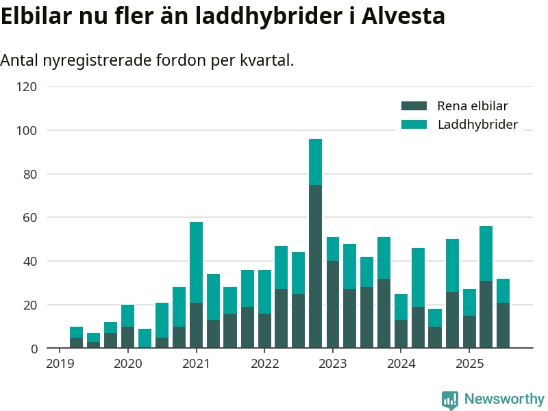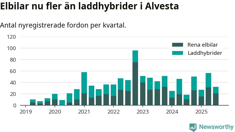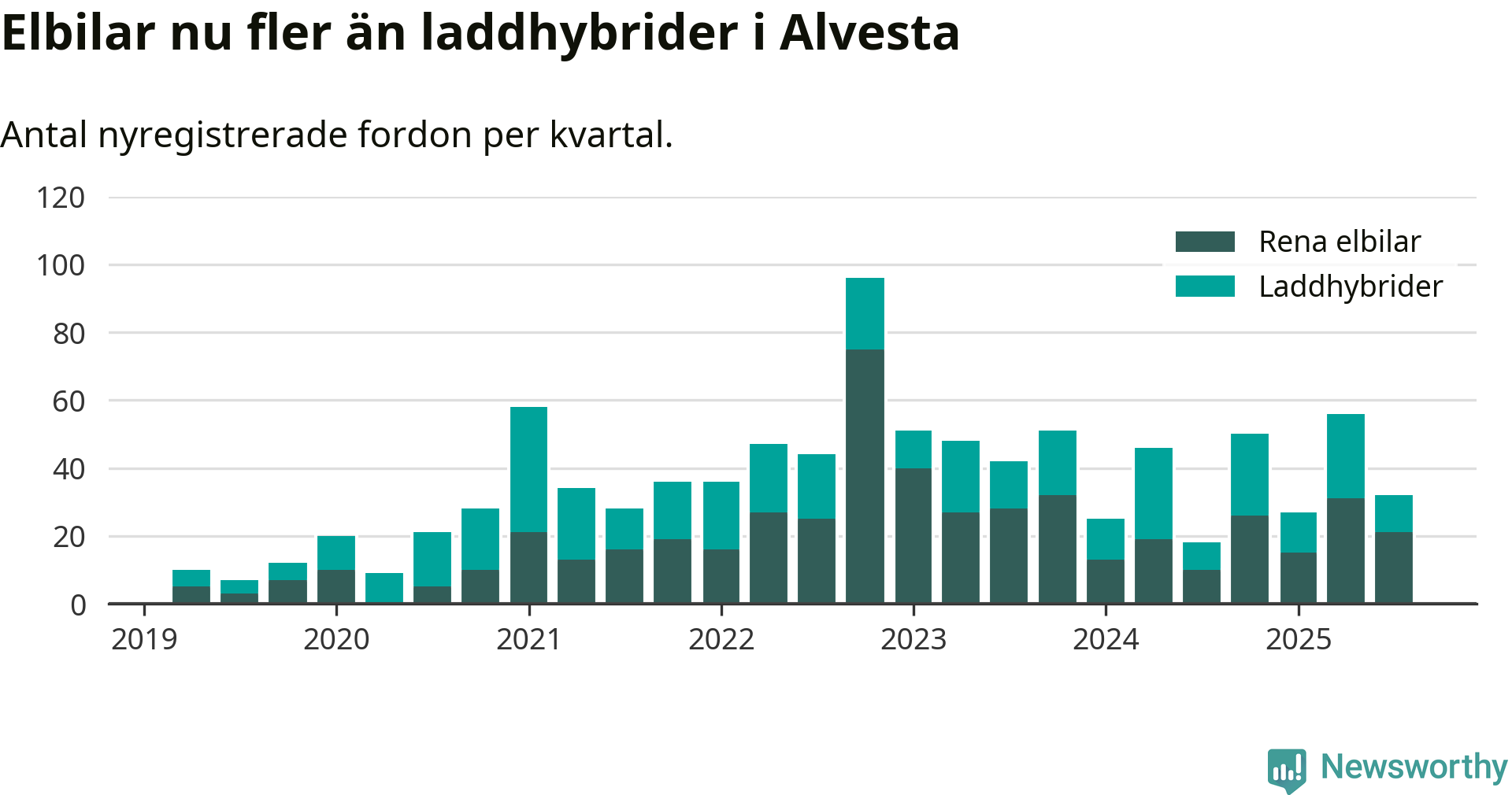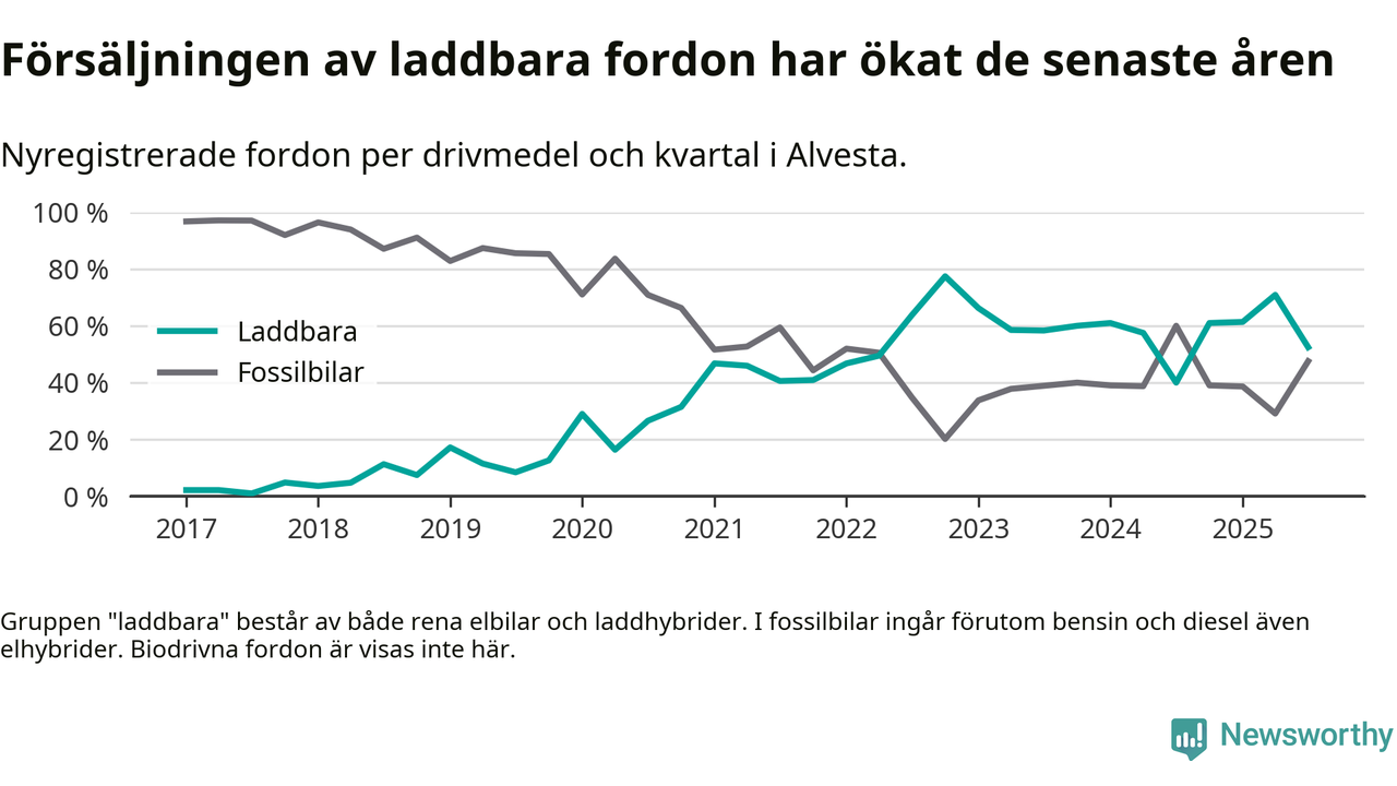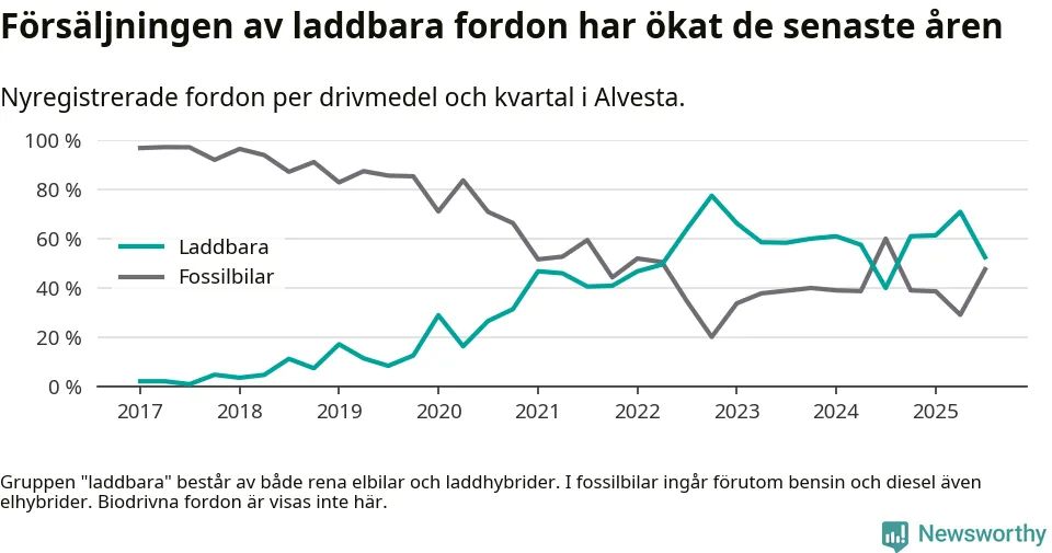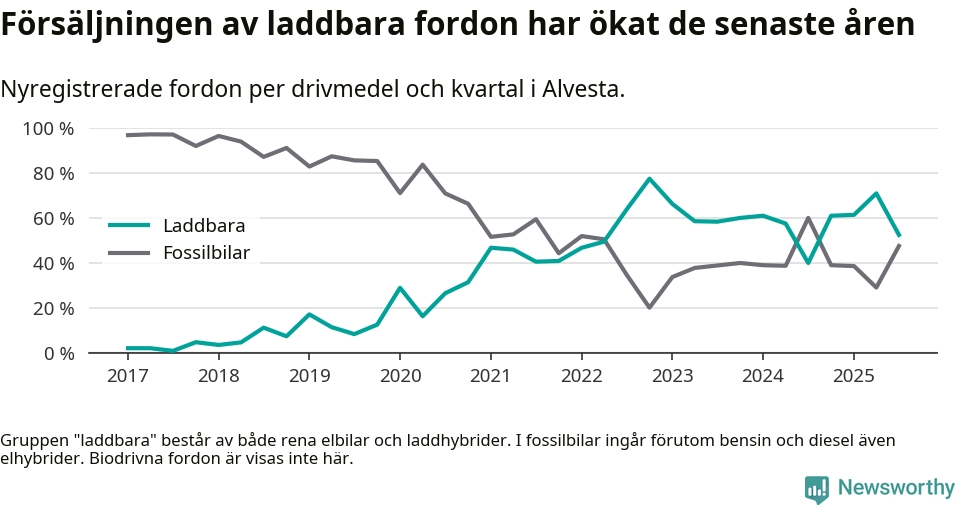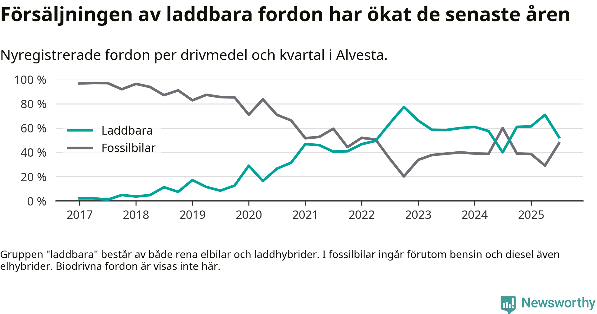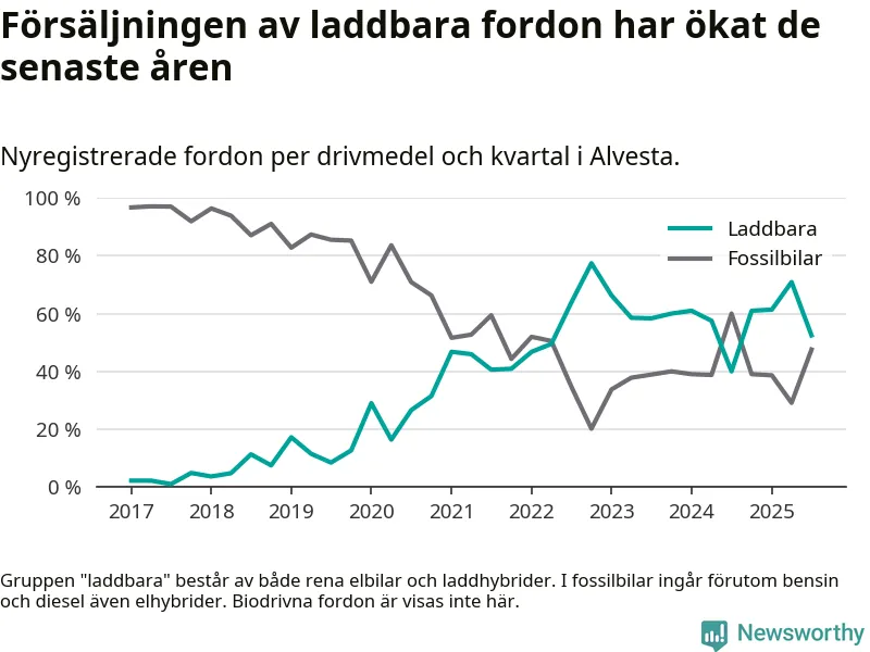 Under tredje kvartalet 2025 var 52 procent av alla nyregistrerade personbilar i Alvesta laddbara (sammanlagt registrerades 61 nya bilar). Merparten av de laddbara bilarna var rena elbilar (34 procent av alla).