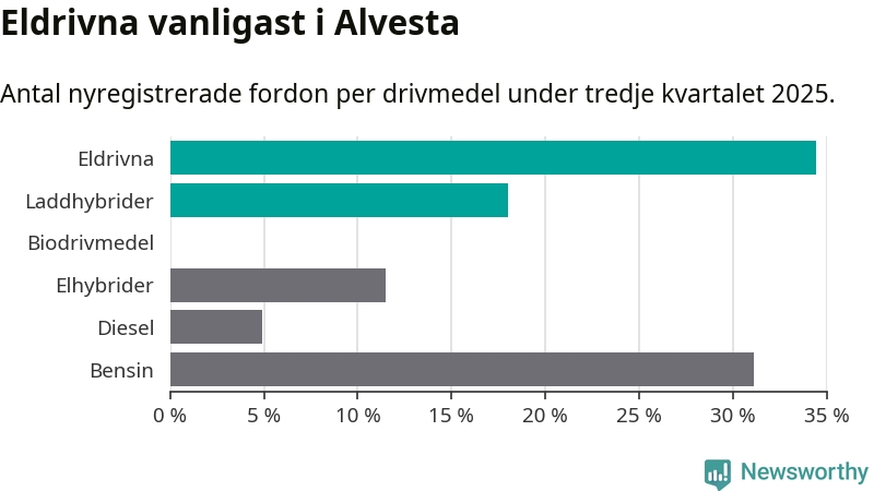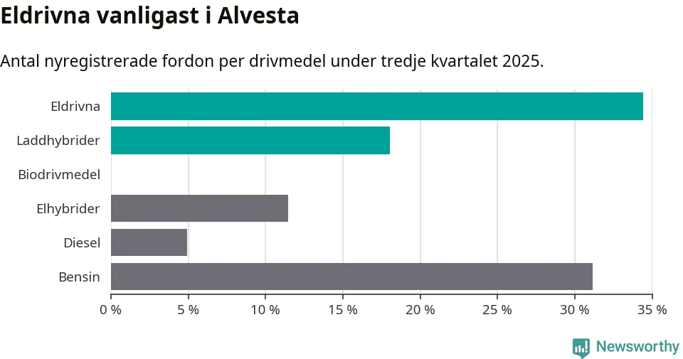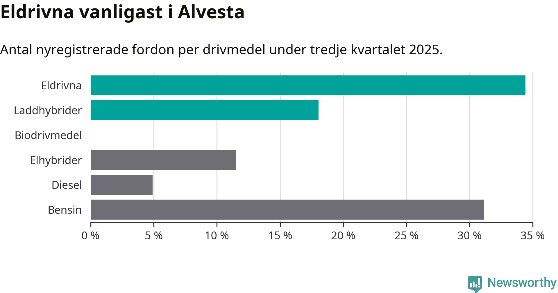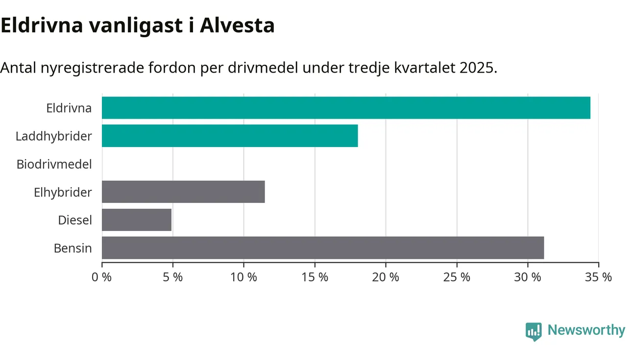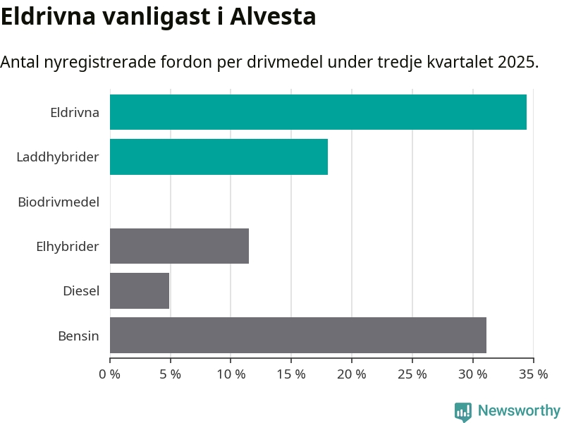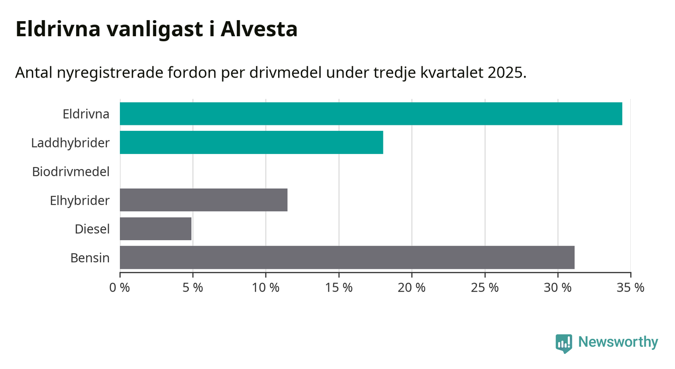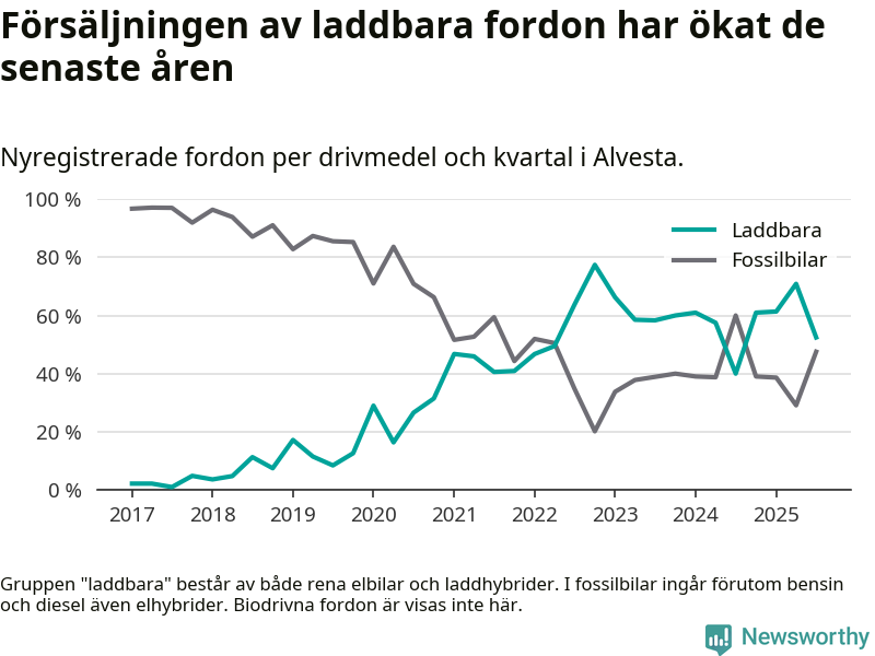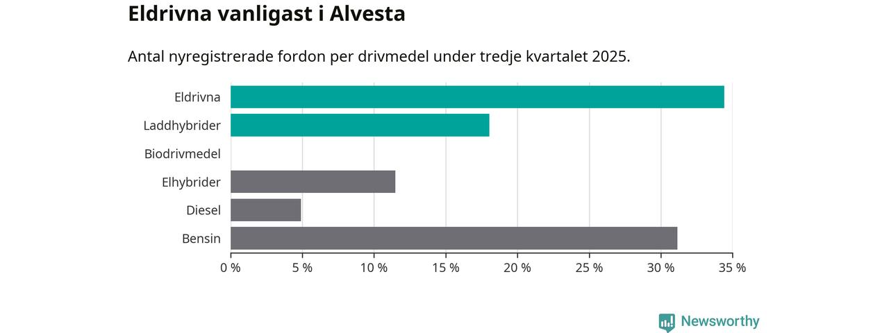 Under tredje kvartalet 2025 var 52 procent av alla nyregistrerade personbilar i Alvesta laddbara (sammanlagt registrerades 61 nya bilar). Merparten av de laddbara bilarna var rena elbilar (34 procent av alla).