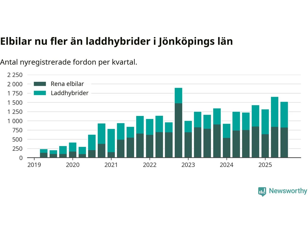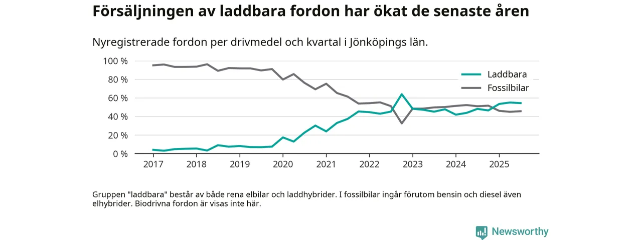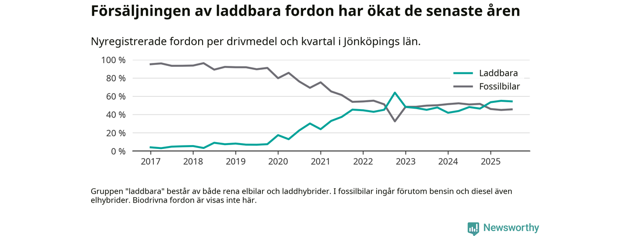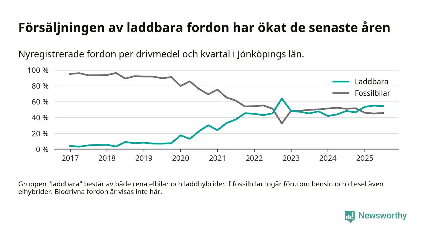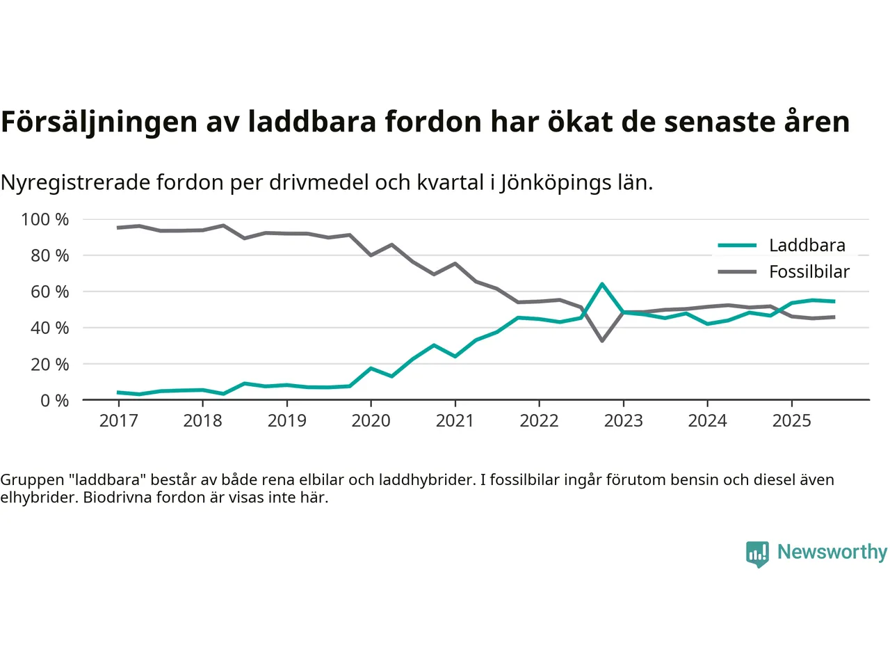 Under tredje kvartalet 2025 var 54 procent av alla nyregistrerade personbilar i Jönköpings län laddbara (sammanlagt registrerades 2 783 nya bilar). Merparten av de laddbara bilarna var rena elbilar (29 procent av alla).