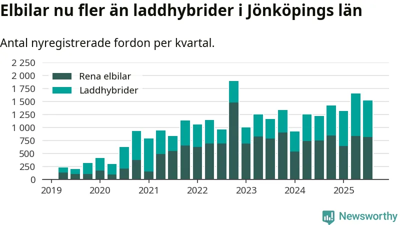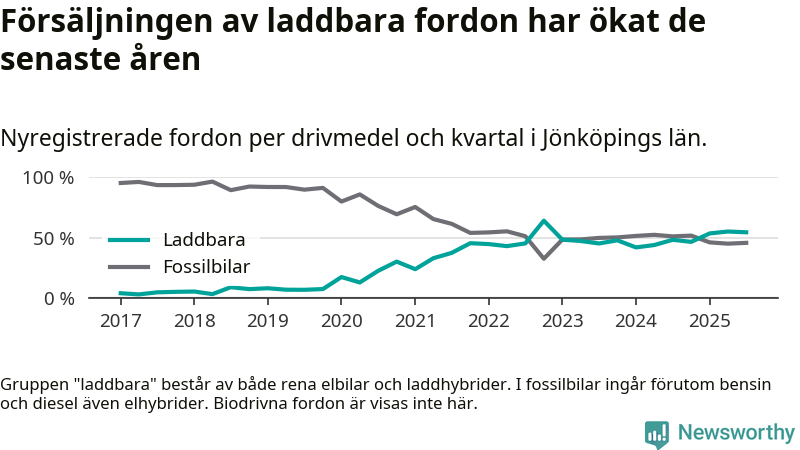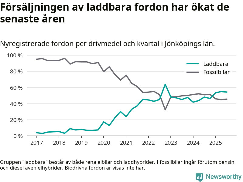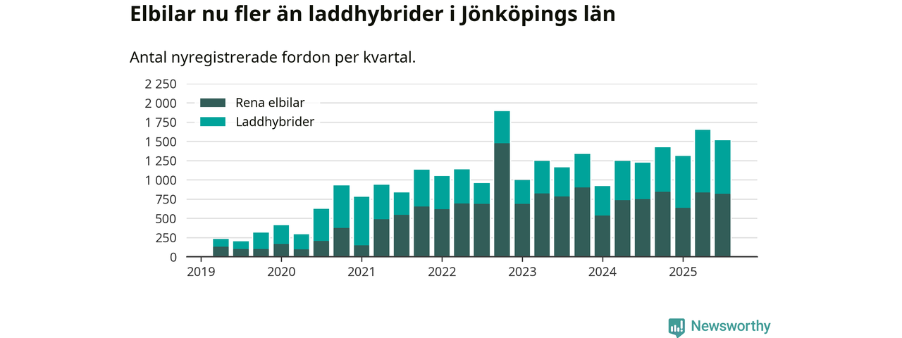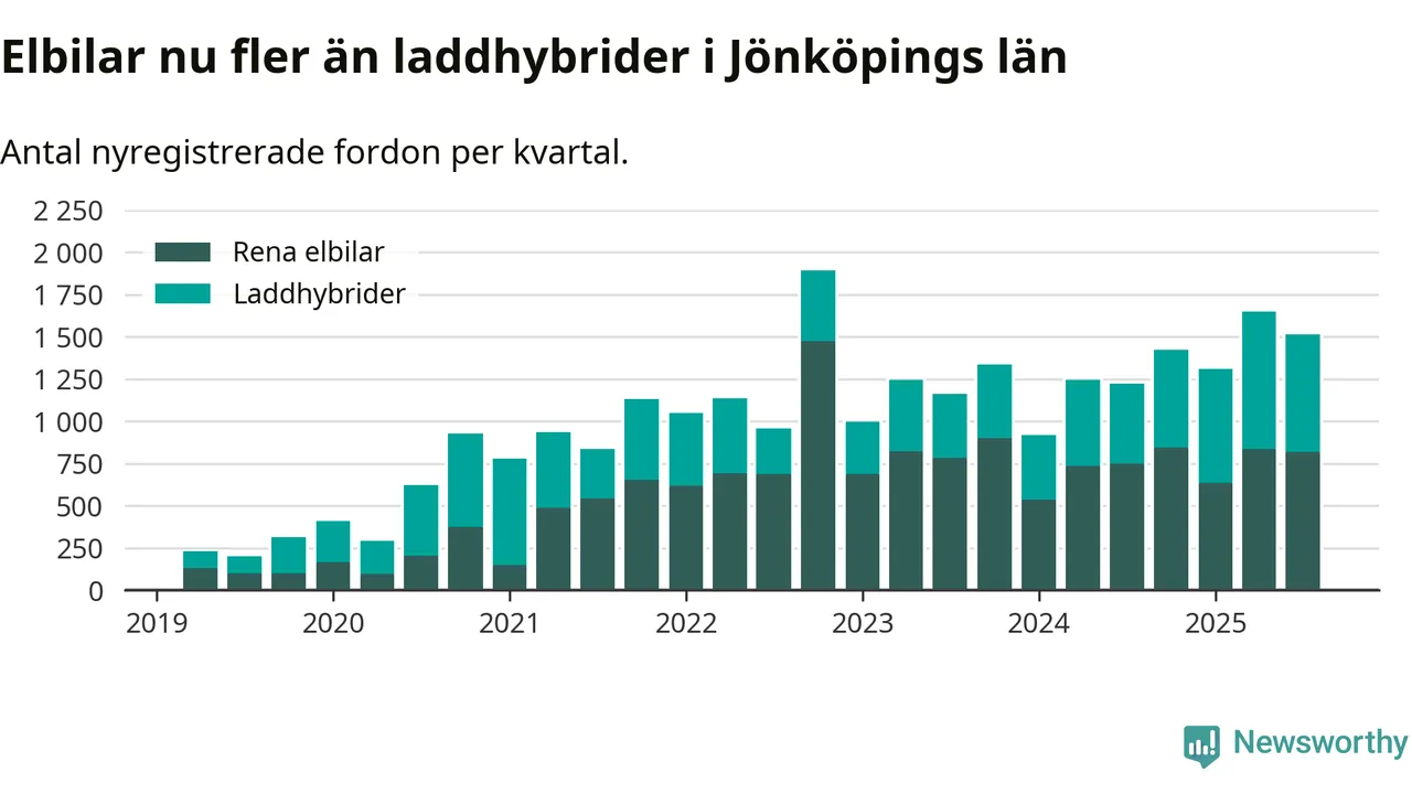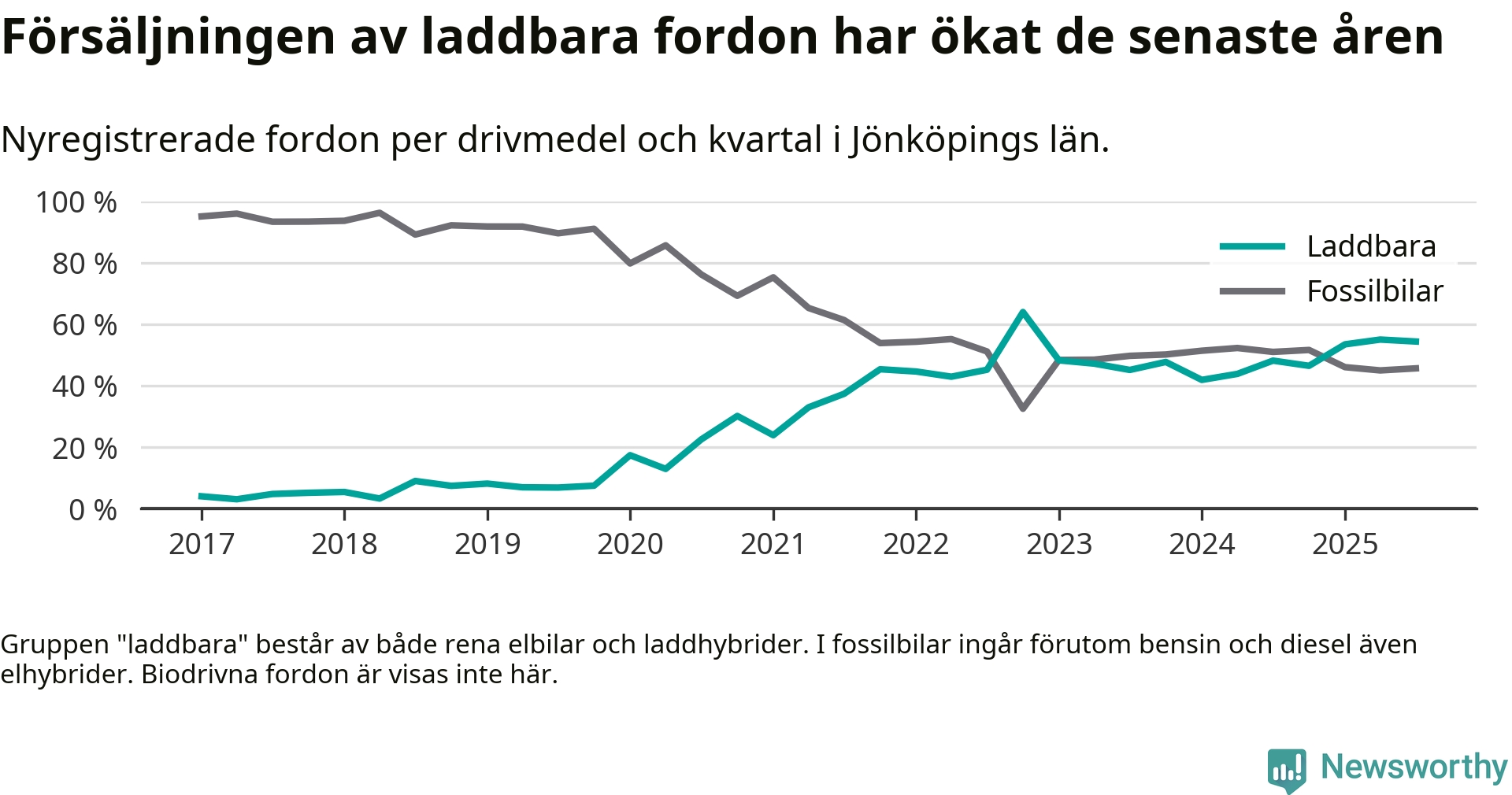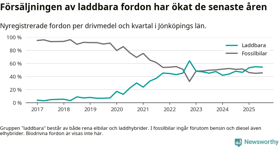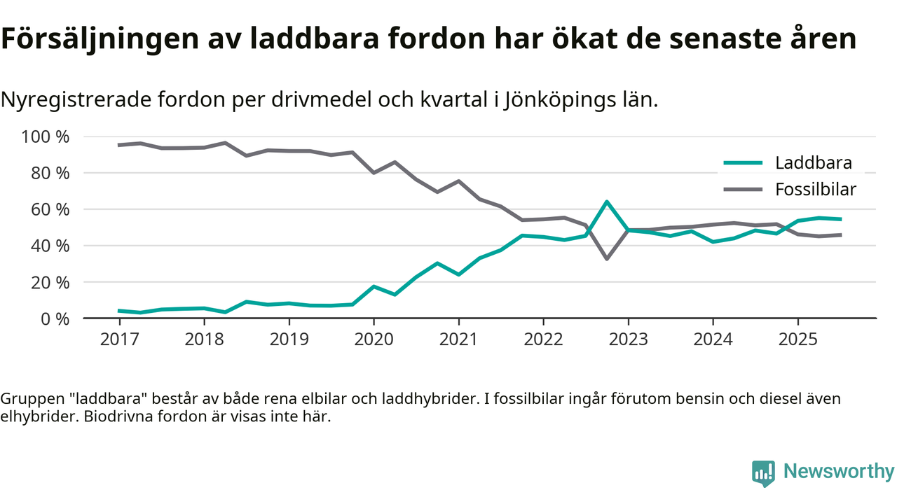 Under tredje kvartalet 2025 var 54 procent av alla nyregistrerade personbilar i Jönköpings län laddbara (sammanlagt registrerades 2 783 nya bilar). Merparten av de laddbara bilarna var rena elbilar (29 procent av alla).