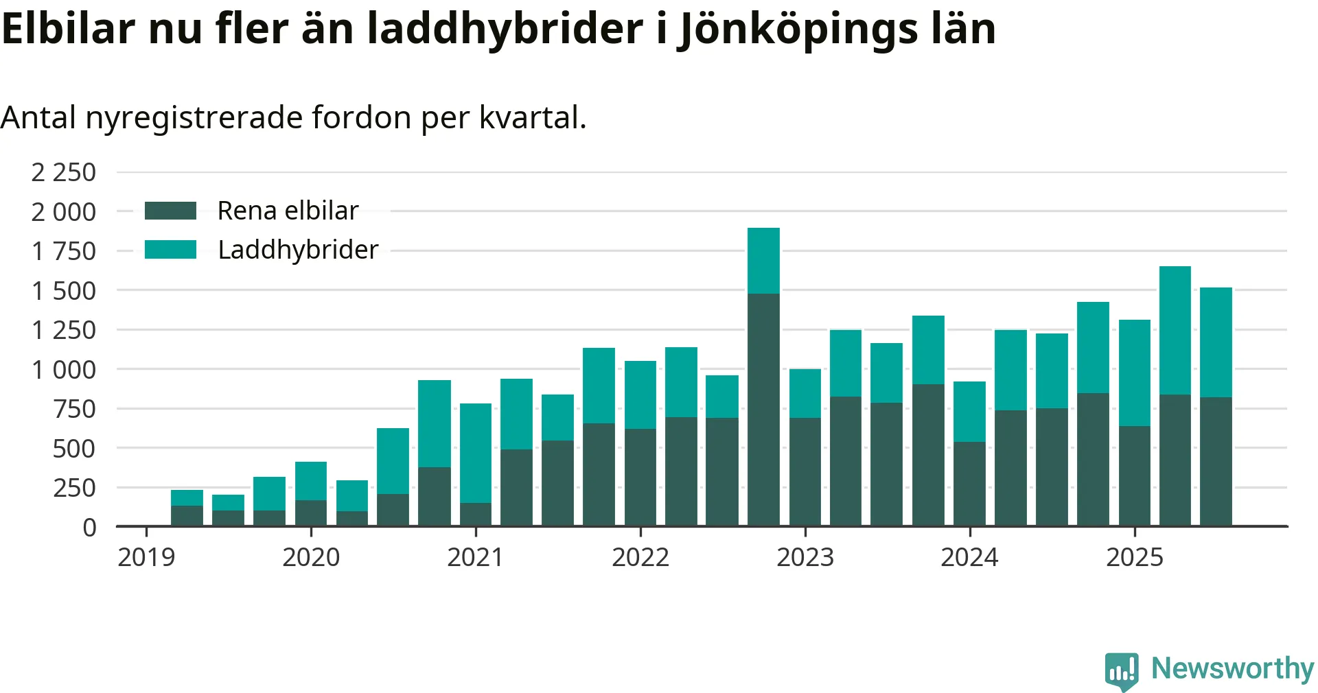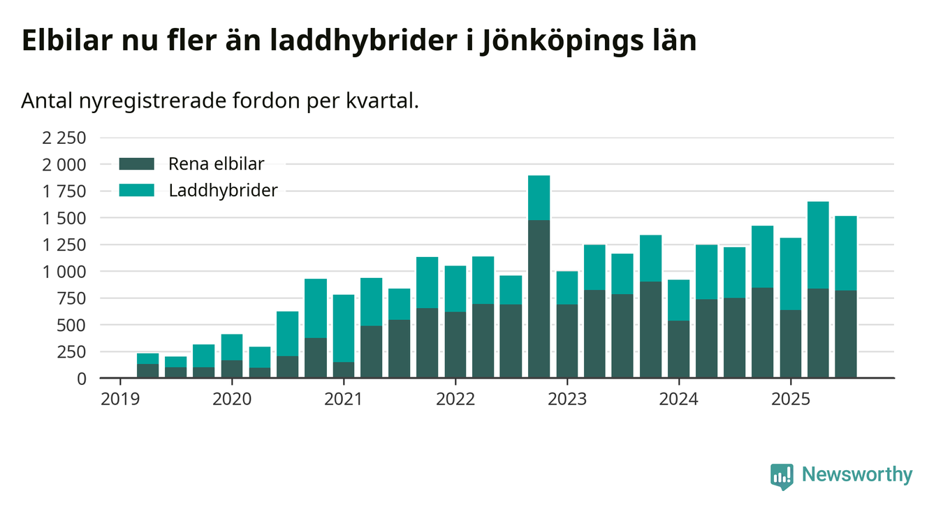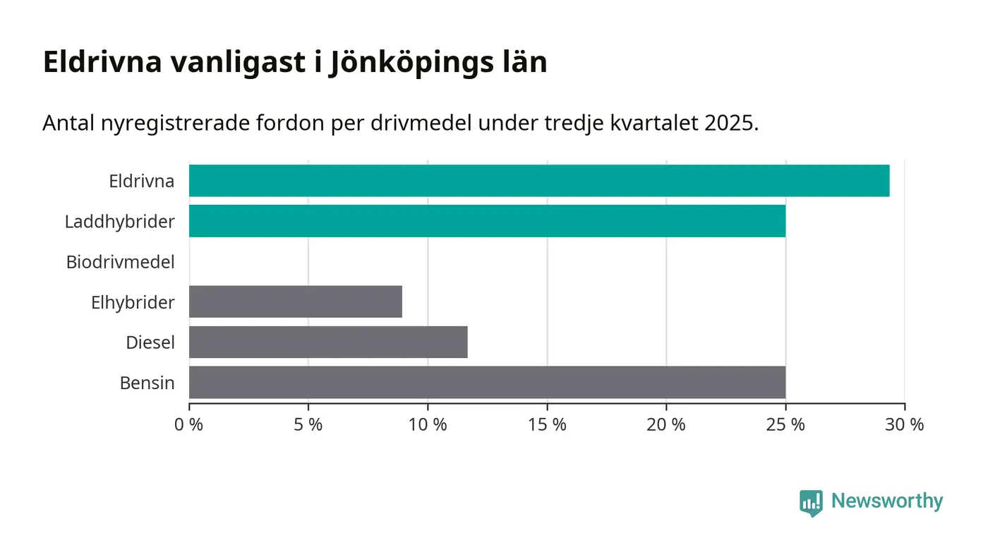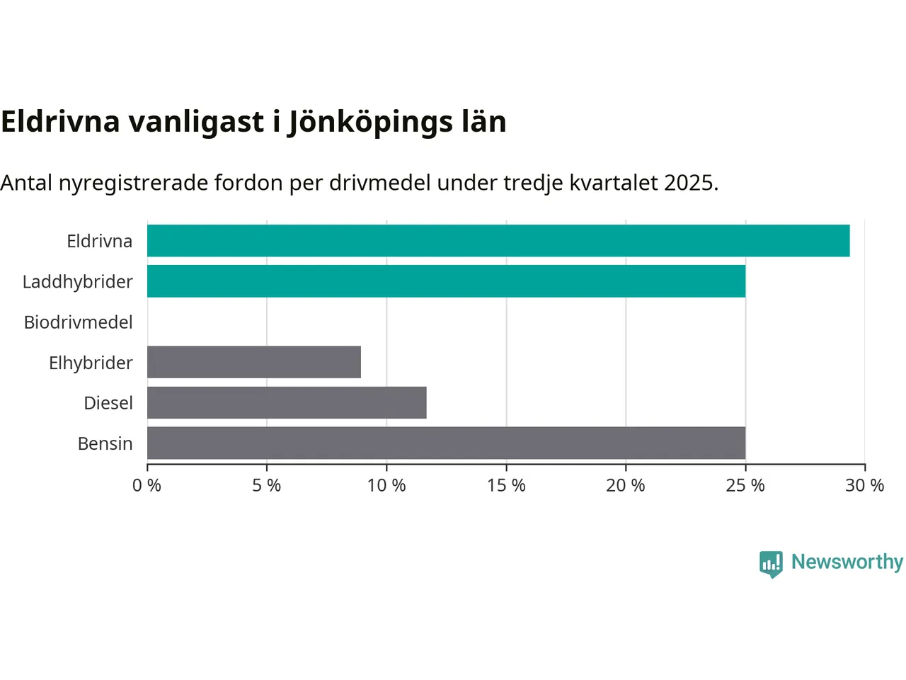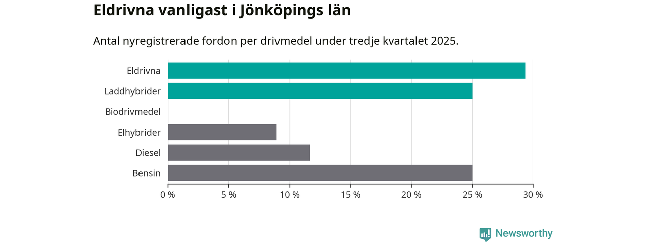 Under tredje kvartalet 2025 var 54 procent av alla nyregistrerade personbilar i Jönköpings län laddbara (sammanlagt registrerades 2 783 nya bilar). Merparten av de laddbara bilarna var rena elbilar (29 procent av alla).