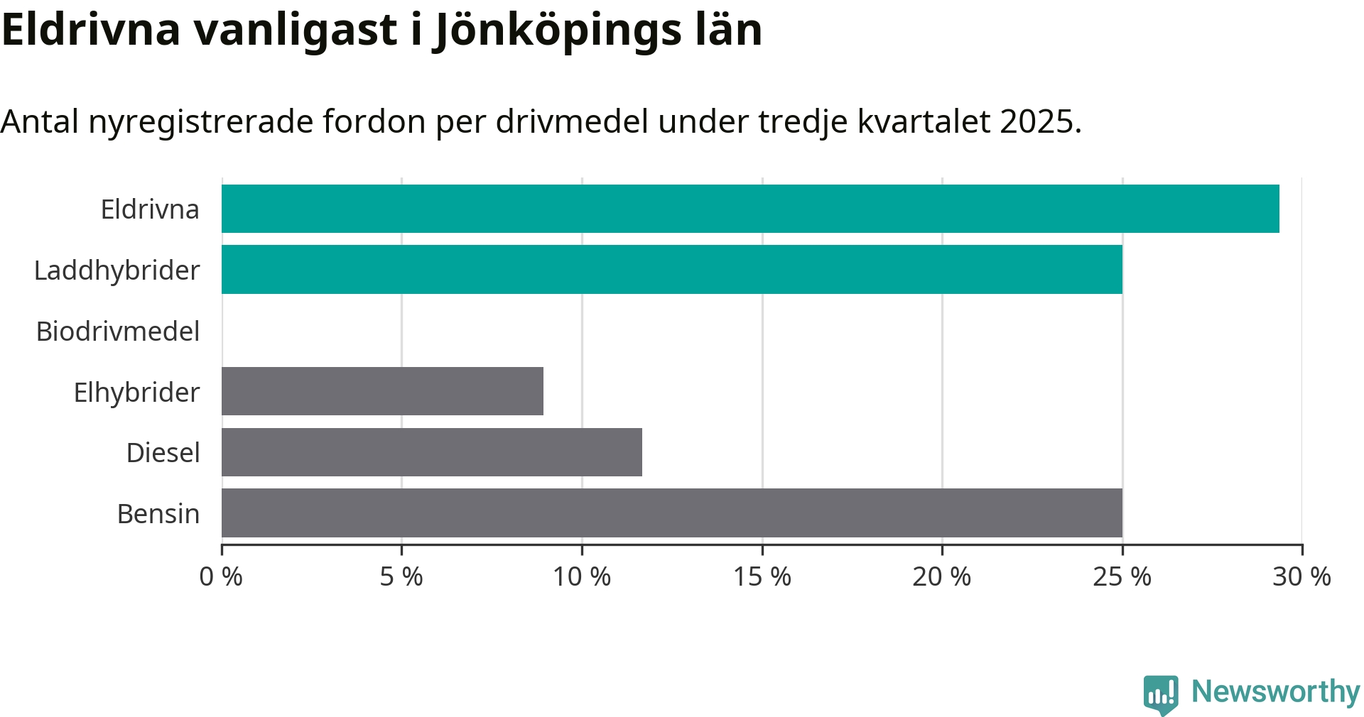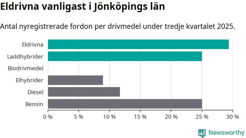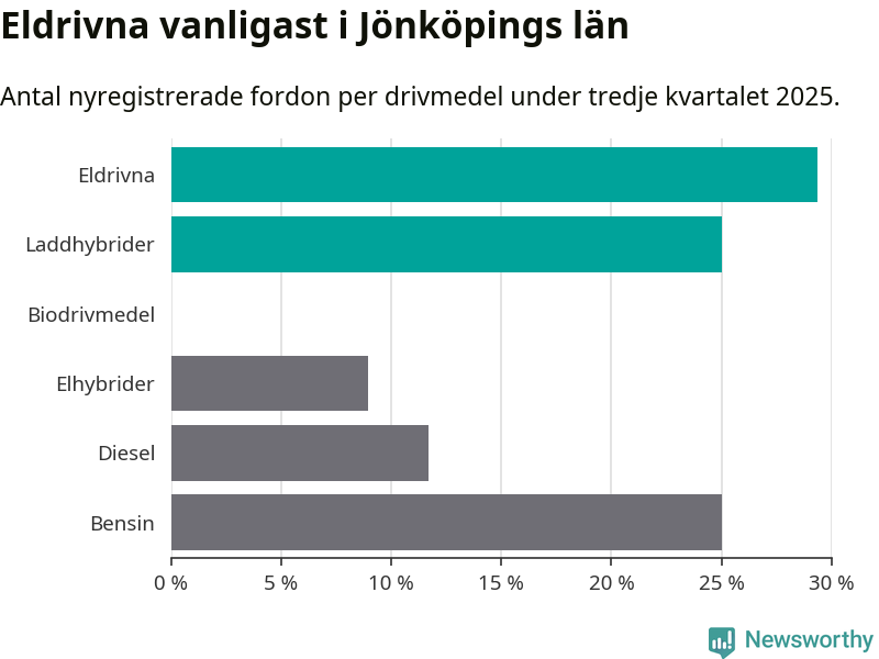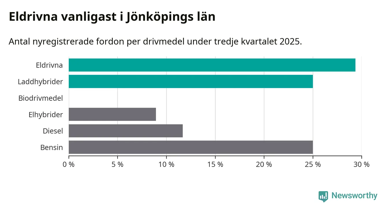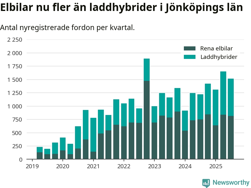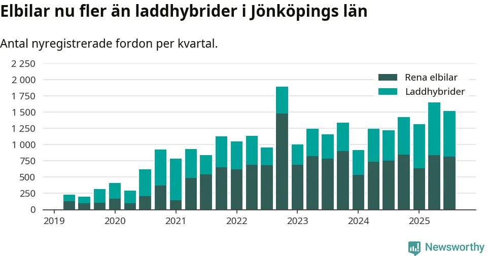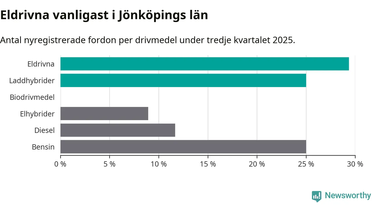 Under tredje kvartalet 2025 var 54 procent av alla nyregistrerade personbilar i Jönköpings län laddbara (sammanlagt registrerades 2 783 nya bilar). Merparten av de laddbara bilarna var rena elbilar (29 procent av alla).