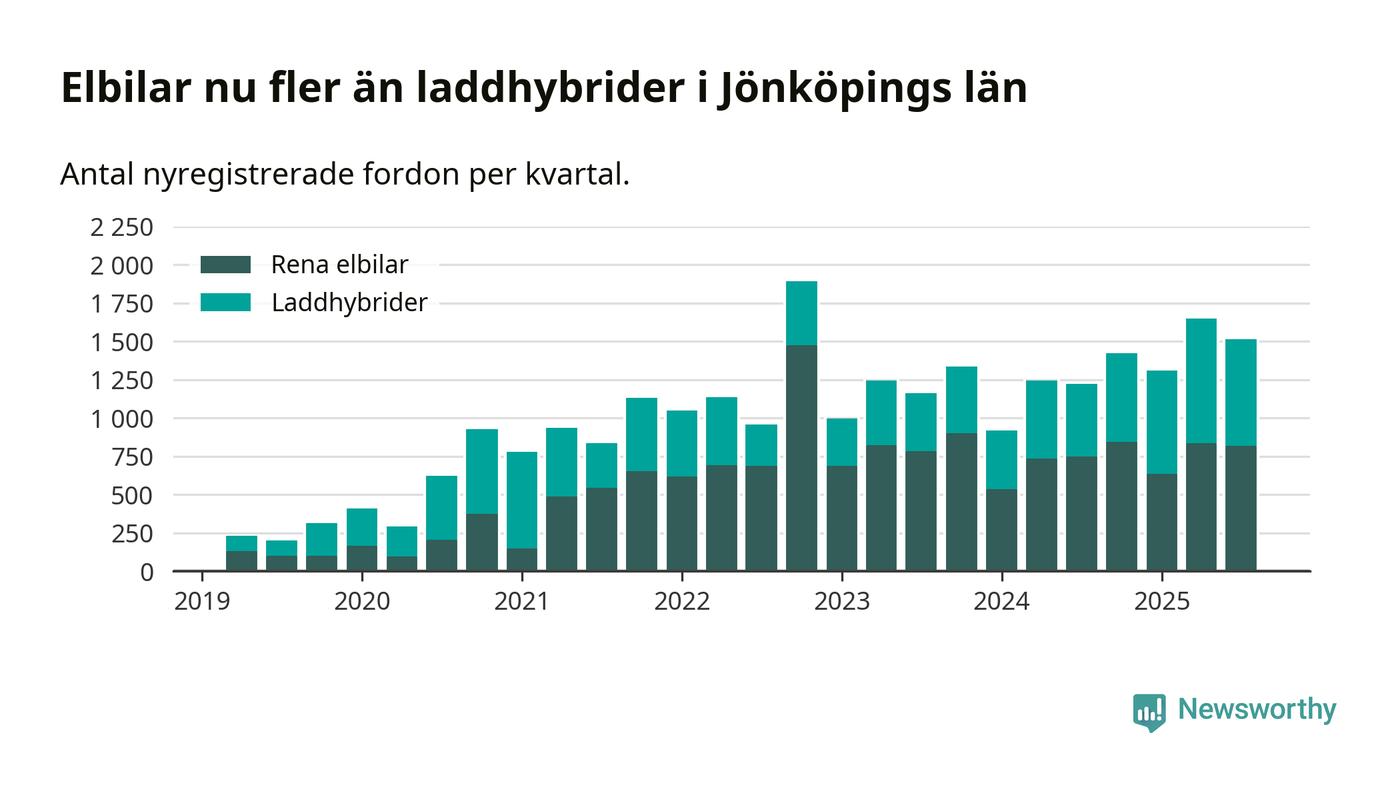 Under tredje kvartalet minskade elbilarnas och laddhybridernas andel av nyregistreringarna i Jönköpings län. Även i riket minskade andelen laddbara bilar något. Framför allt elbilsförsäljningen har tappat fart.