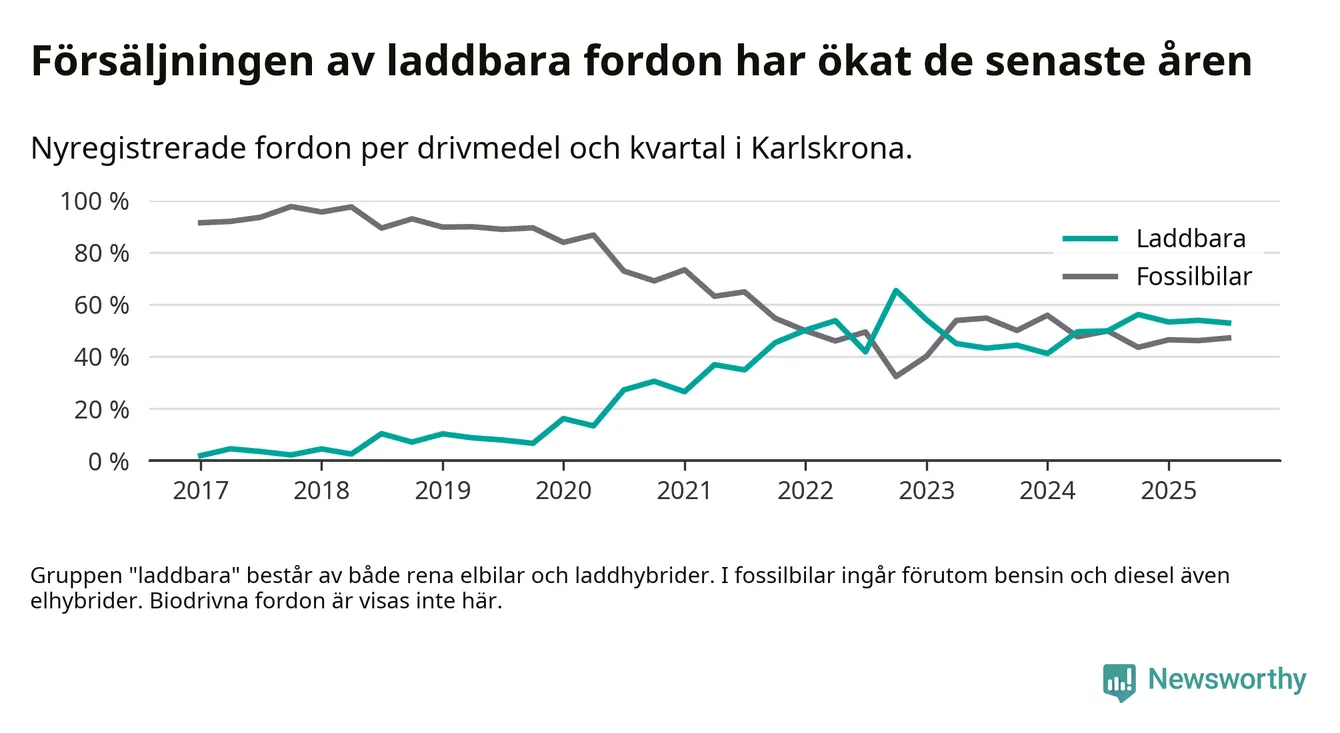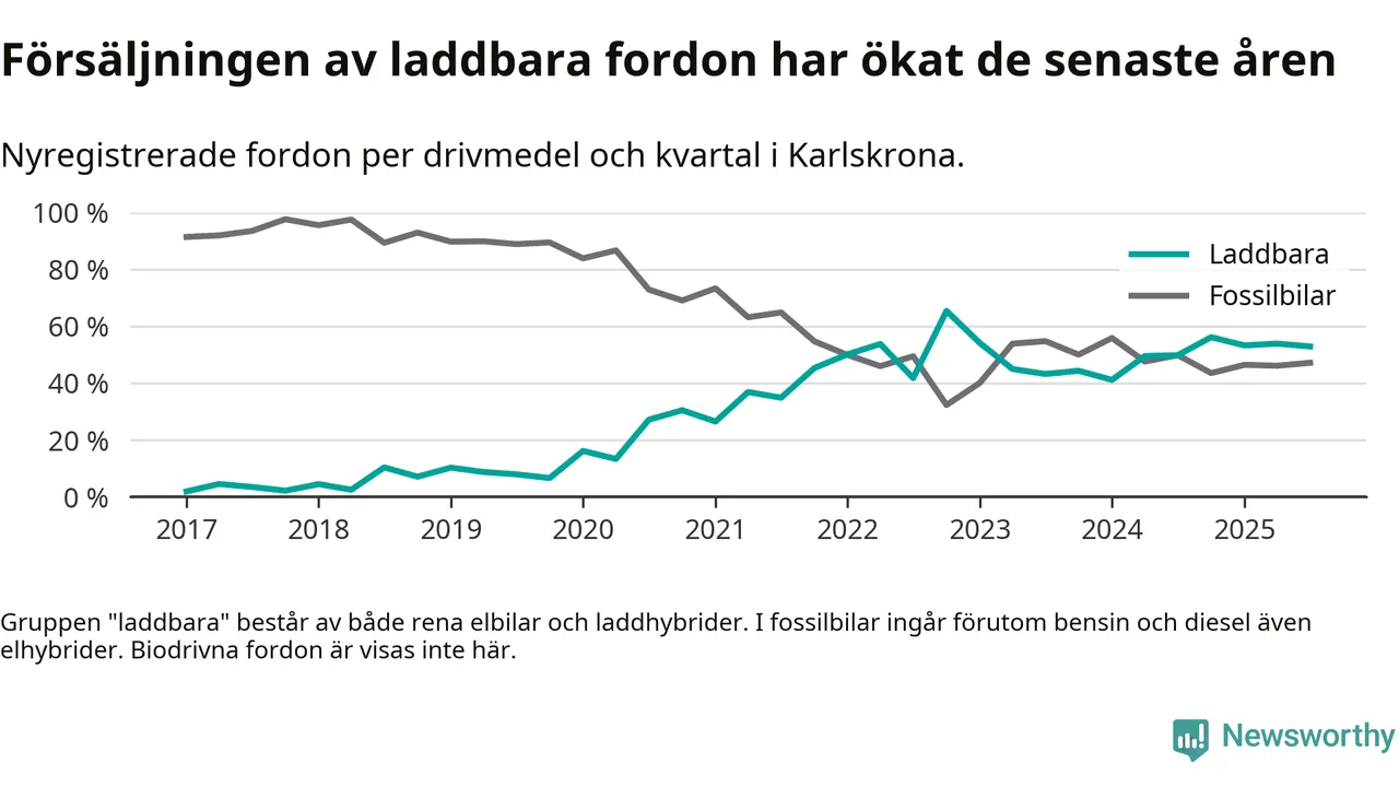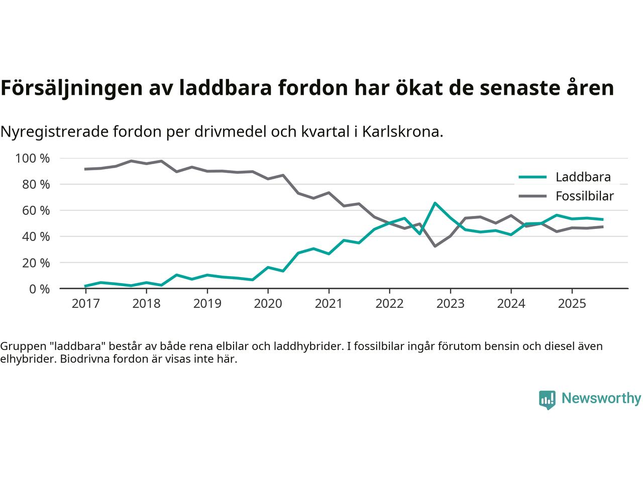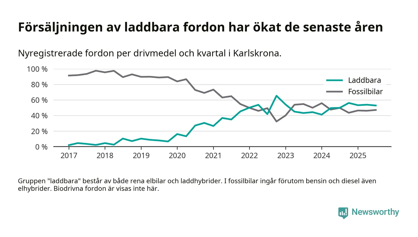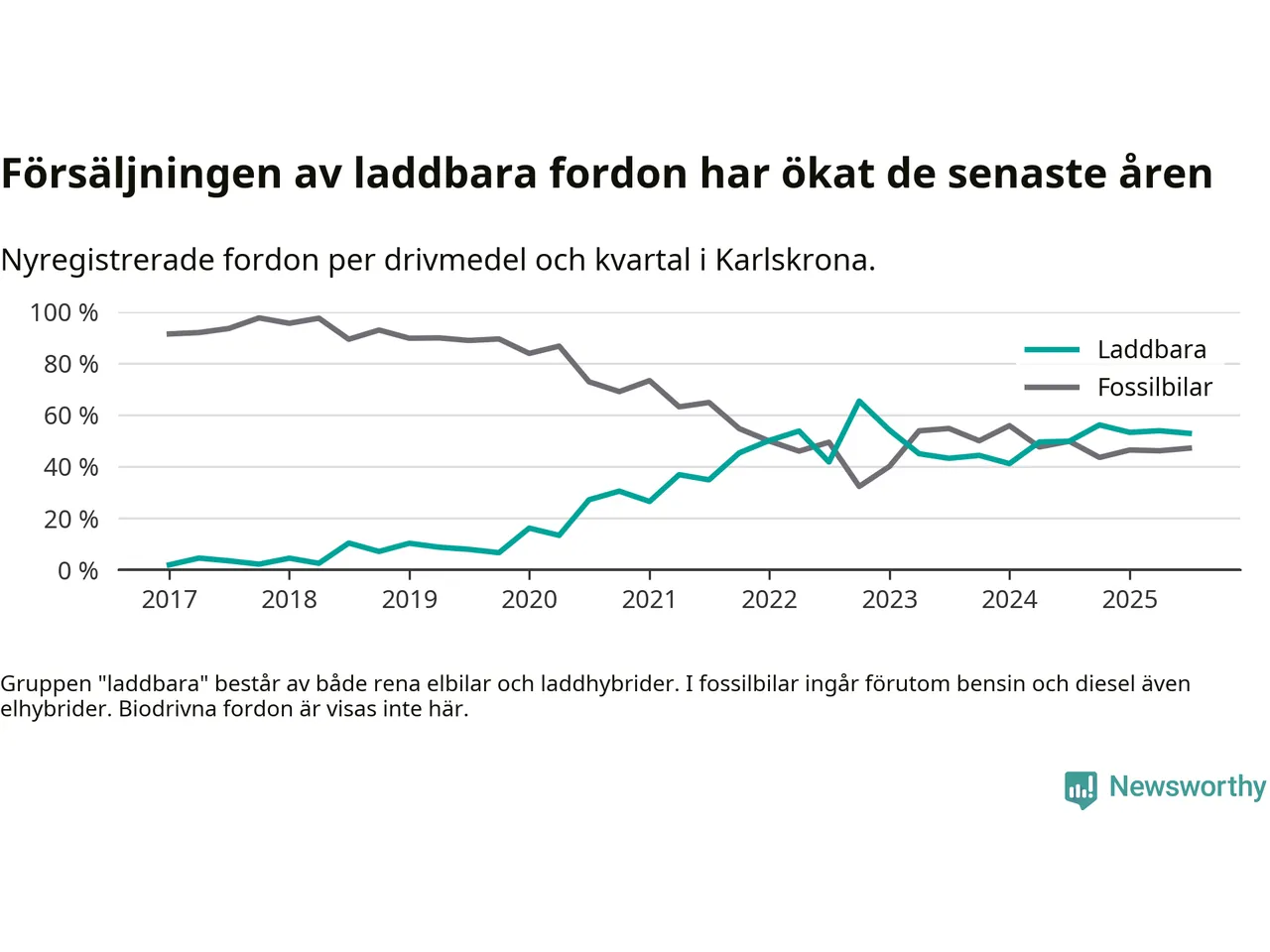 Under tredje kvartalet 2025 var 53 procent av alla nyregistrerade personbilar i Karlskrona laddbara (sammanlagt registrerades 348 nya bilar). Merparten av de laddbara bilarna var så kallade laddhybrider, det vill säga fordon som går att ladda och köra på el, men som även har en förbränningsmotor. 26 procent av alla nya bilar var rena elbilar.