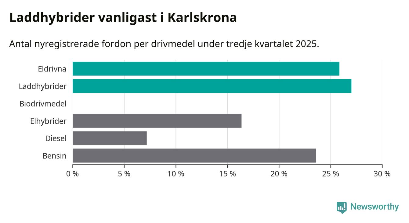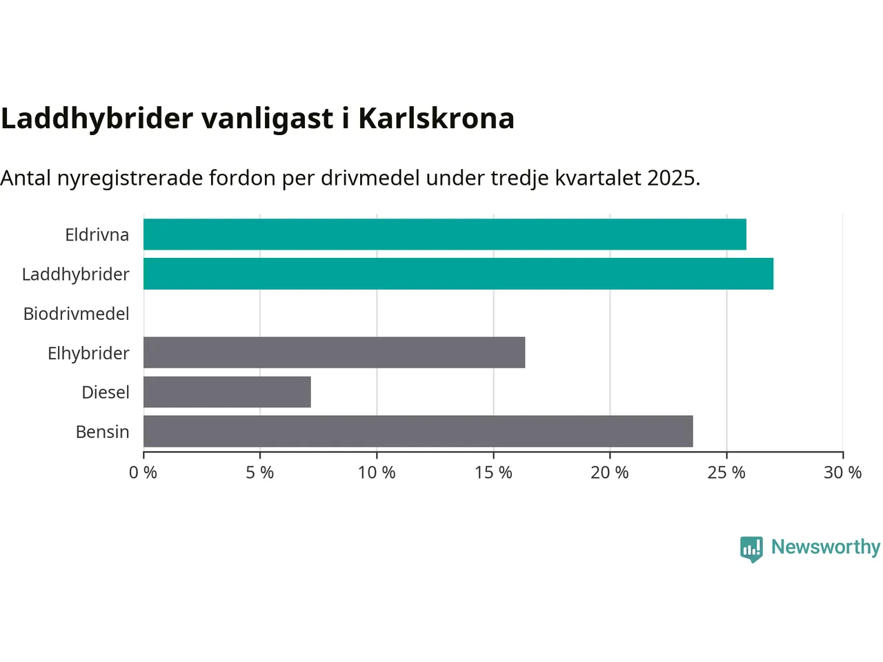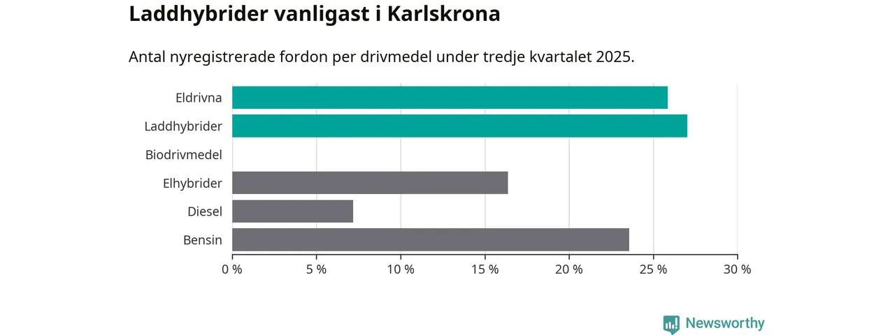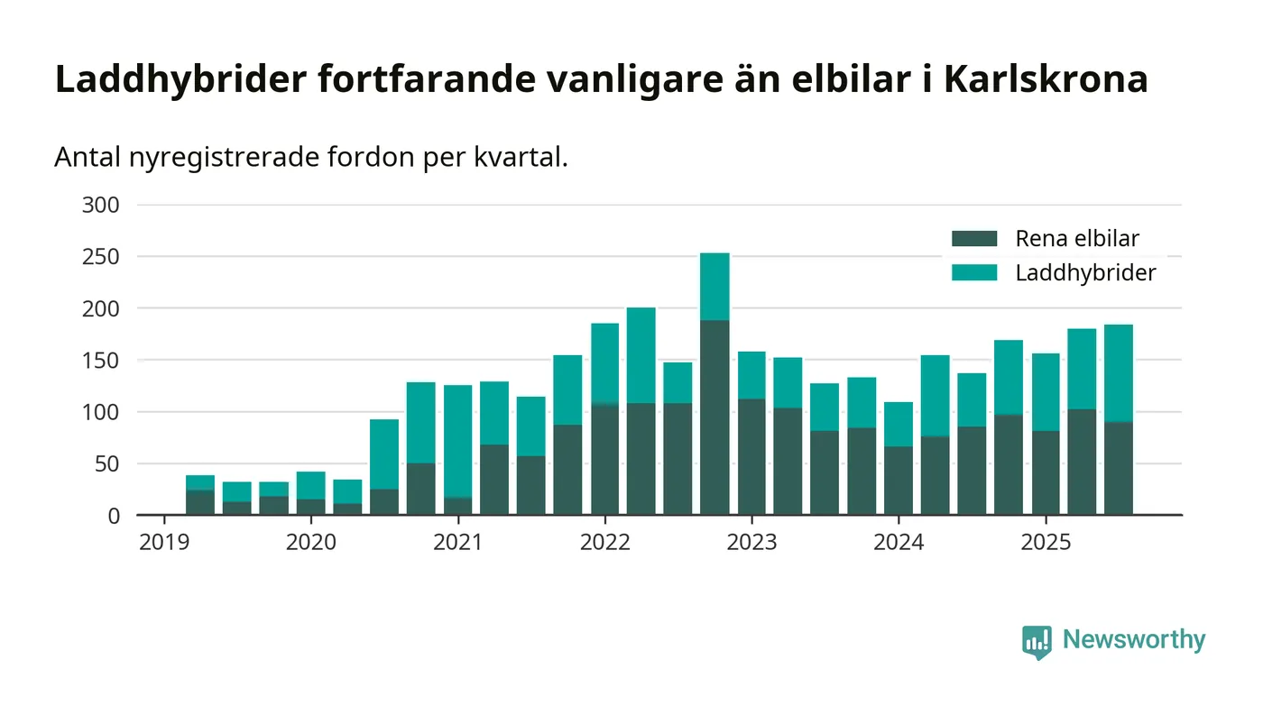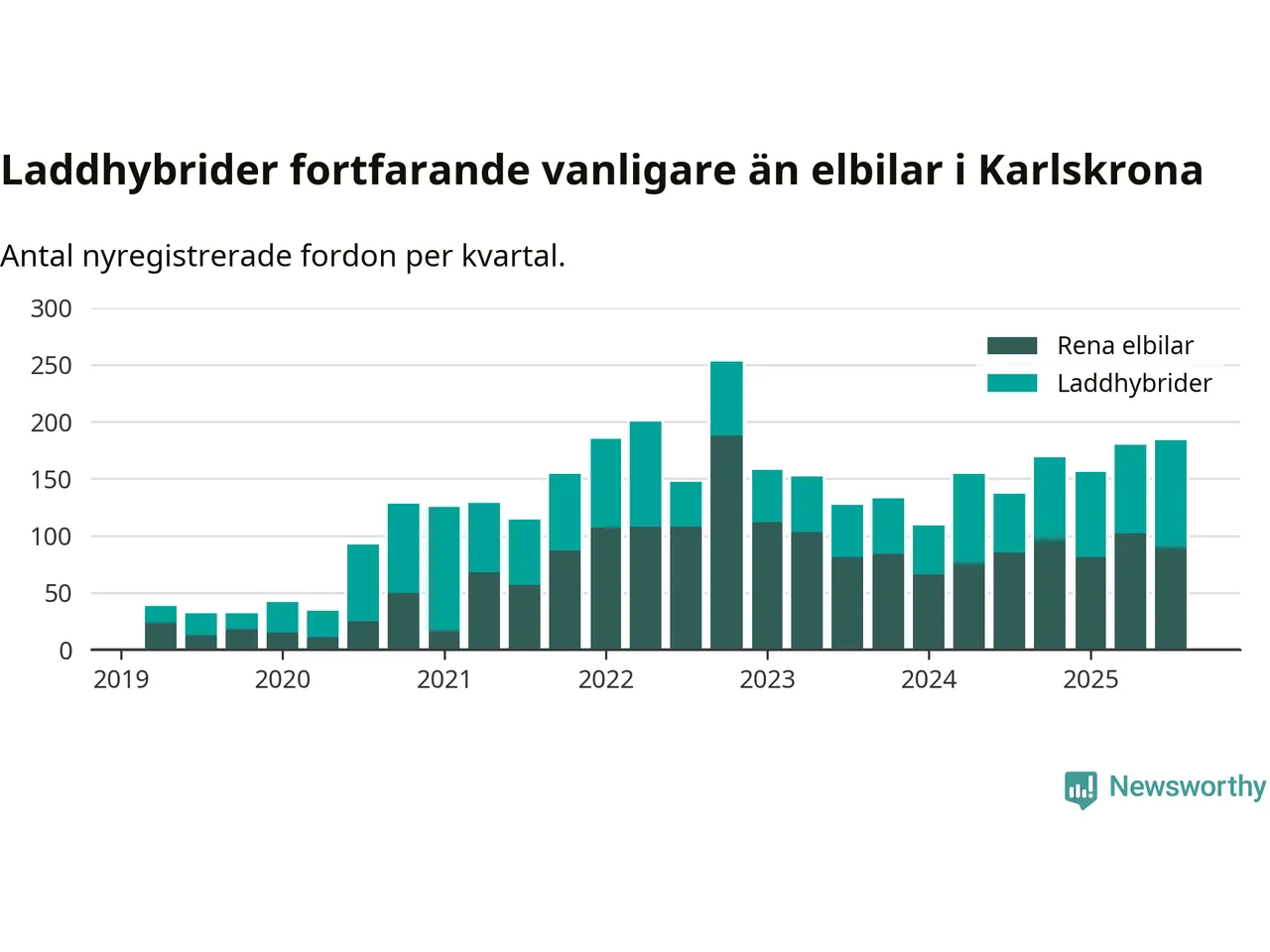 Under tredje kvartalet 2025 var 53 procent av alla nyregistrerade personbilar i Karlskrona laddbara (sammanlagt registrerades 348 nya bilar). Merparten av de laddbara bilarna var så kallade laddhybrider, det vill säga fordon som går att ladda och köra på el, men som även har en förbränningsmotor. 26 procent av alla nya bilar var rena elbilar.