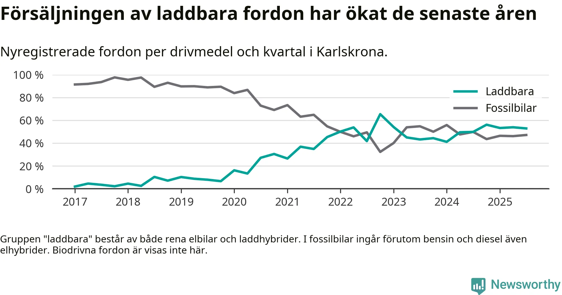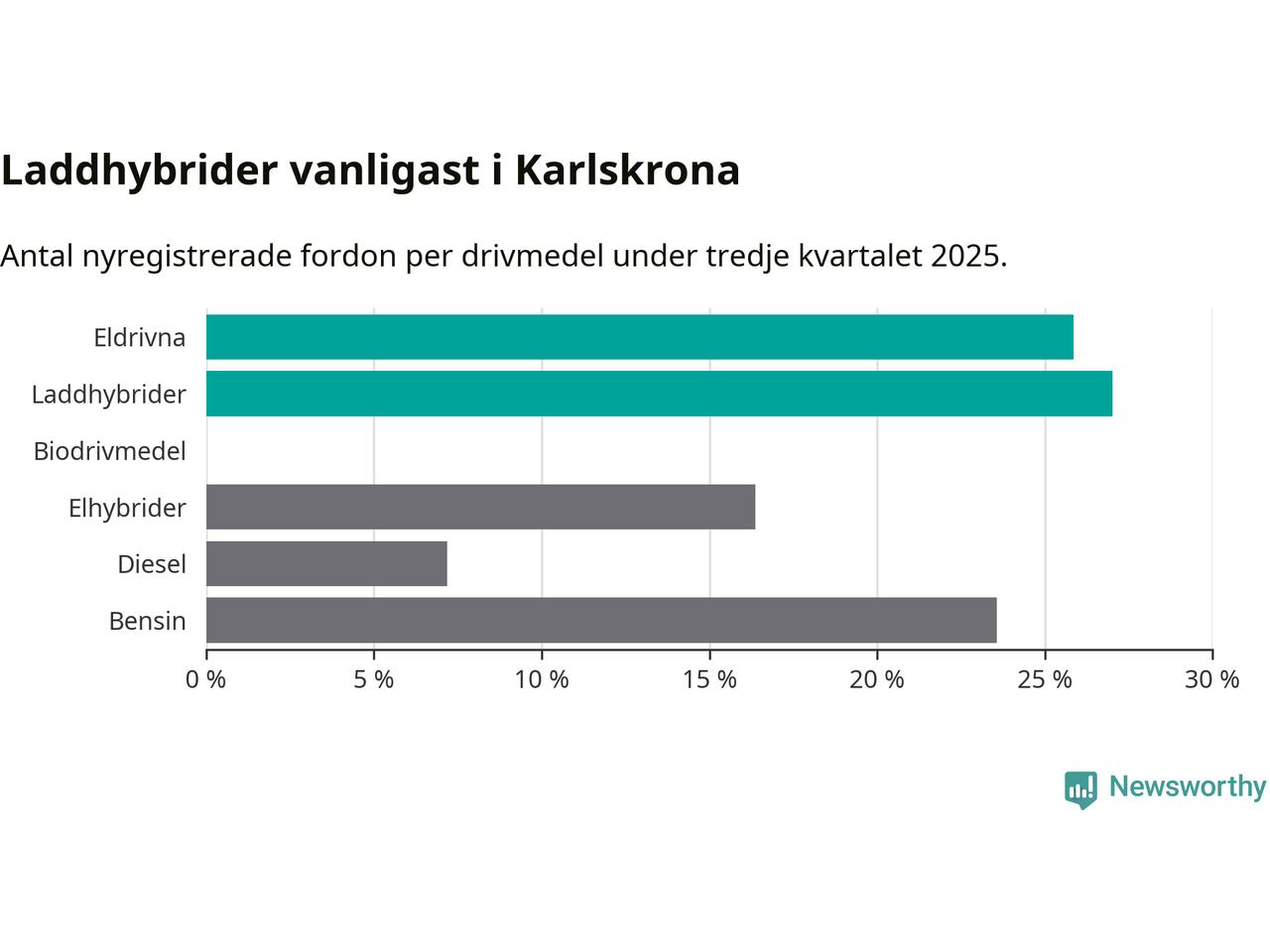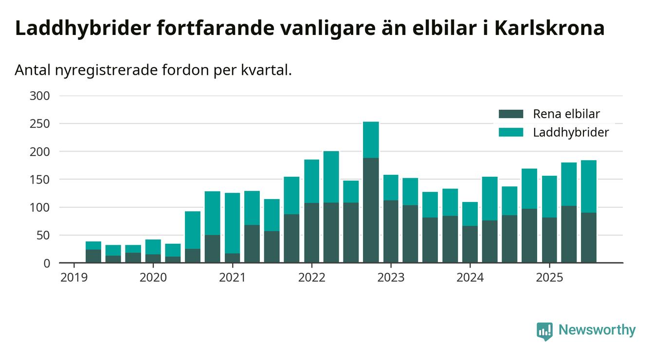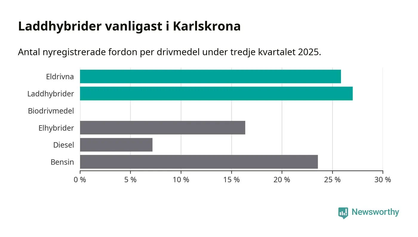 Under tredje kvartalet 2025 var 53 procent av alla nyregistrerade personbilar i Karlskrona laddbara (sammanlagt registrerades 348 nya bilar). Merparten av de laddbara bilarna var så kallade laddhybrider, det vill säga fordon som går att ladda och köra på el, men som även har en förbränningsmotor. 26 procent av alla nya bilar var rena elbilar.