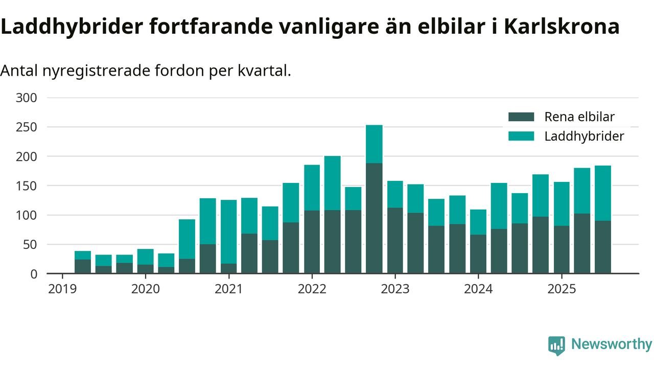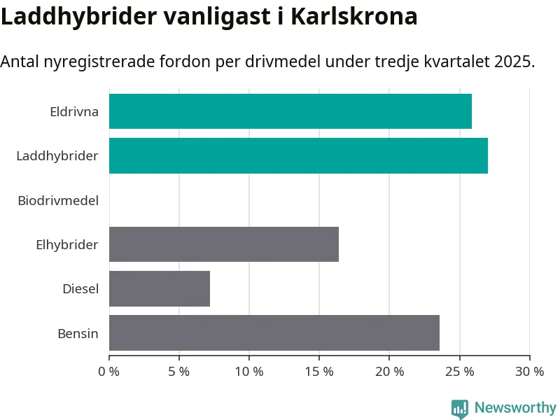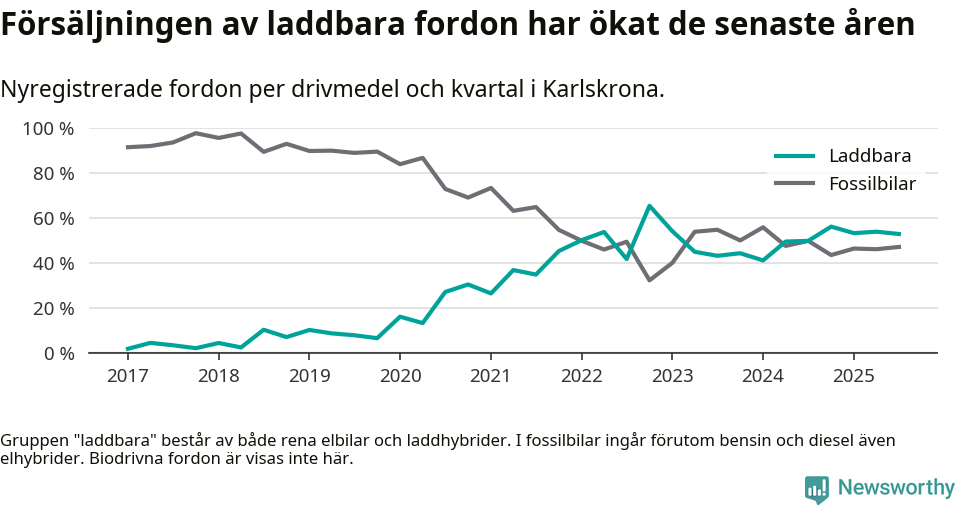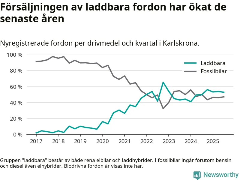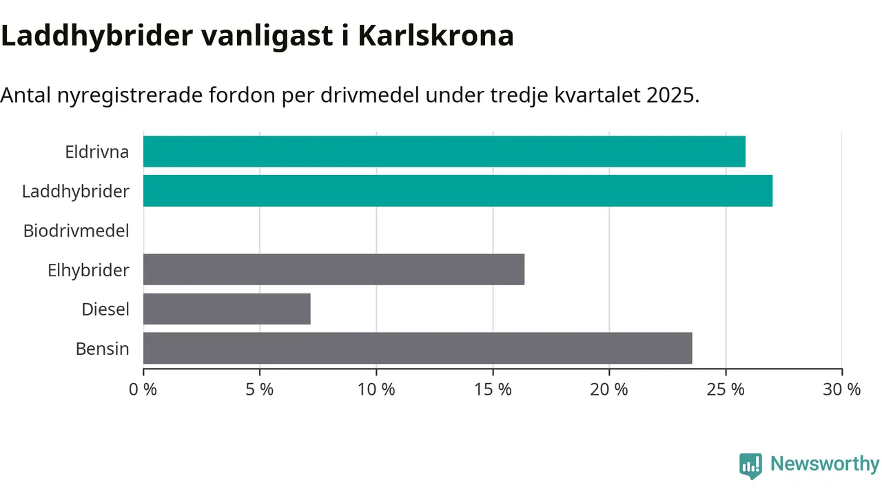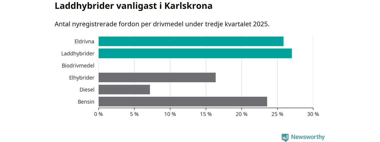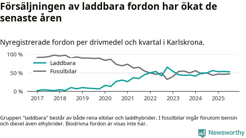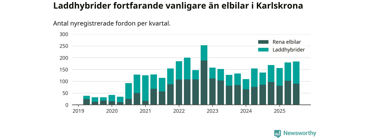 Under tredje kvartalet 2025 var 53 procent av alla nyregistrerade personbilar i Karlskrona laddbara (sammanlagt registrerades 348 nya bilar). Merparten av de laddbara bilarna var så kallade laddhybrider, det vill säga fordon som går att ladda och köra på el, men som även har en förbränningsmotor. 26 procent av alla nya bilar var rena elbilar.