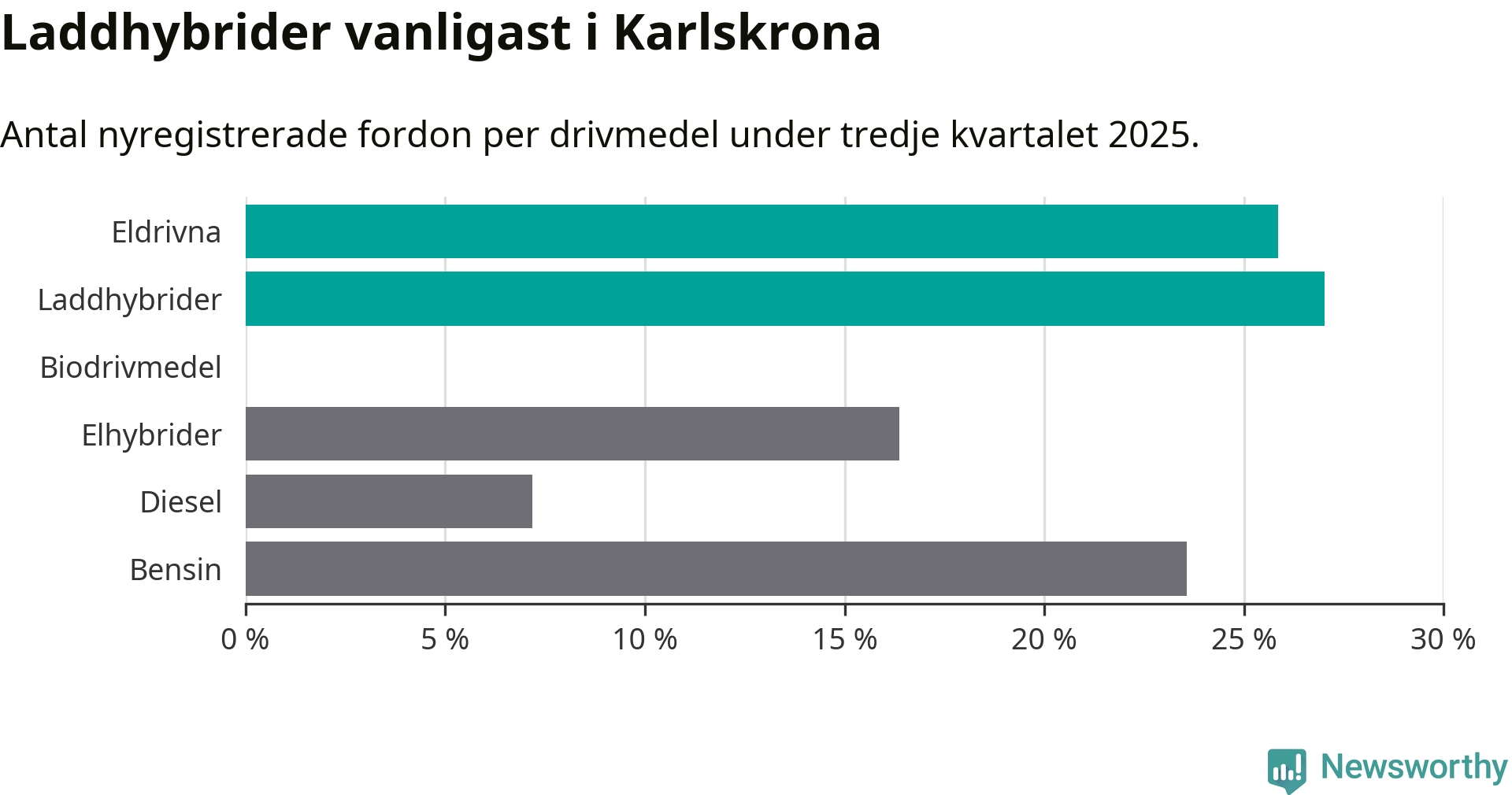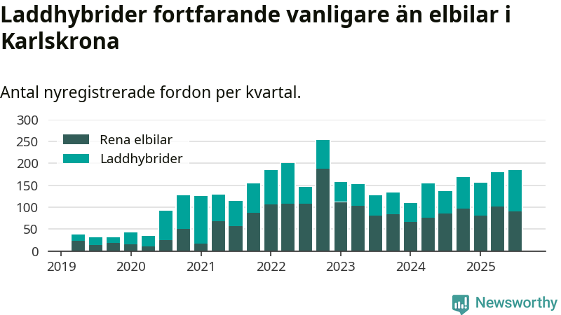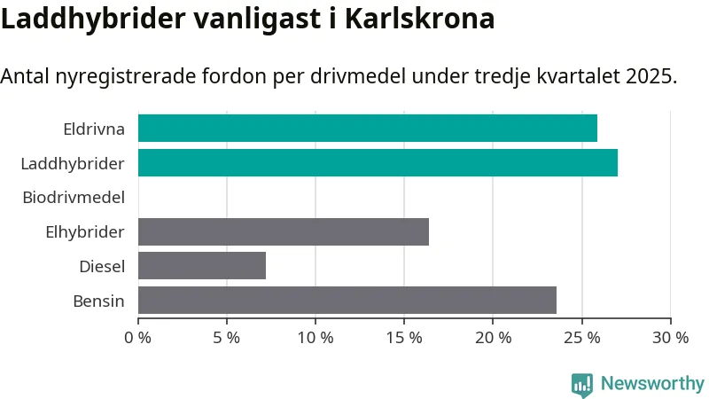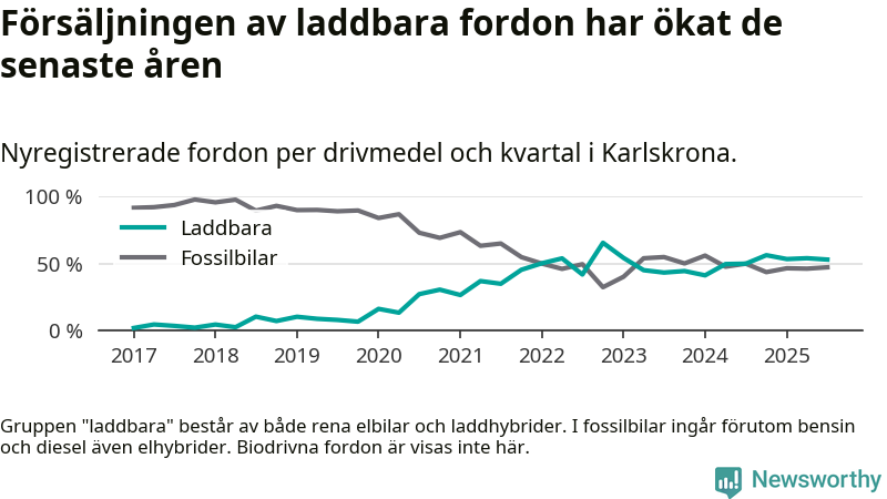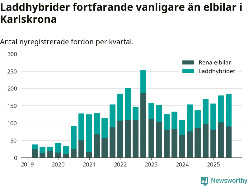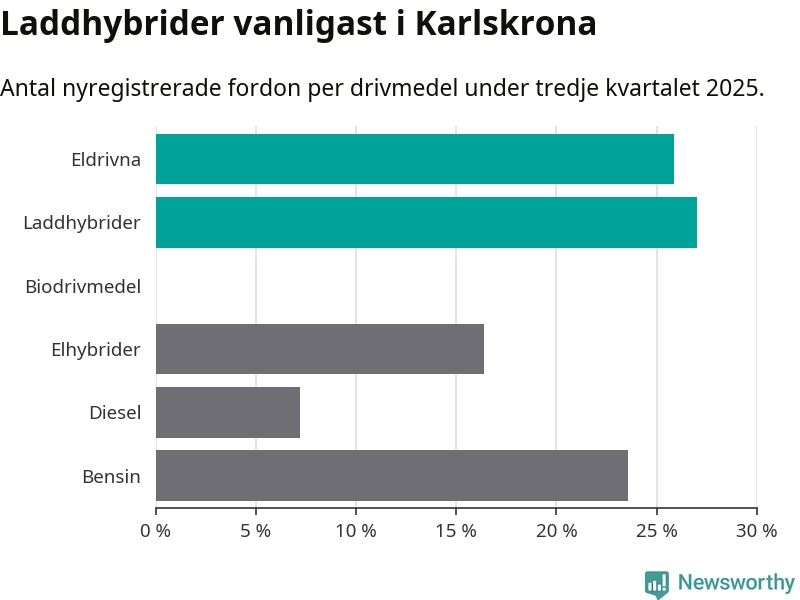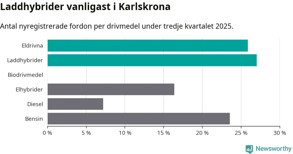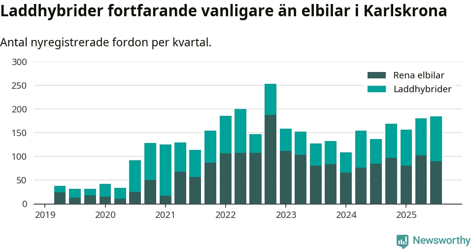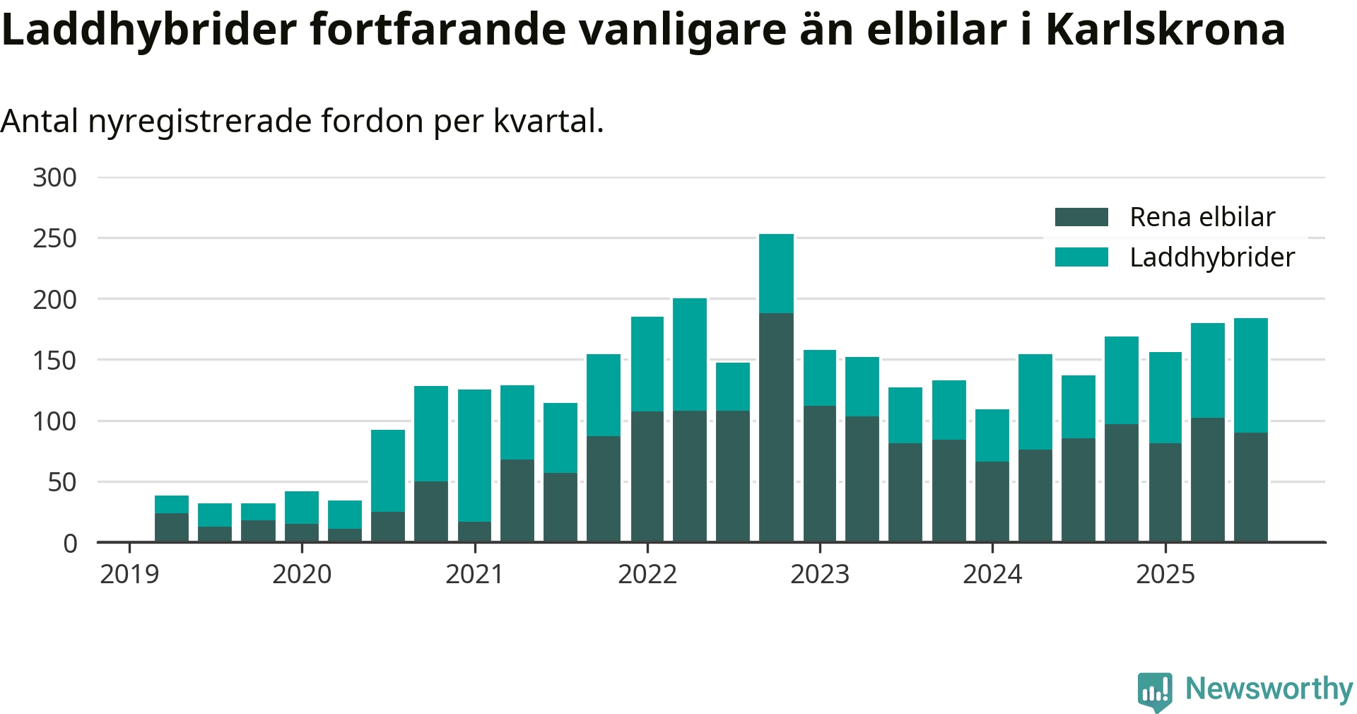 Under tredje kvartalet 2025 var 53 procent av alla nyregistrerade personbilar i Karlskrona laddbara (sammanlagt registrerades 348 nya bilar). Merparten av de laddbara bilarna var så kallade laddhybrider, det vill säga fordon som går att ladda och köra på el, men som även har en förbränningsmotor. 26 procent av alla nya bilar var rena elbilar.