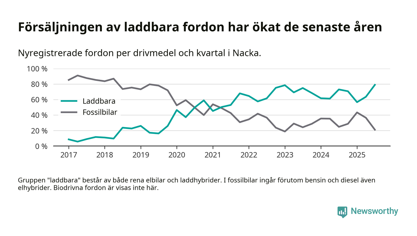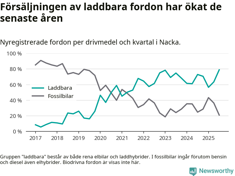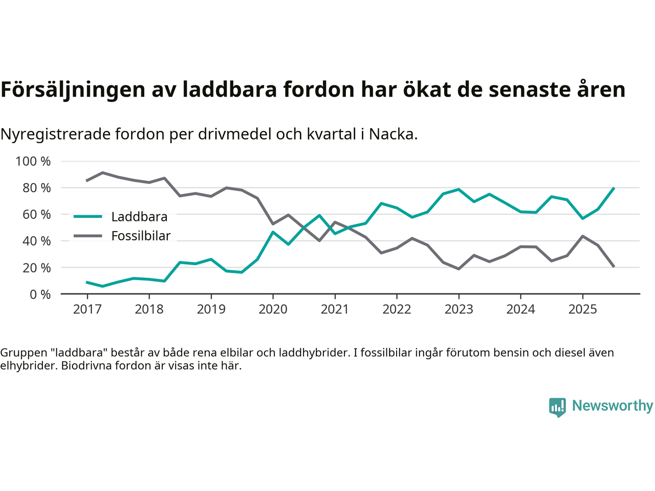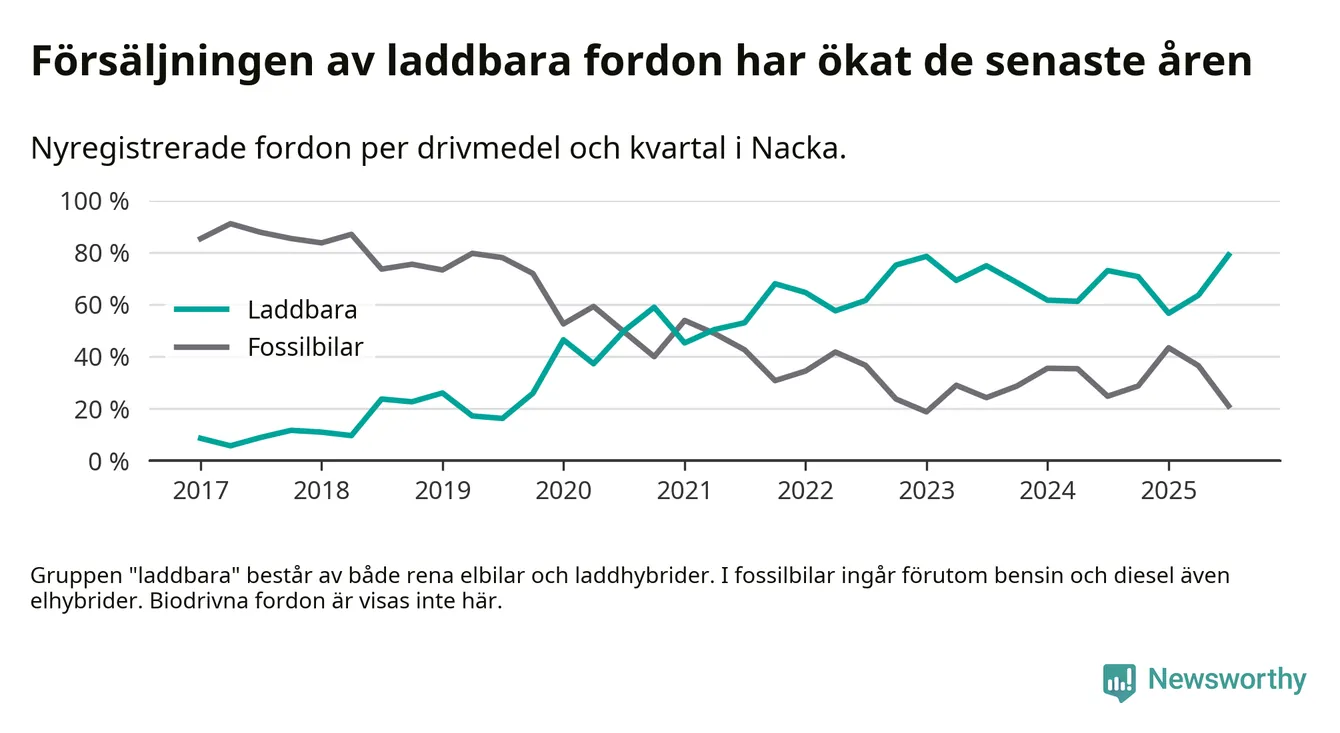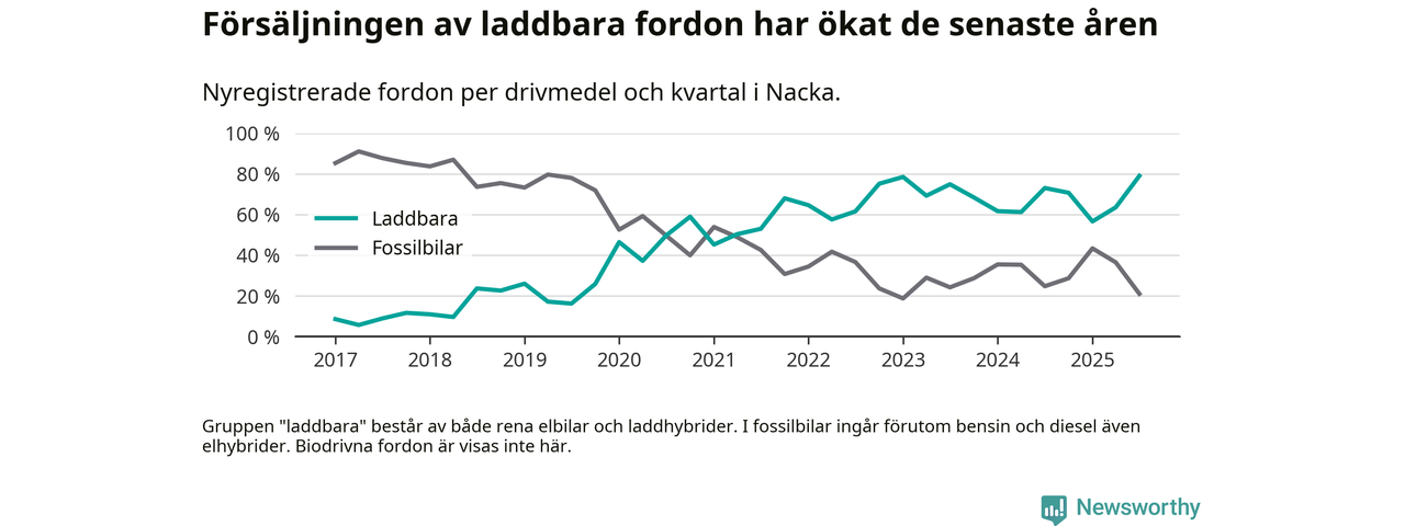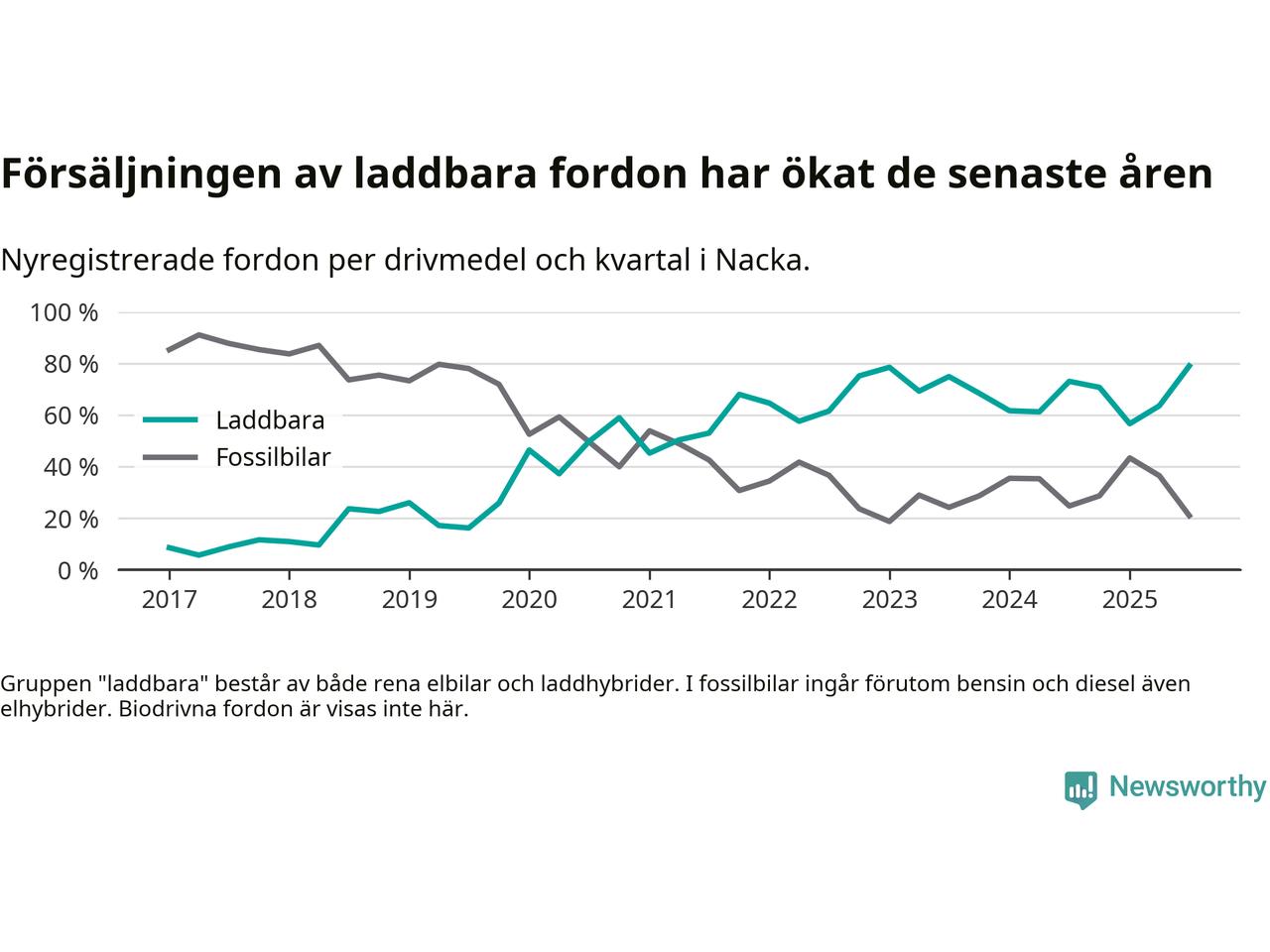 Under tredje kvartalet 2025 var 79 procent av alla nyregistrerade personbilar i Nacka laddbara (sammanlagt registrerades 1 271 nya bilar). Merparten av de laddbara bilarna var rena elbilar (47 procent av alla).